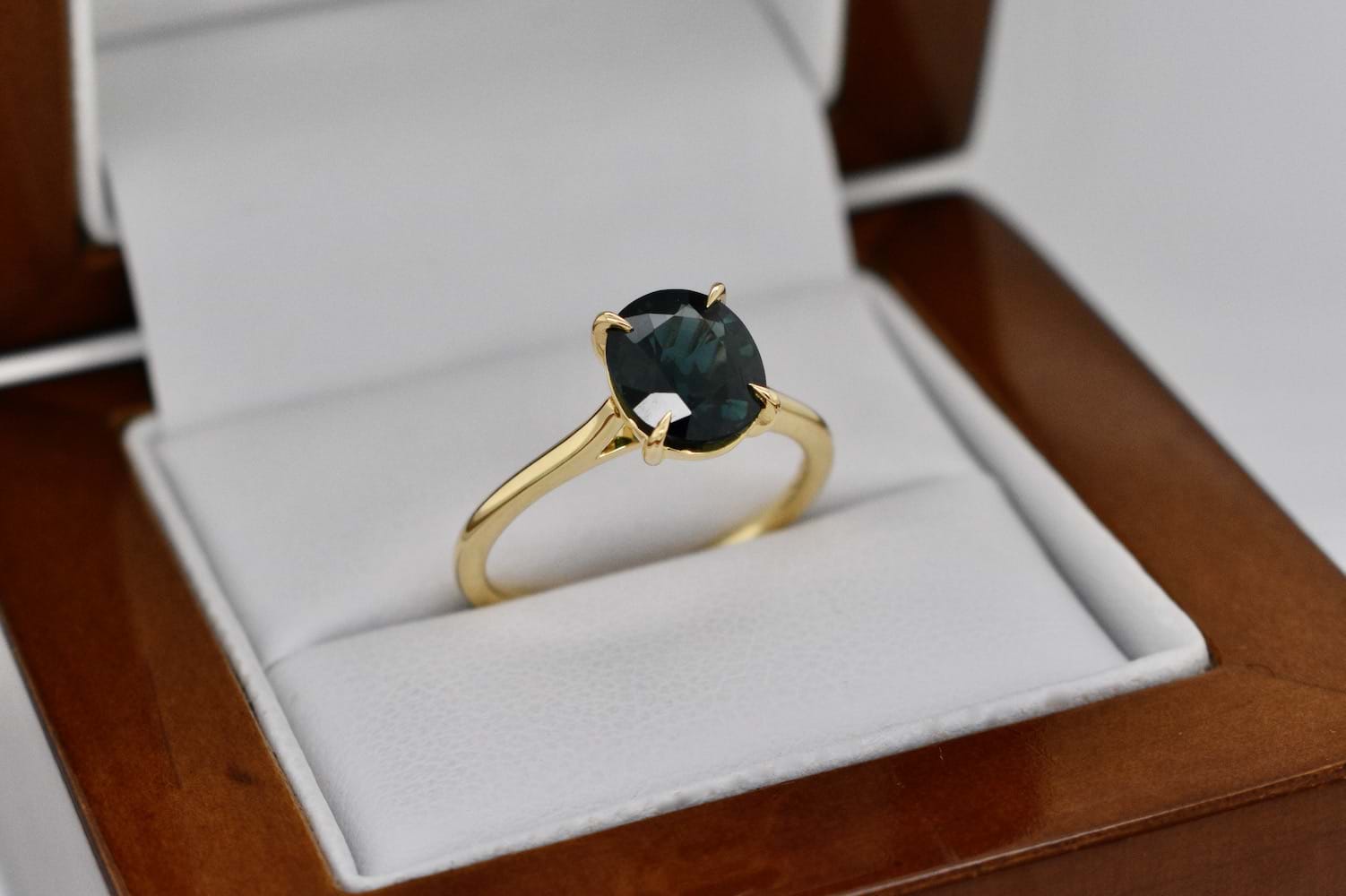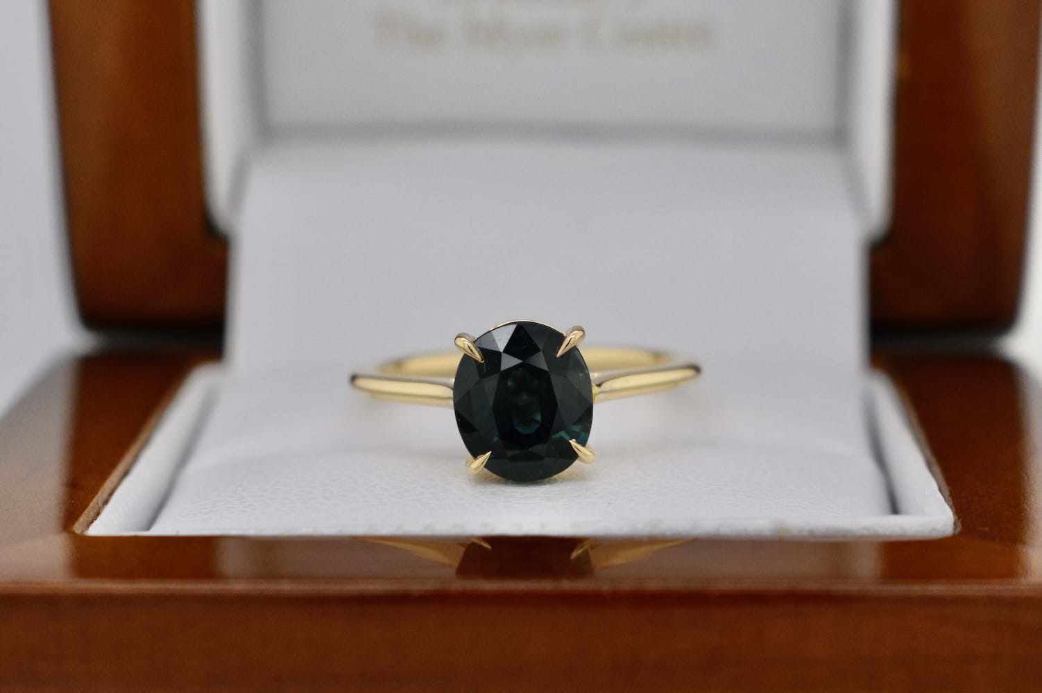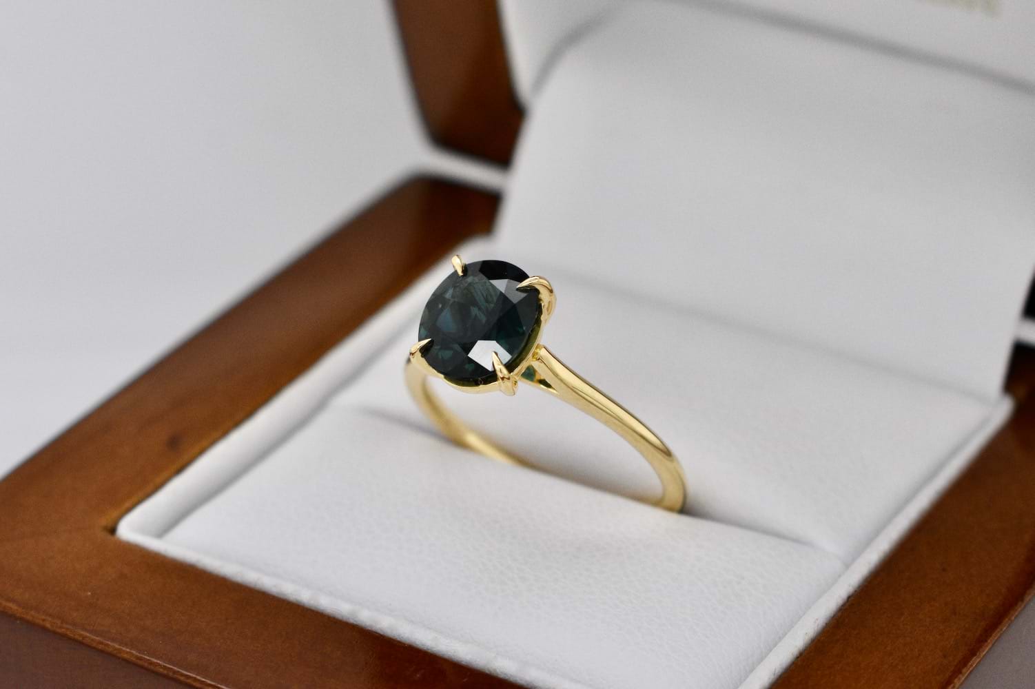 This dark green blue Australian sapphire is 1.85cts and has been set into this super fine and stylish 18ct yellow gold four claw solitaire ring design. Perfect as an engagement ring or stackable dress ring. Finger size L. Independent Valuation Supplied