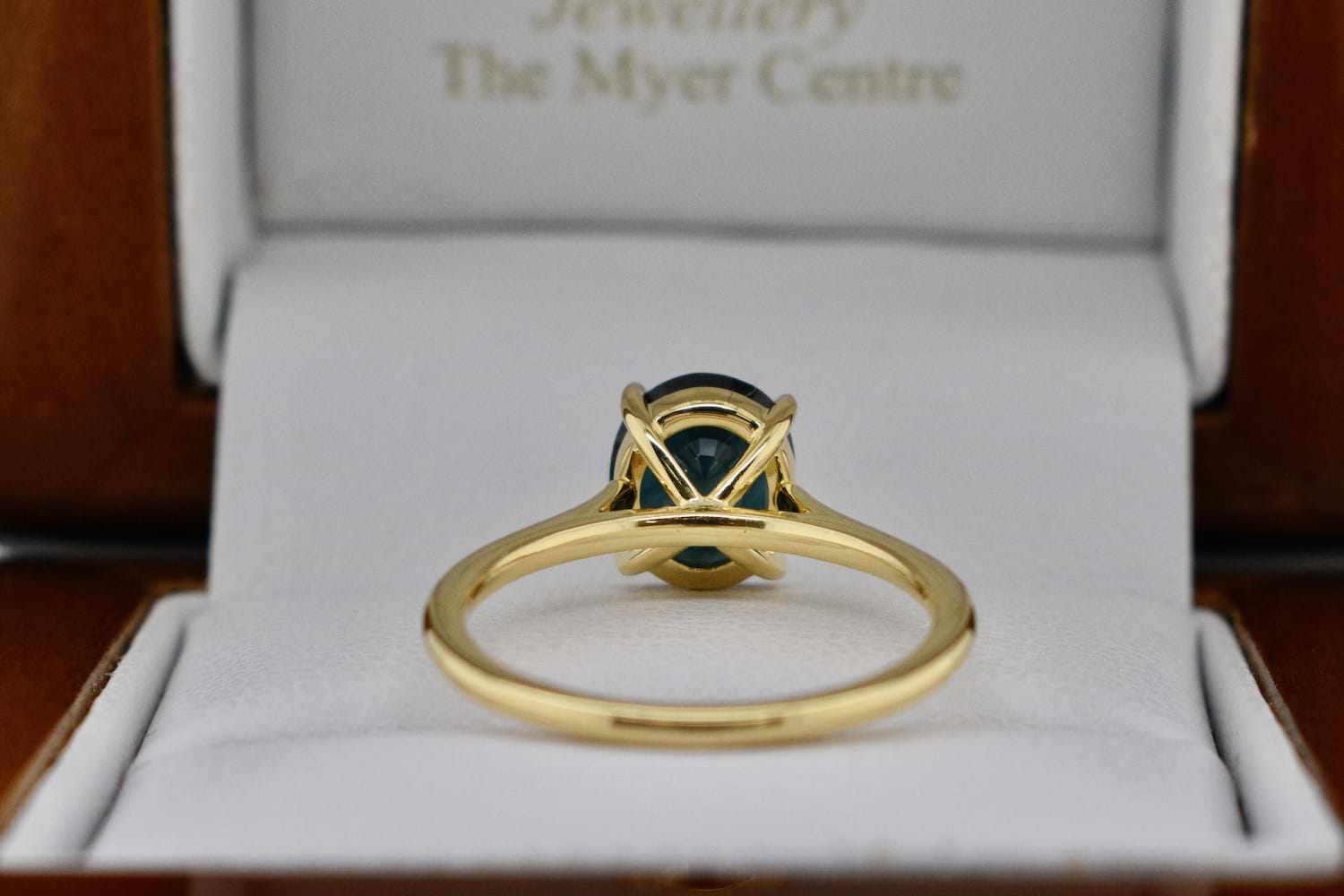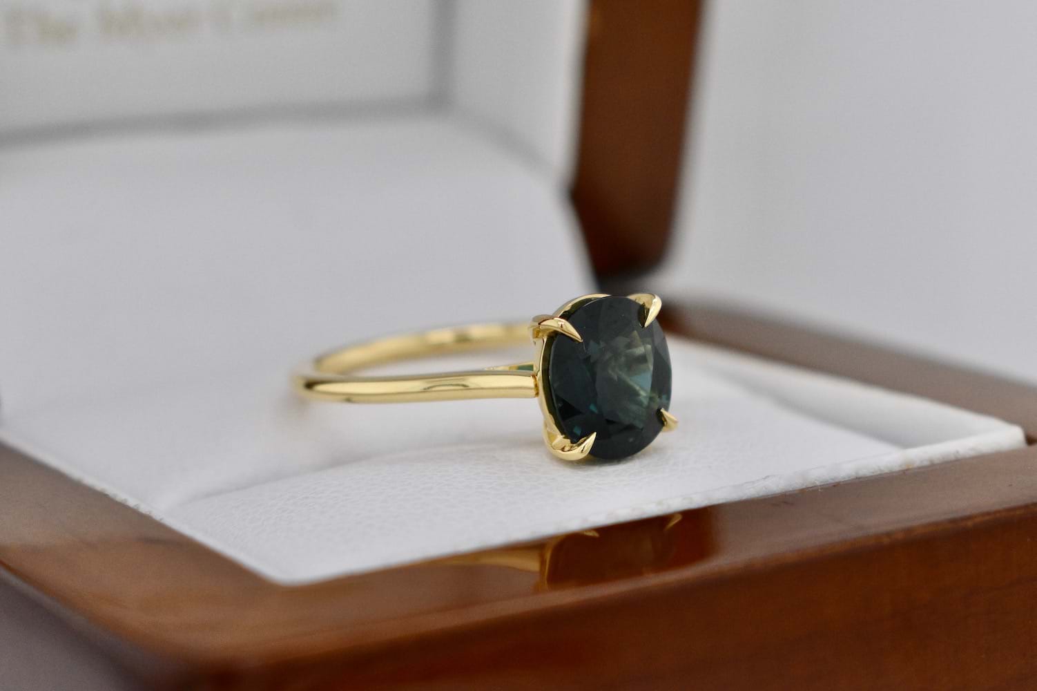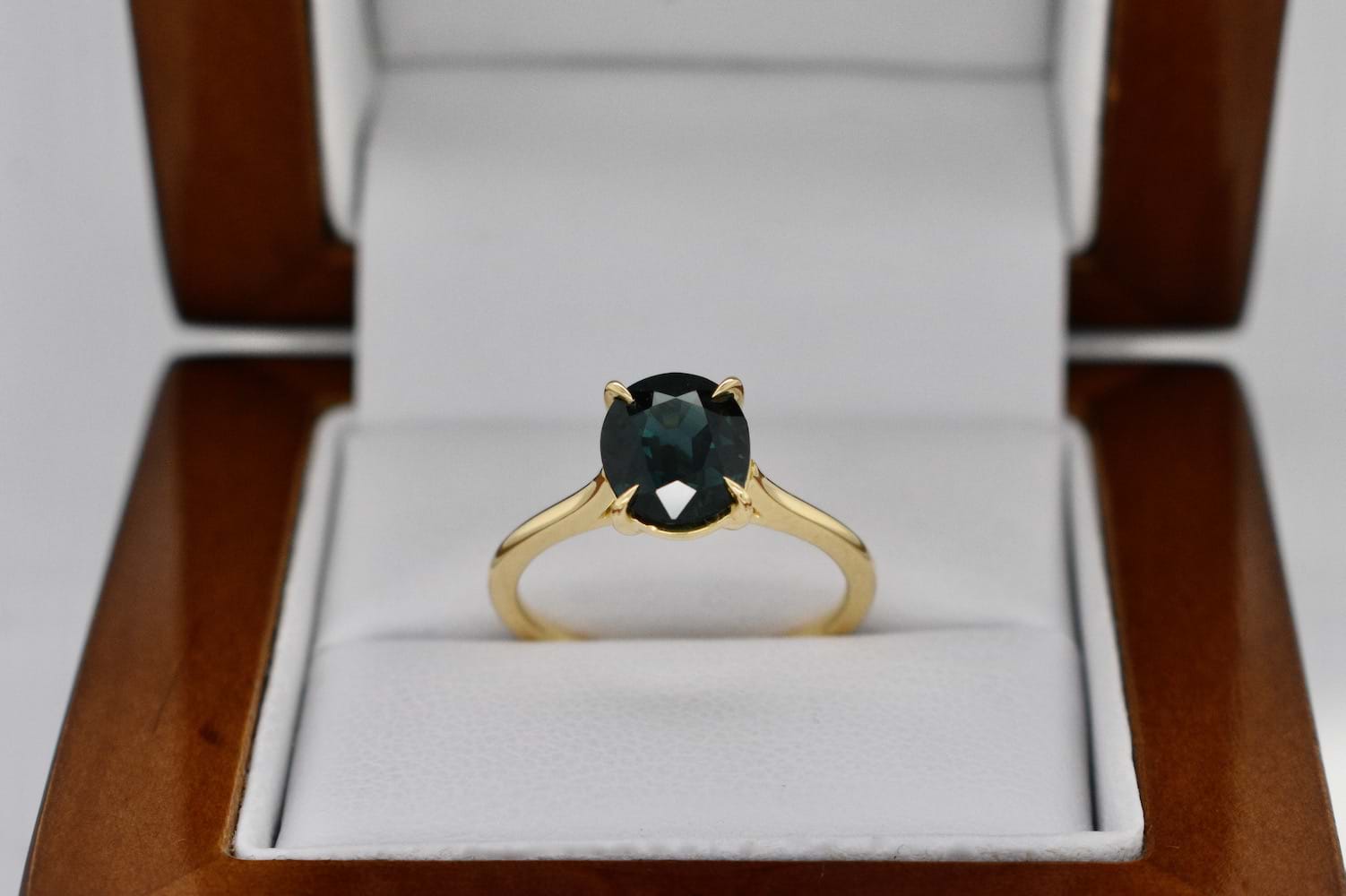 This dark green blue Australian sapphire is 1.85cts and has been set into this super fine and stylish 18ct yellow gold four claw solitaire ring design. Perfect as an engagement ring or stackable dress ring. Finger size L. Independent Valuation Supplied
