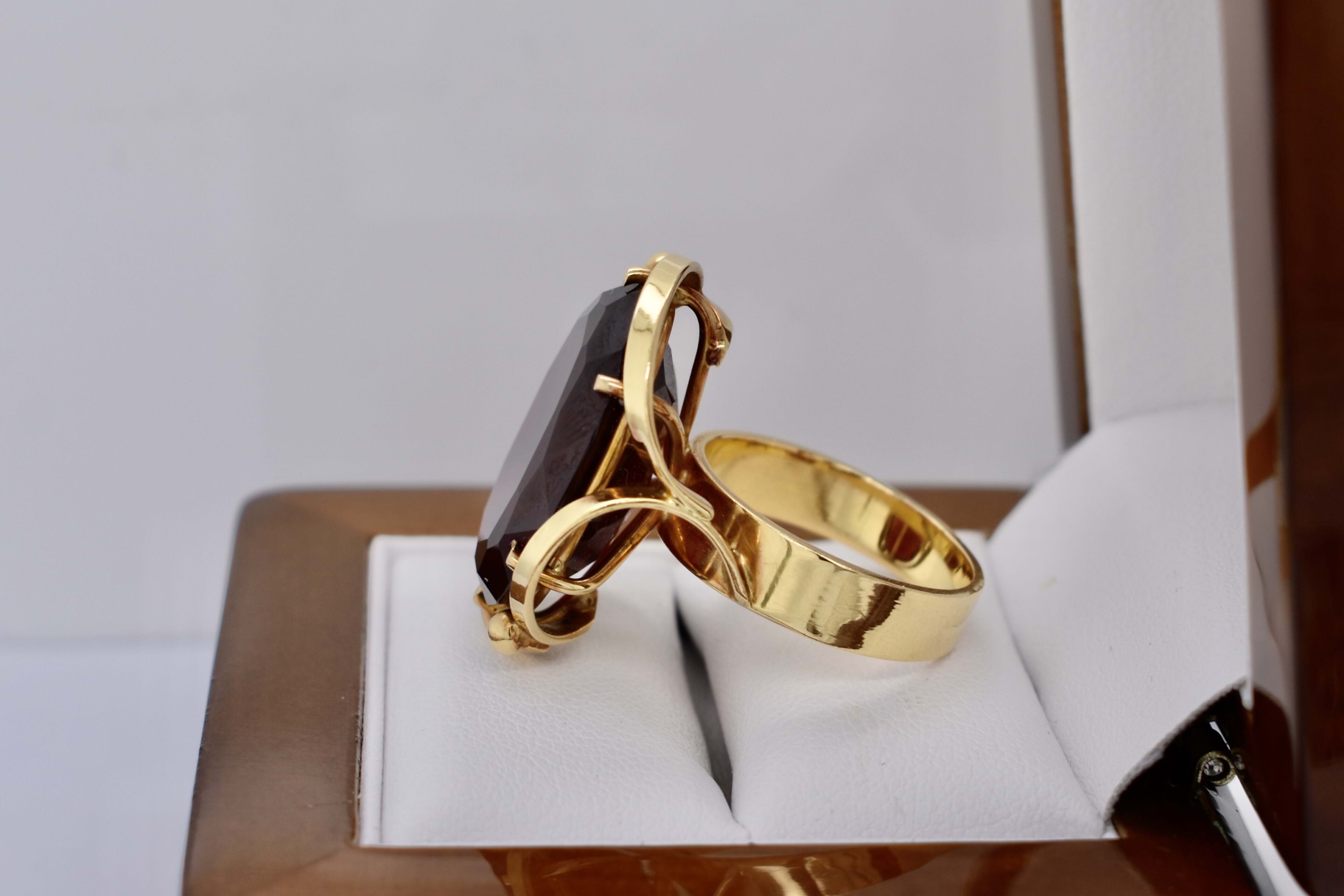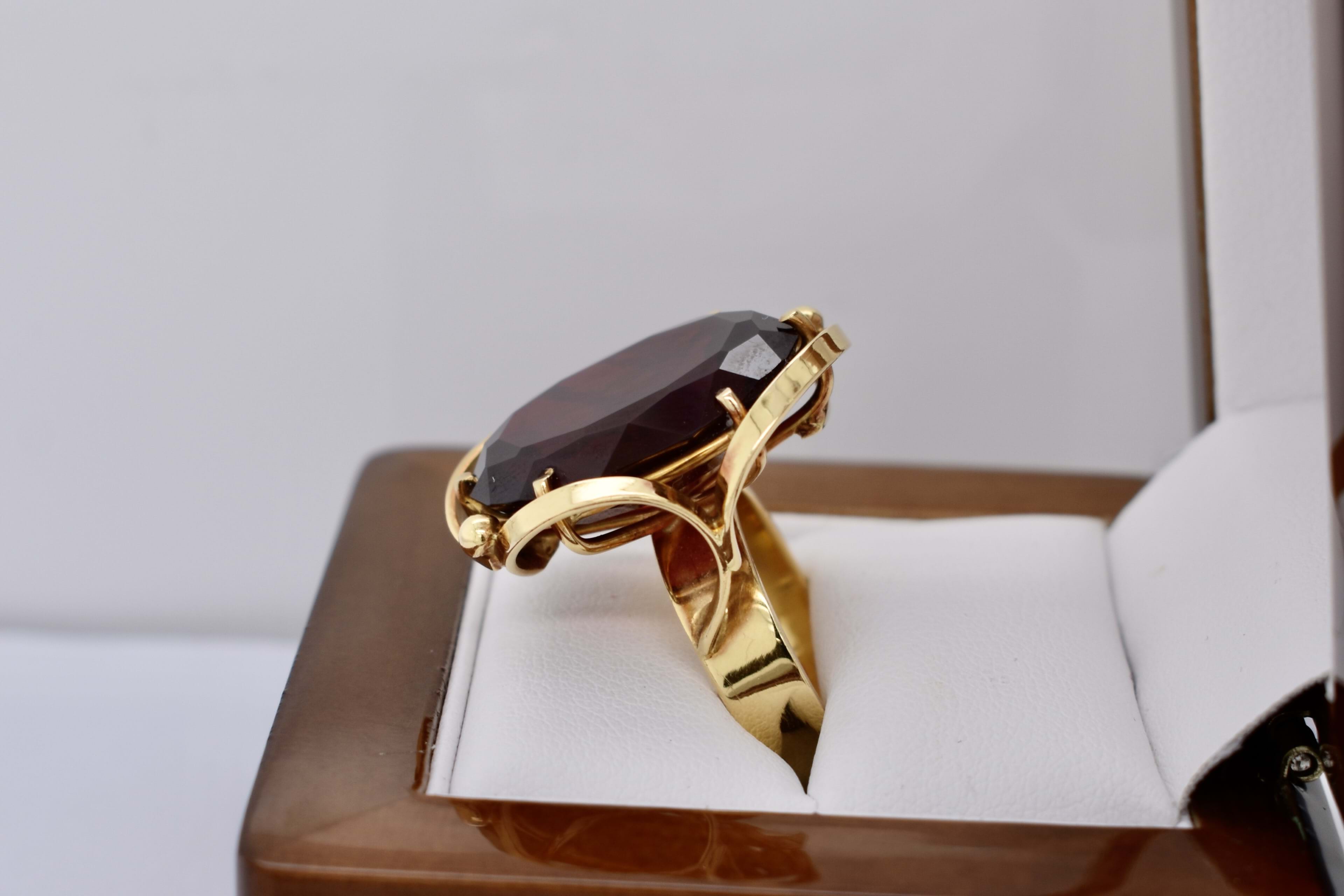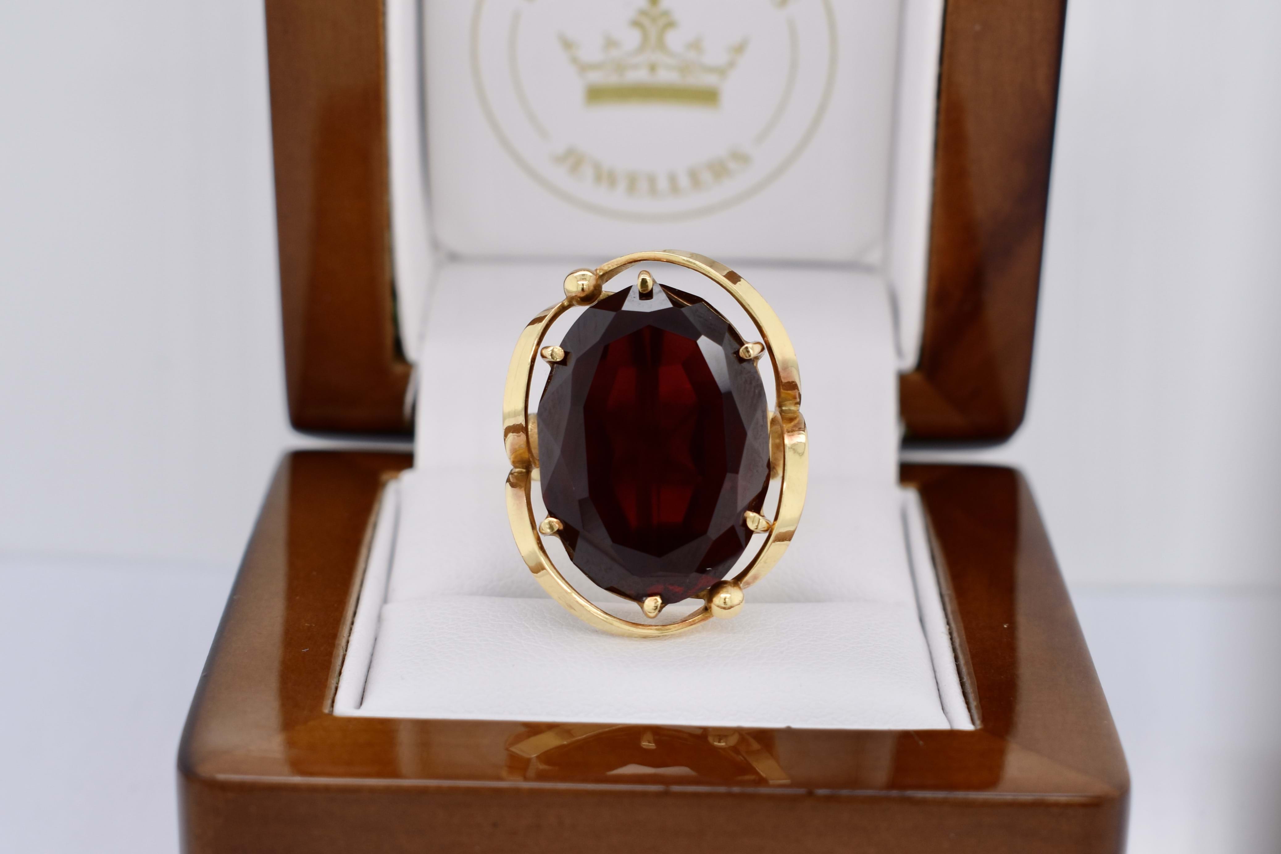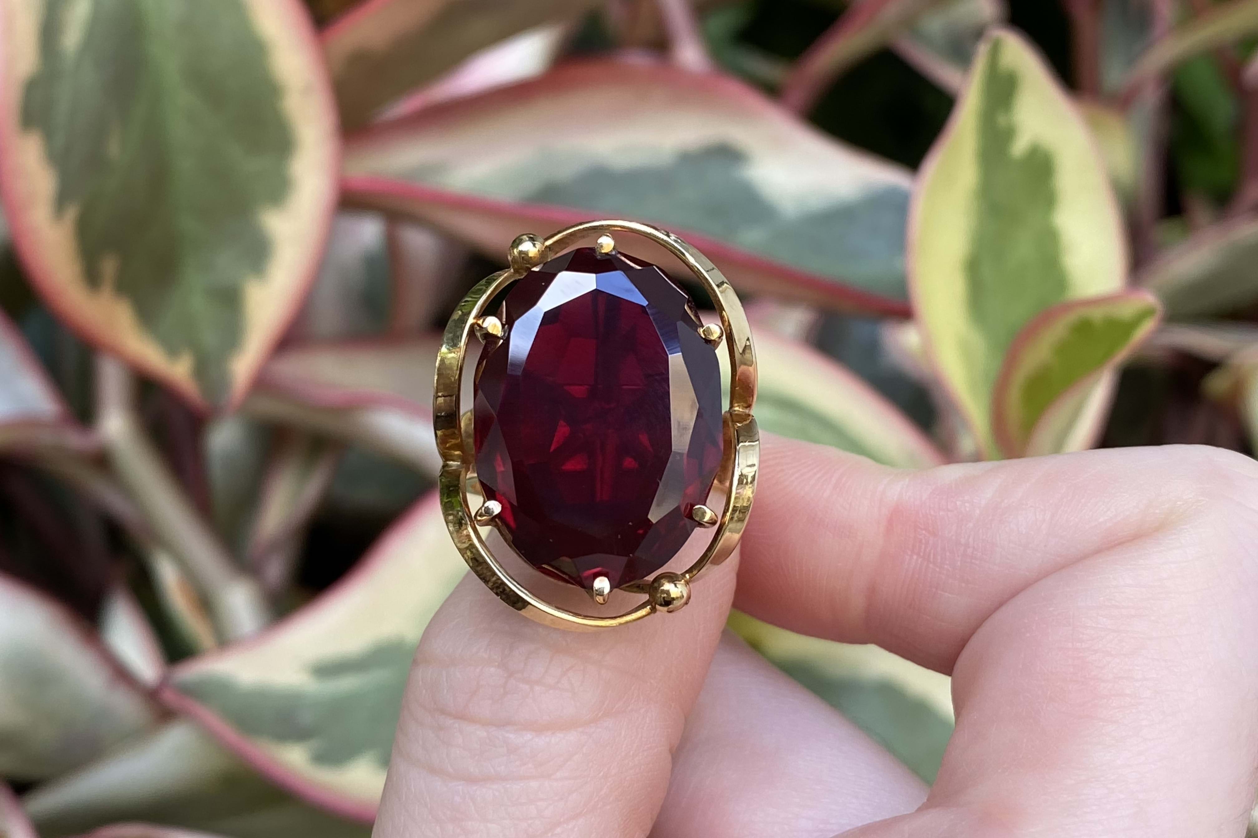 This amazing large ruby ring is handmade in 18ct yellow gold and features a large oval 22x16mm synthetic dark red ruby. Eye clean and well cut. The ruby is six claw set with a swirl/ribbon border surrounding the stone, with a flat tapering band that measures 5.2-4.2mm wide. Finger size P. Independent Valuation Supplied.