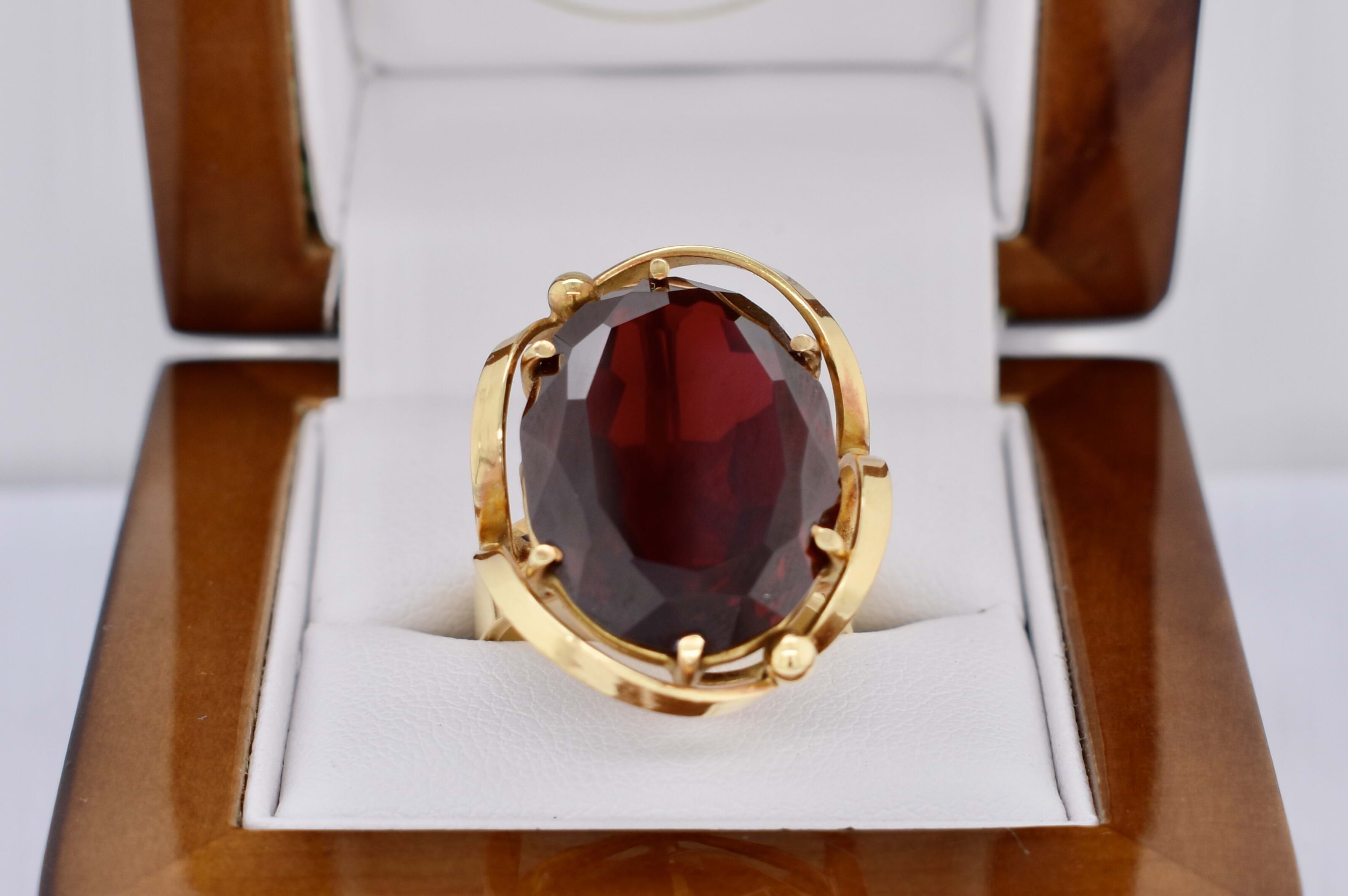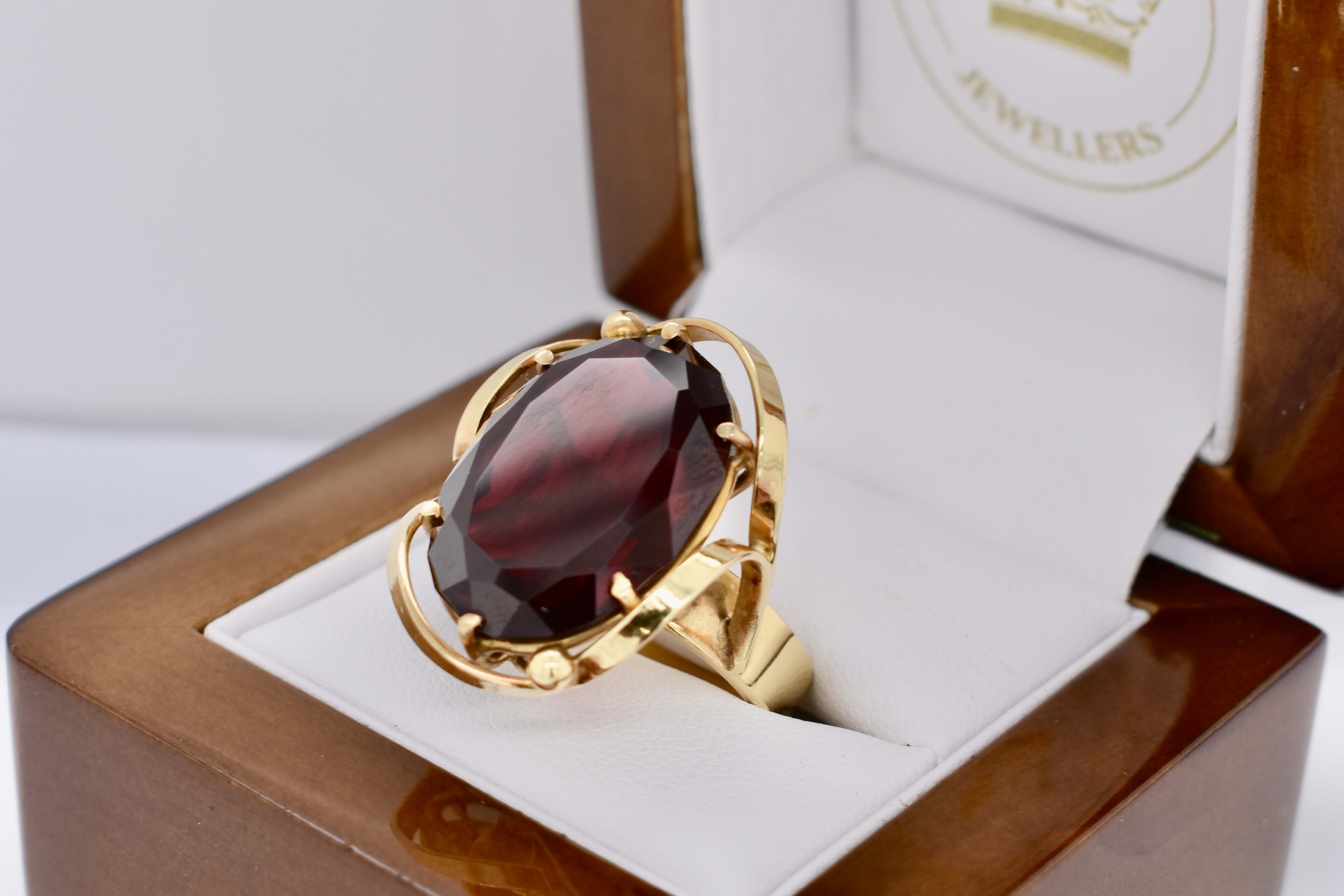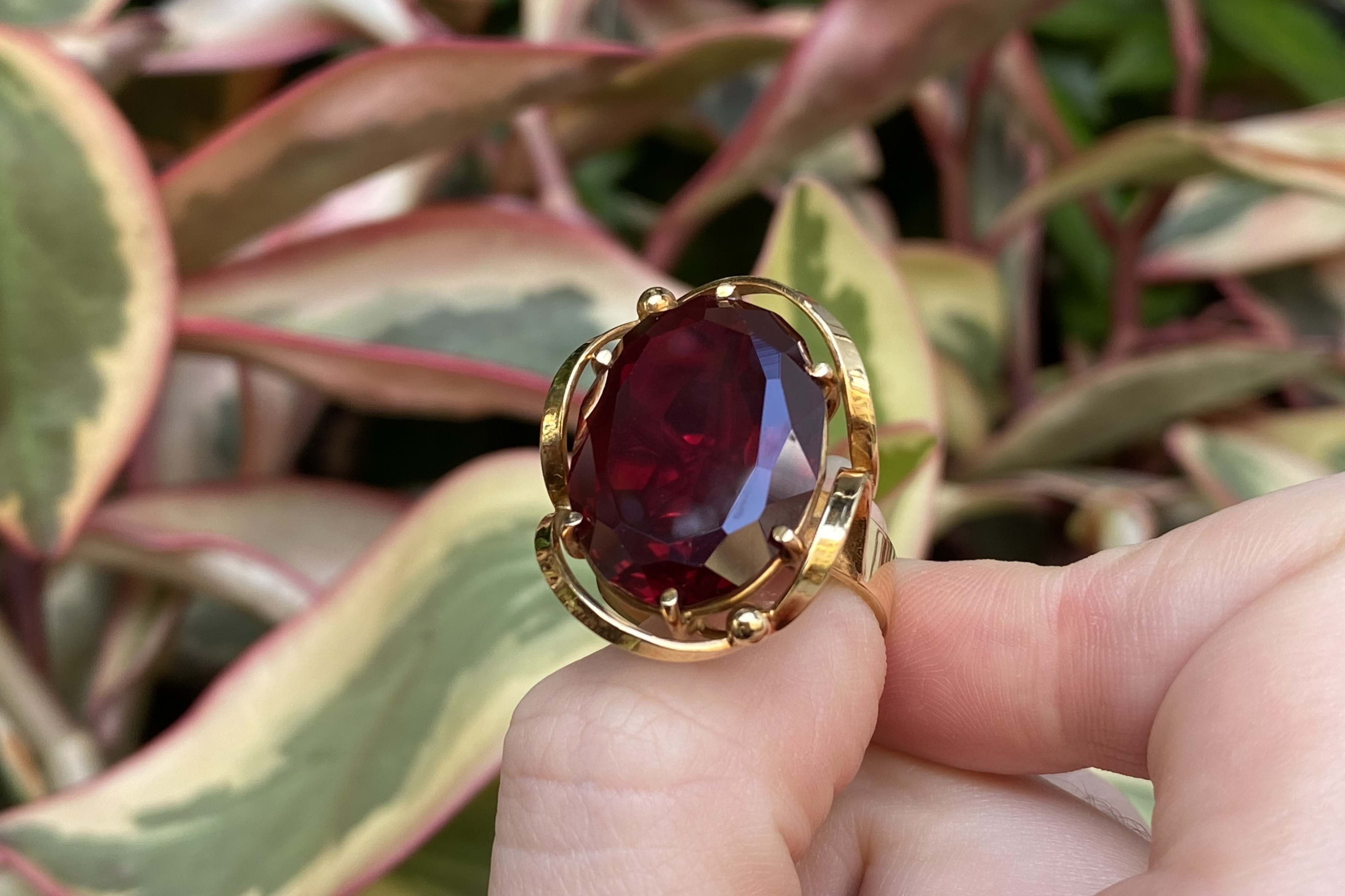 SOLD 18ct Yellow Gold Large Synthetic Ruby Oval Swirl Border Ring (P)