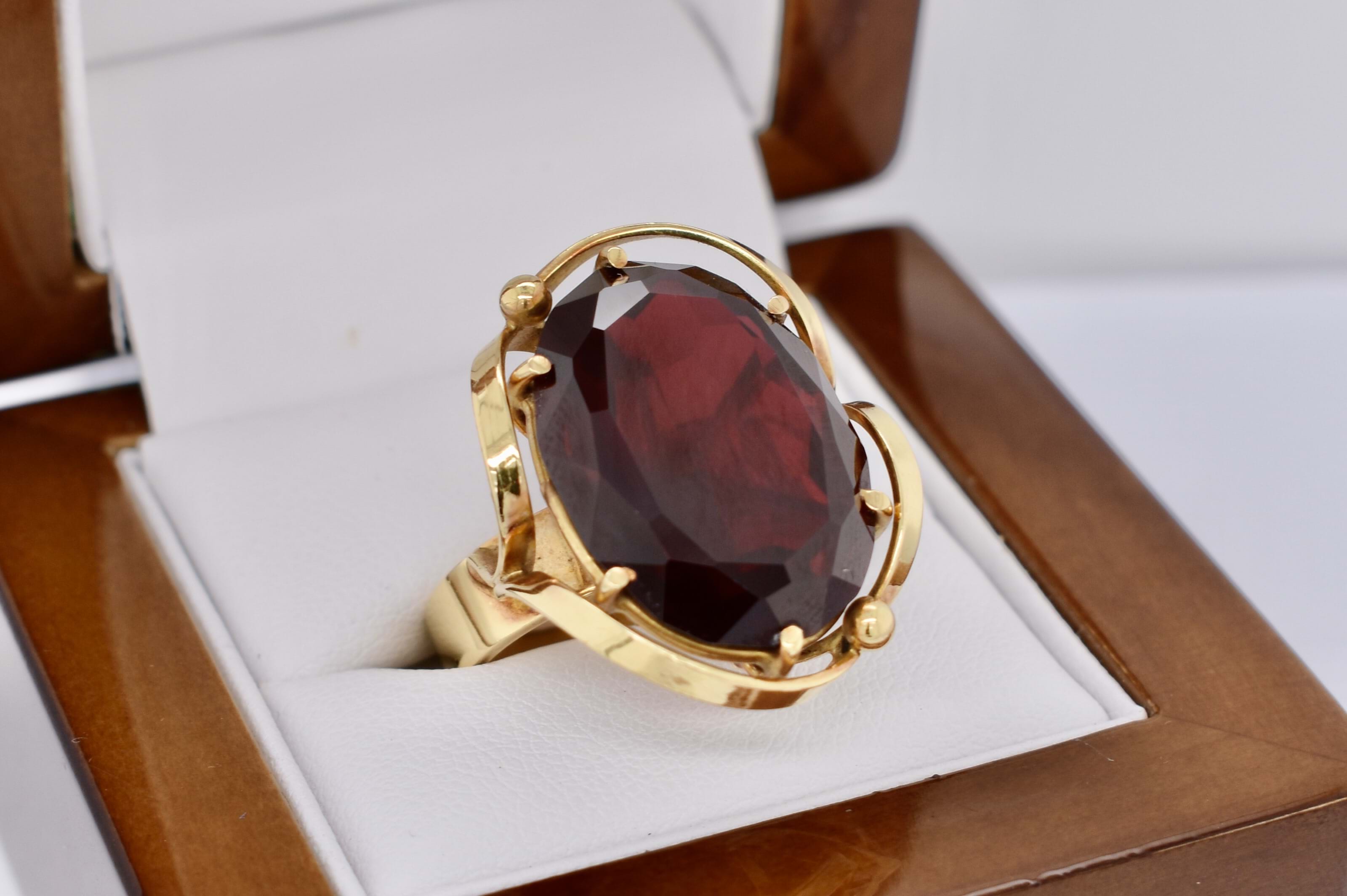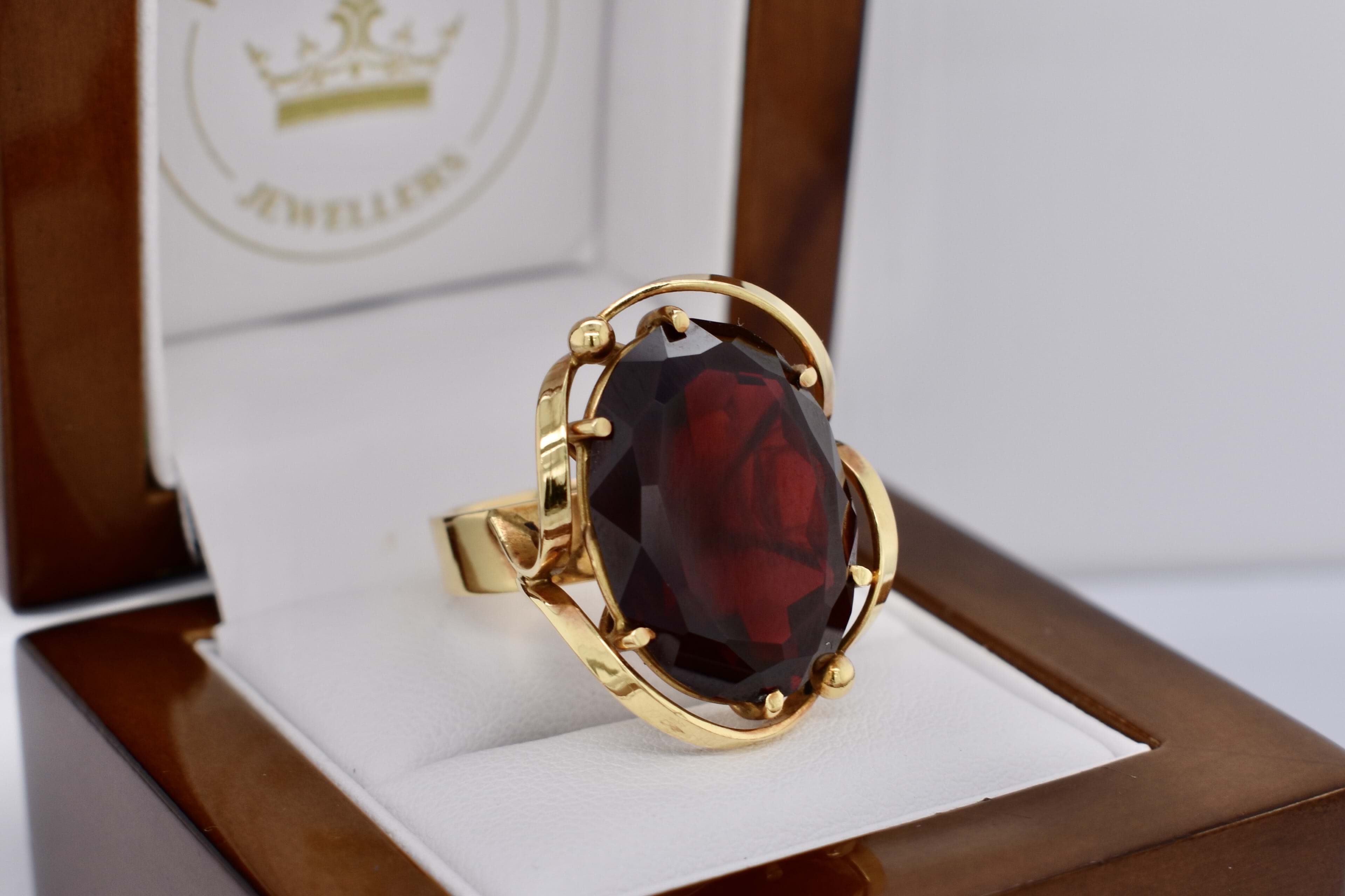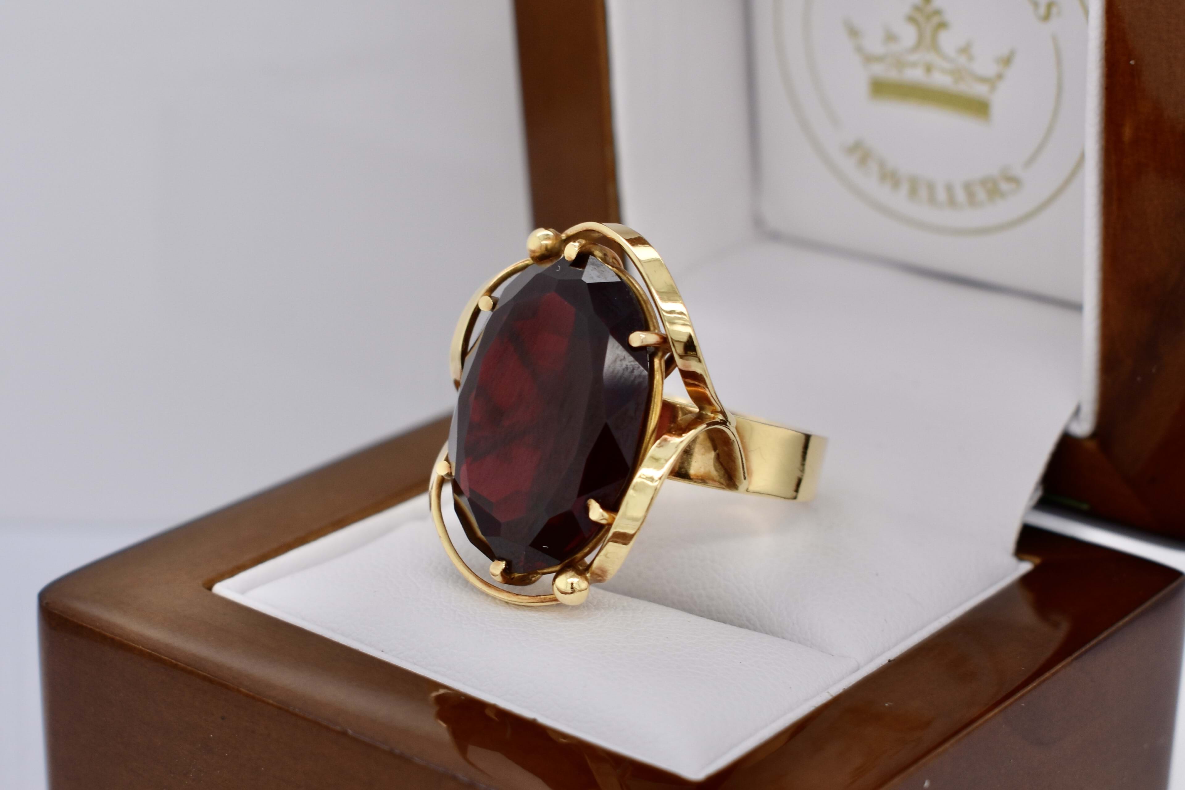 SOLD 18ct Yellow Gold Large Synthetic Ruby Oval Swirl Border Ring (P)