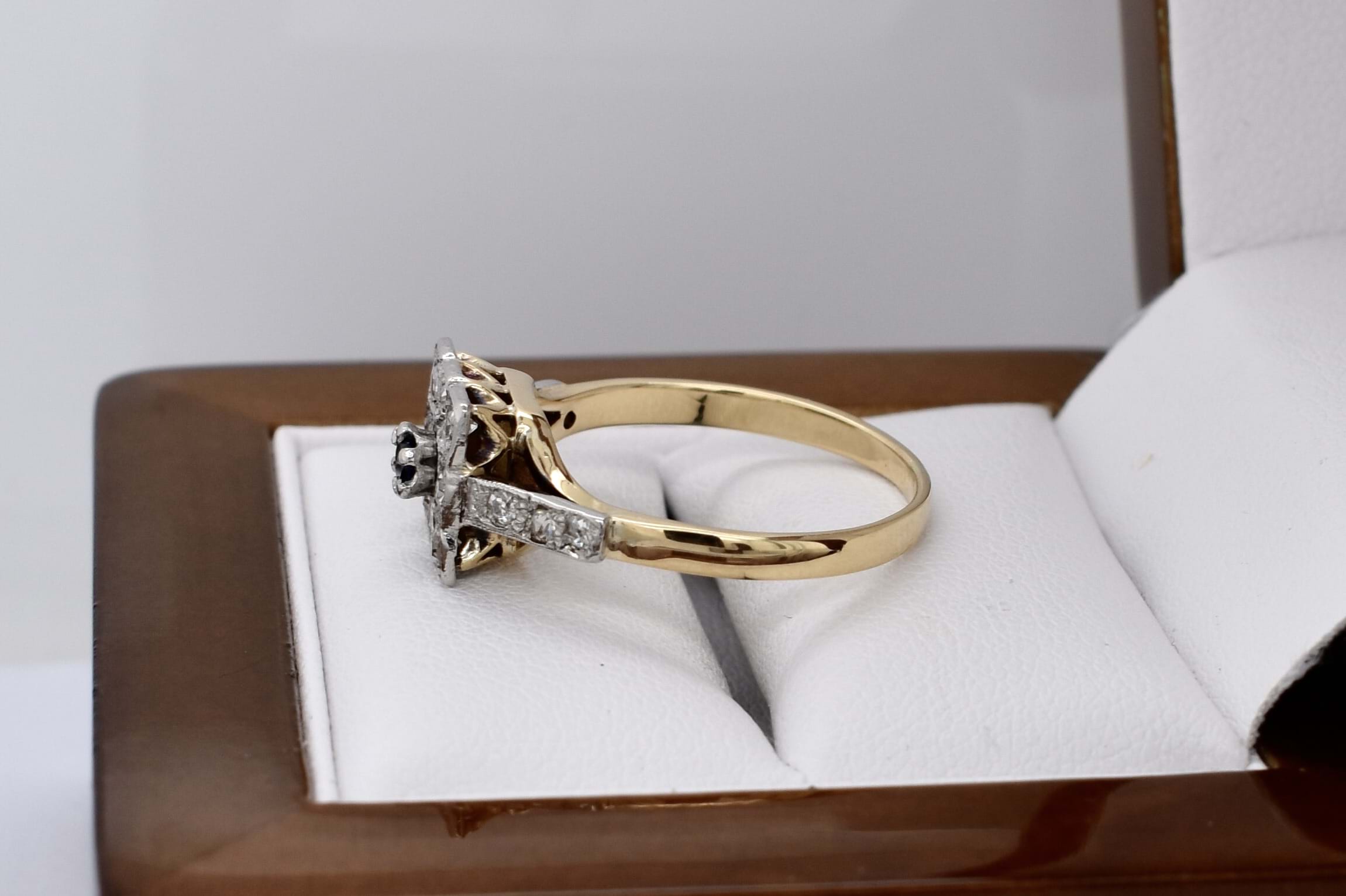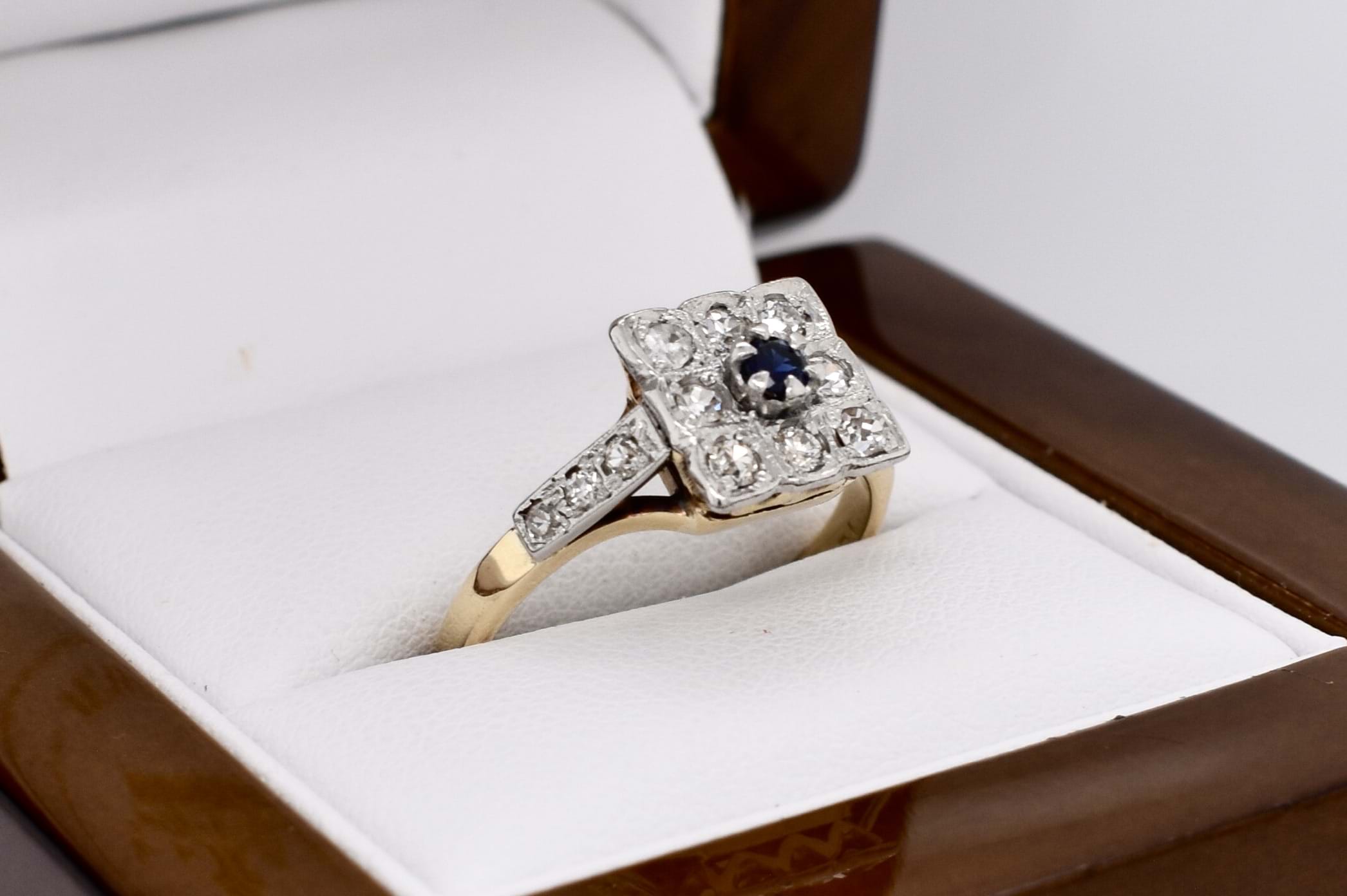 This stunning vintage square halo ring is crafted in 18ct yellow and white gold, and features a 2.9mm round synthetic blue sapphire in the centre. Surrounded by thirteen old round brilliant cut diamonds and one modern round brilliant cut (one old had chipped), ranging from 1.6-2.1mm, totalling 0.45ct. These diamonds continue down the shoulders of the tapered half round band with split shoulders. Finger size Q. Independent Valuation Supplied.