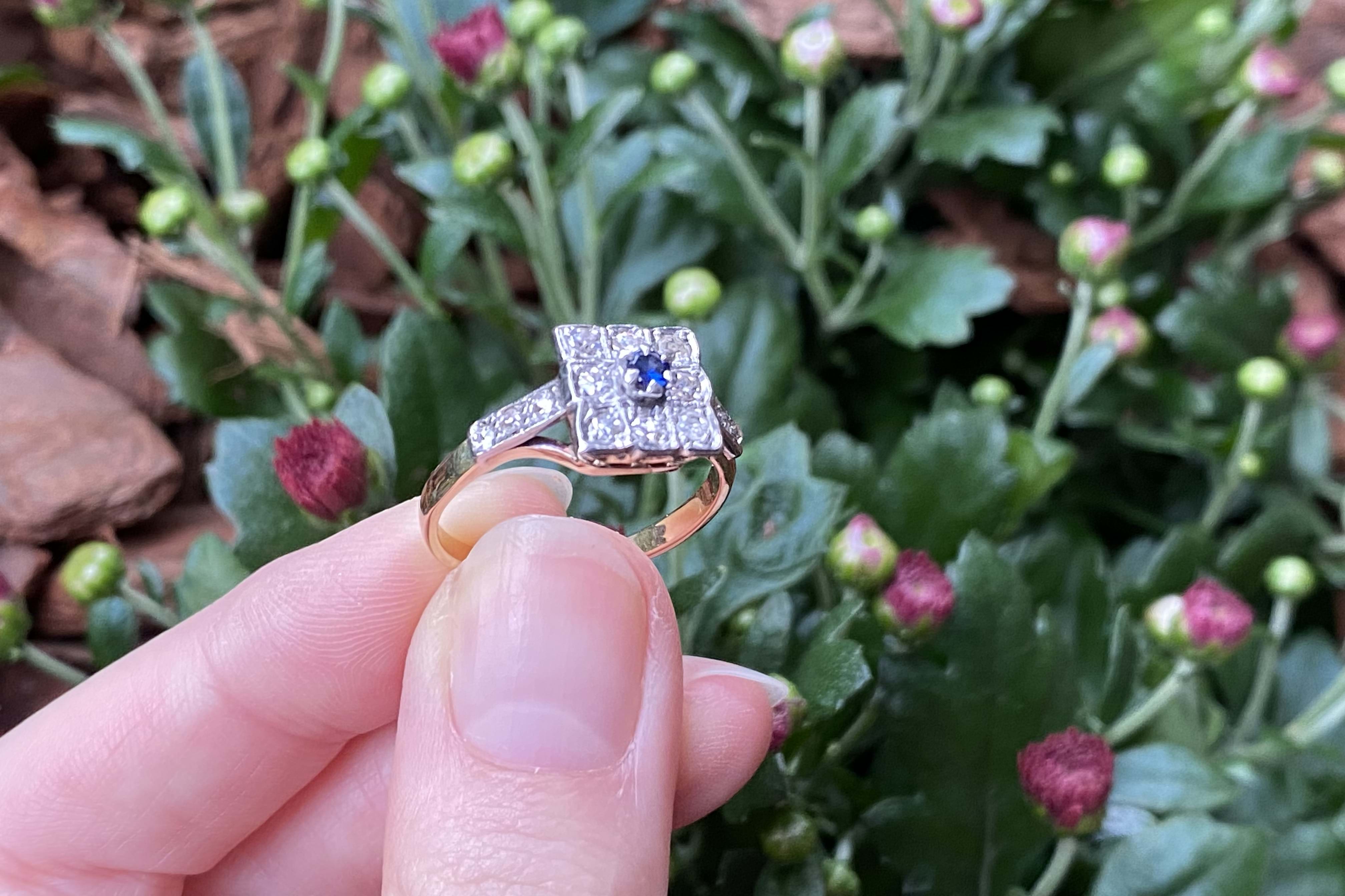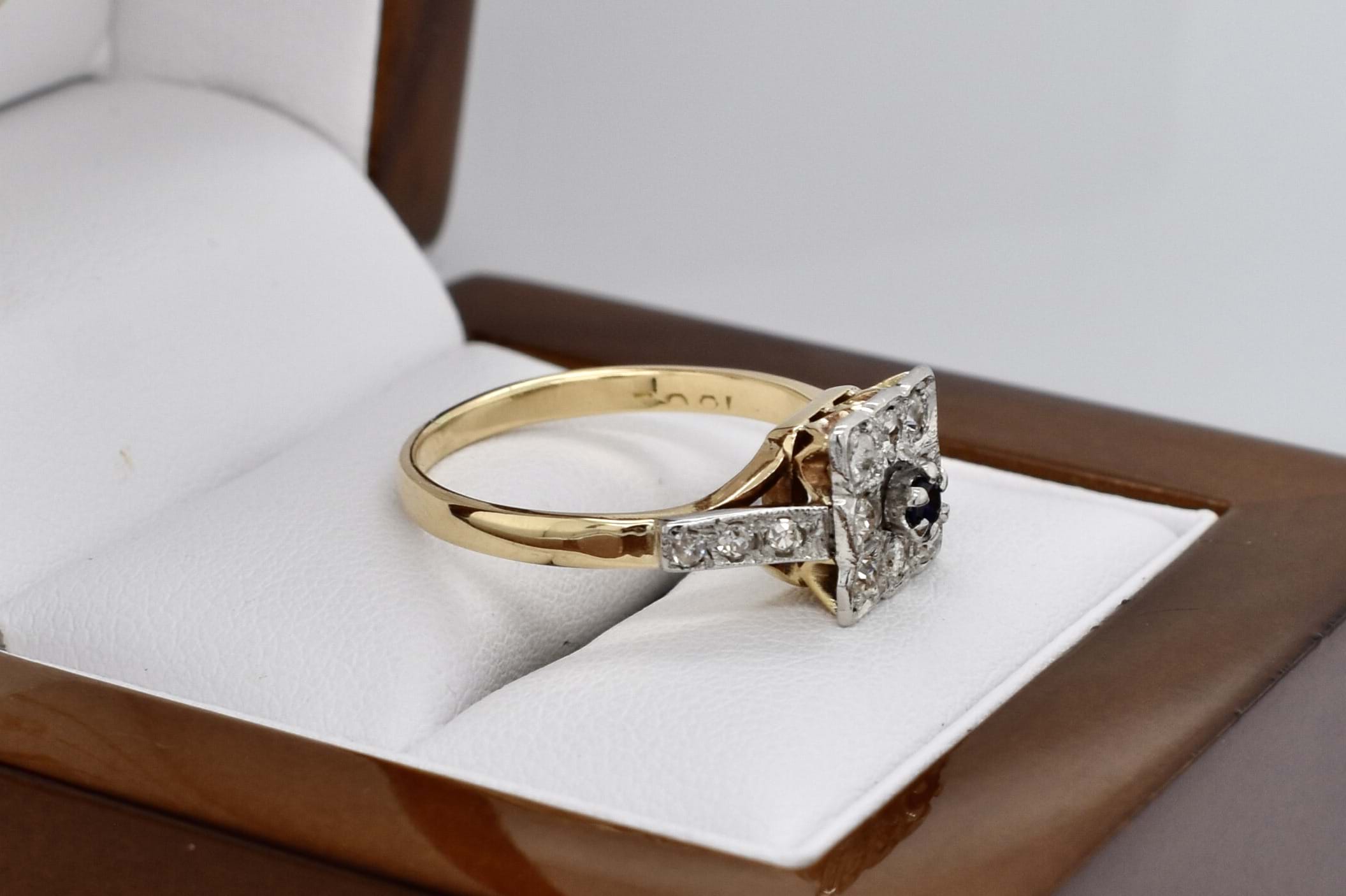 SOLD 18ct Yellow Gold Sapphire & 0.45ct G-K VS-SI Square Halo Ring (Q)