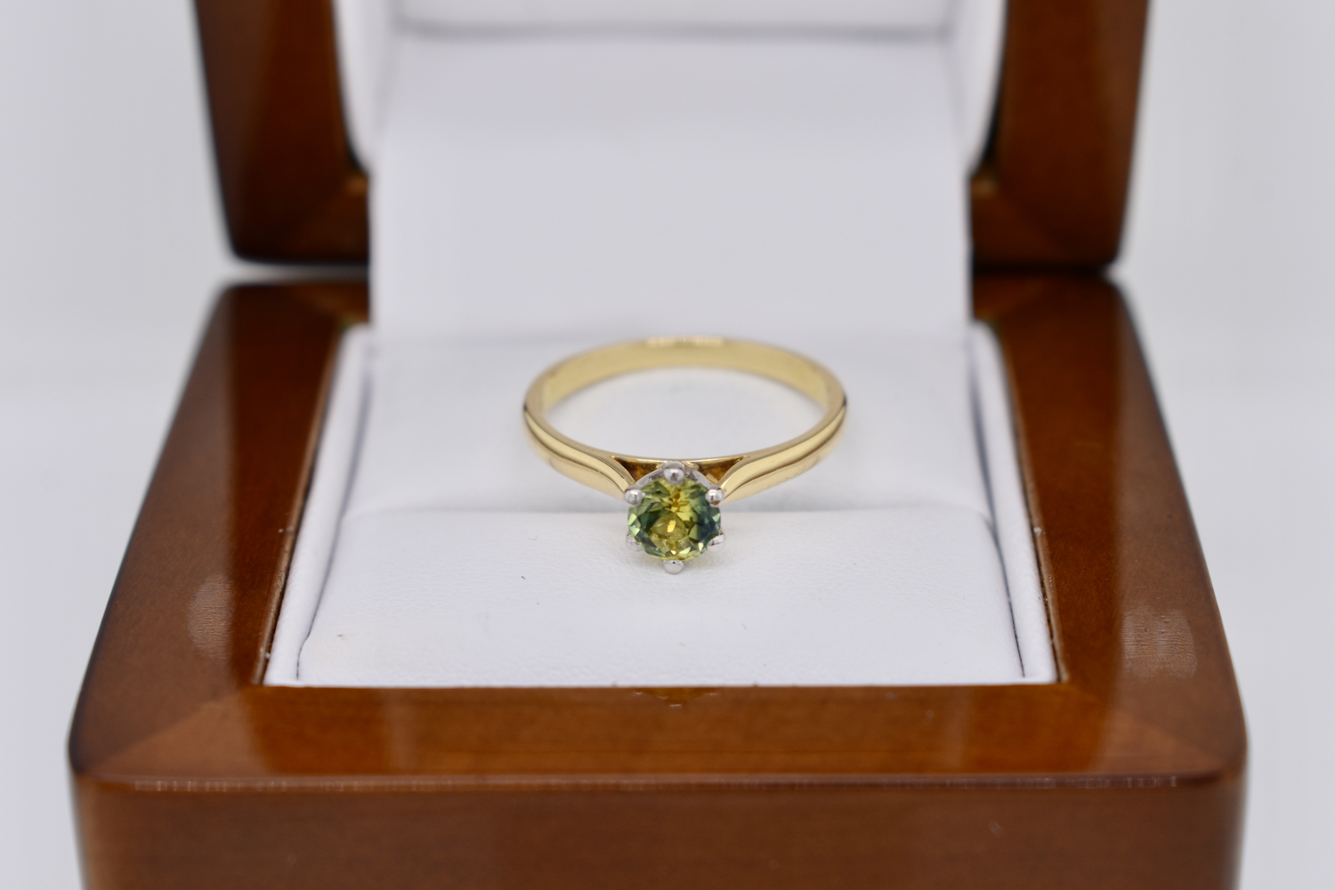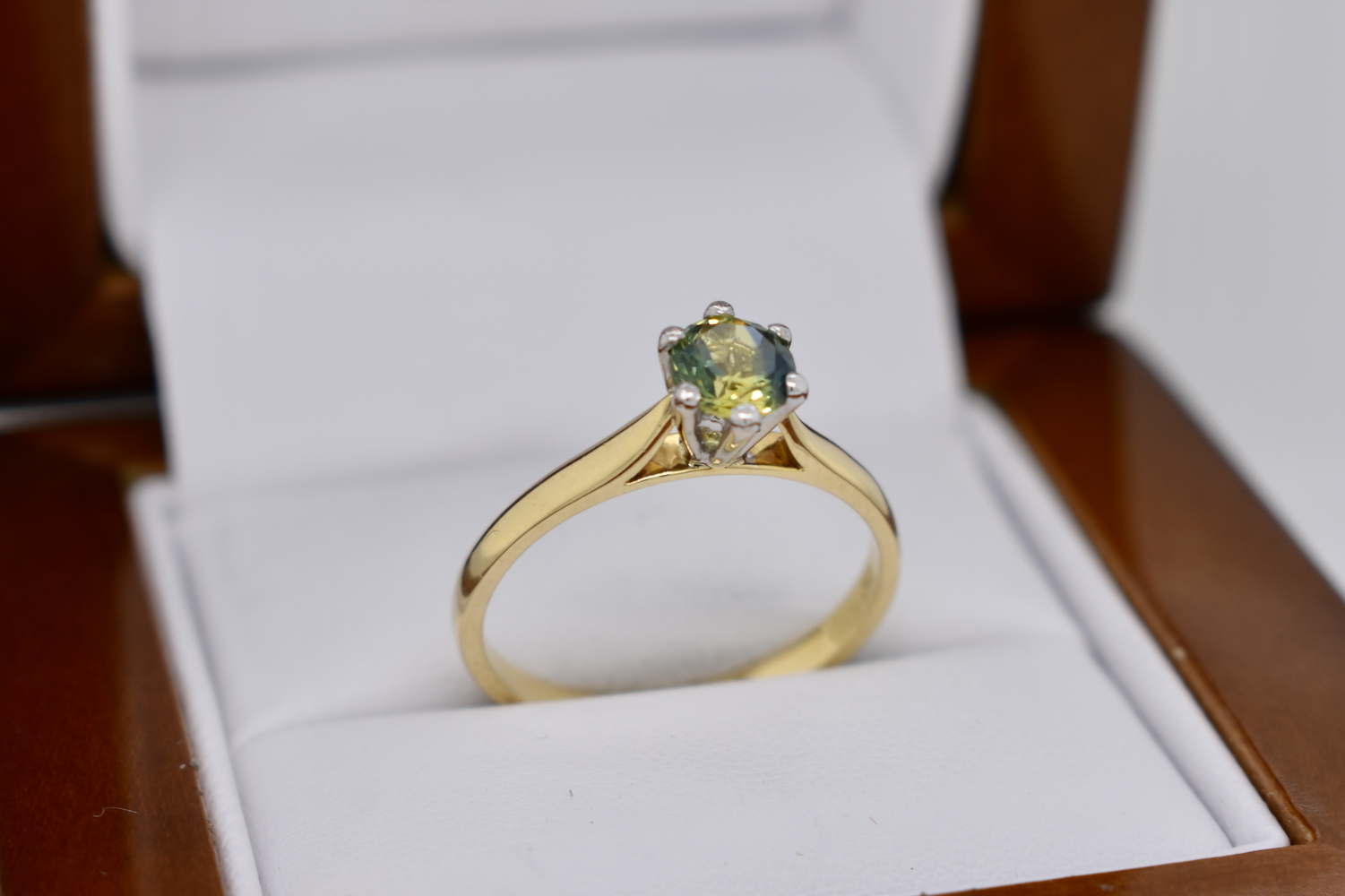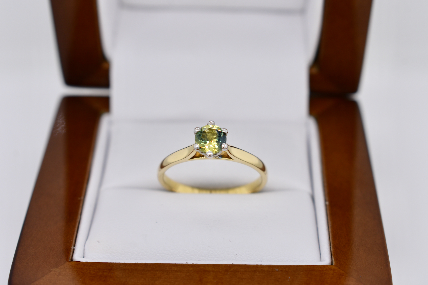 This simple yet pretty 18ct yellow gold ring is set with a solitaire 0.87ct round Australian blue yellow parti sapphire, set in six contrasting white gold claws in a raised setting on a plain band. This ring has been designed to be worn on its own or sit flush with other bands. Finger size N