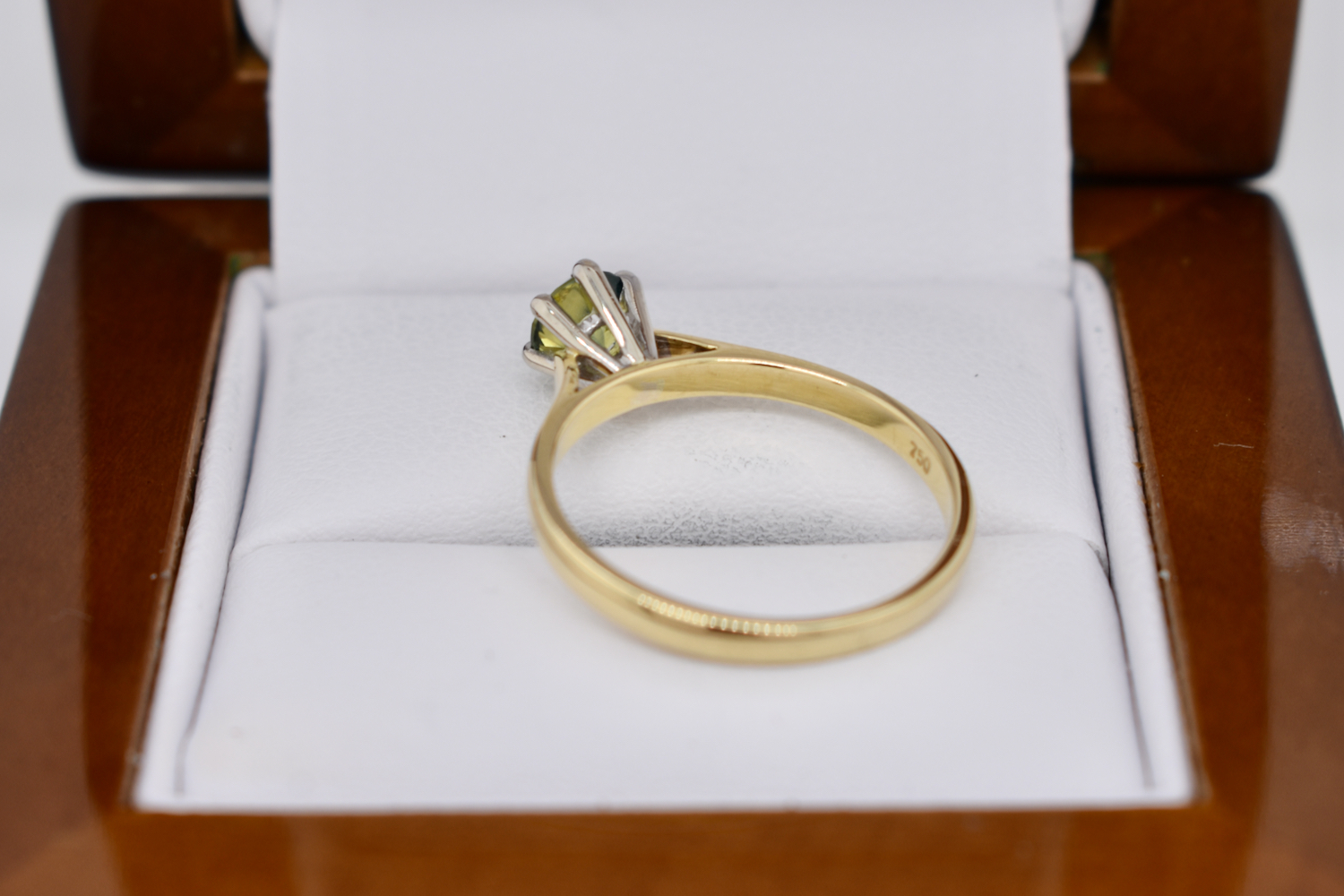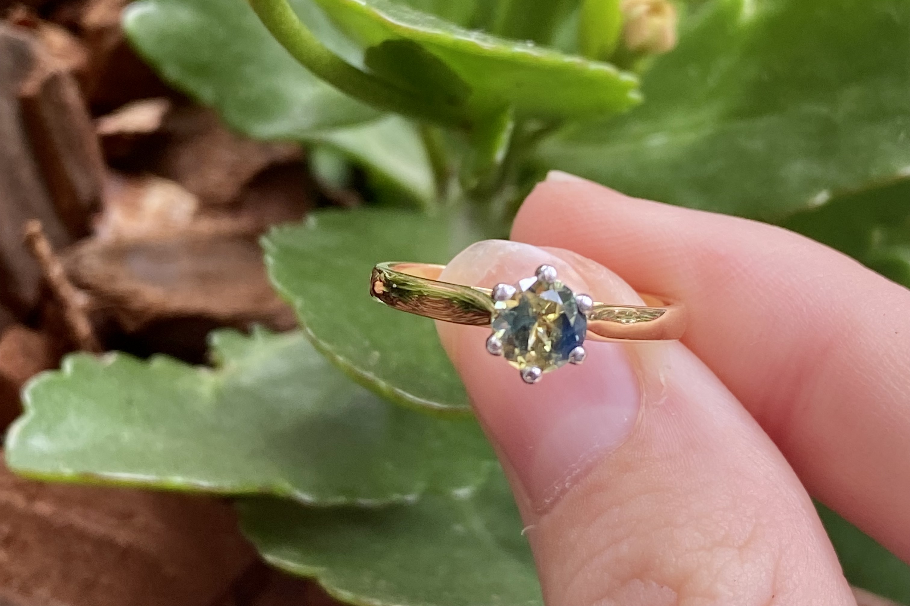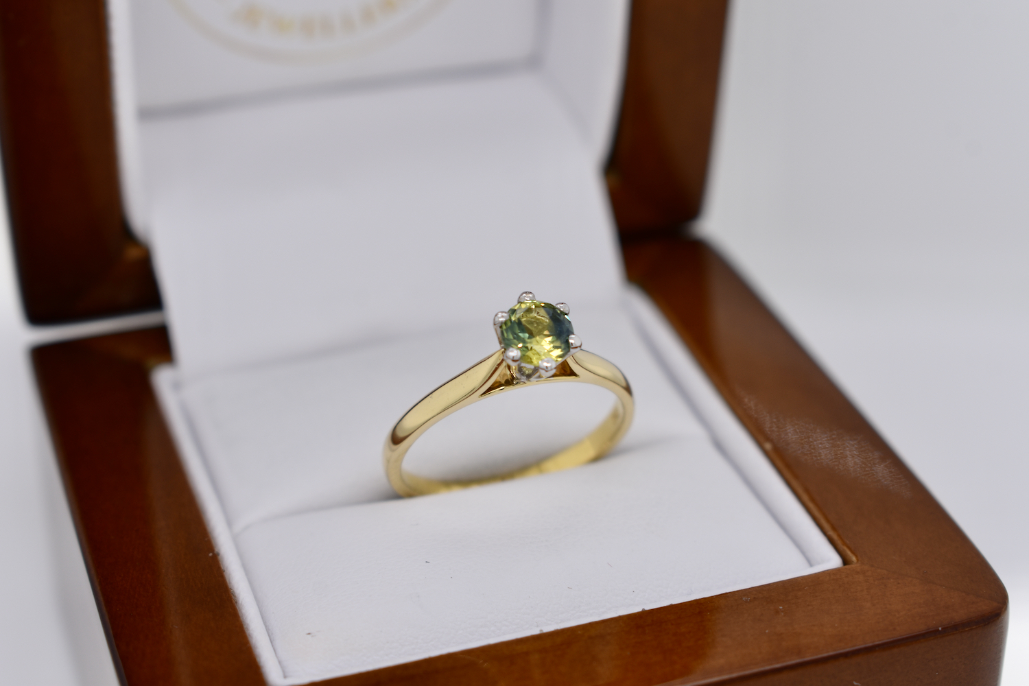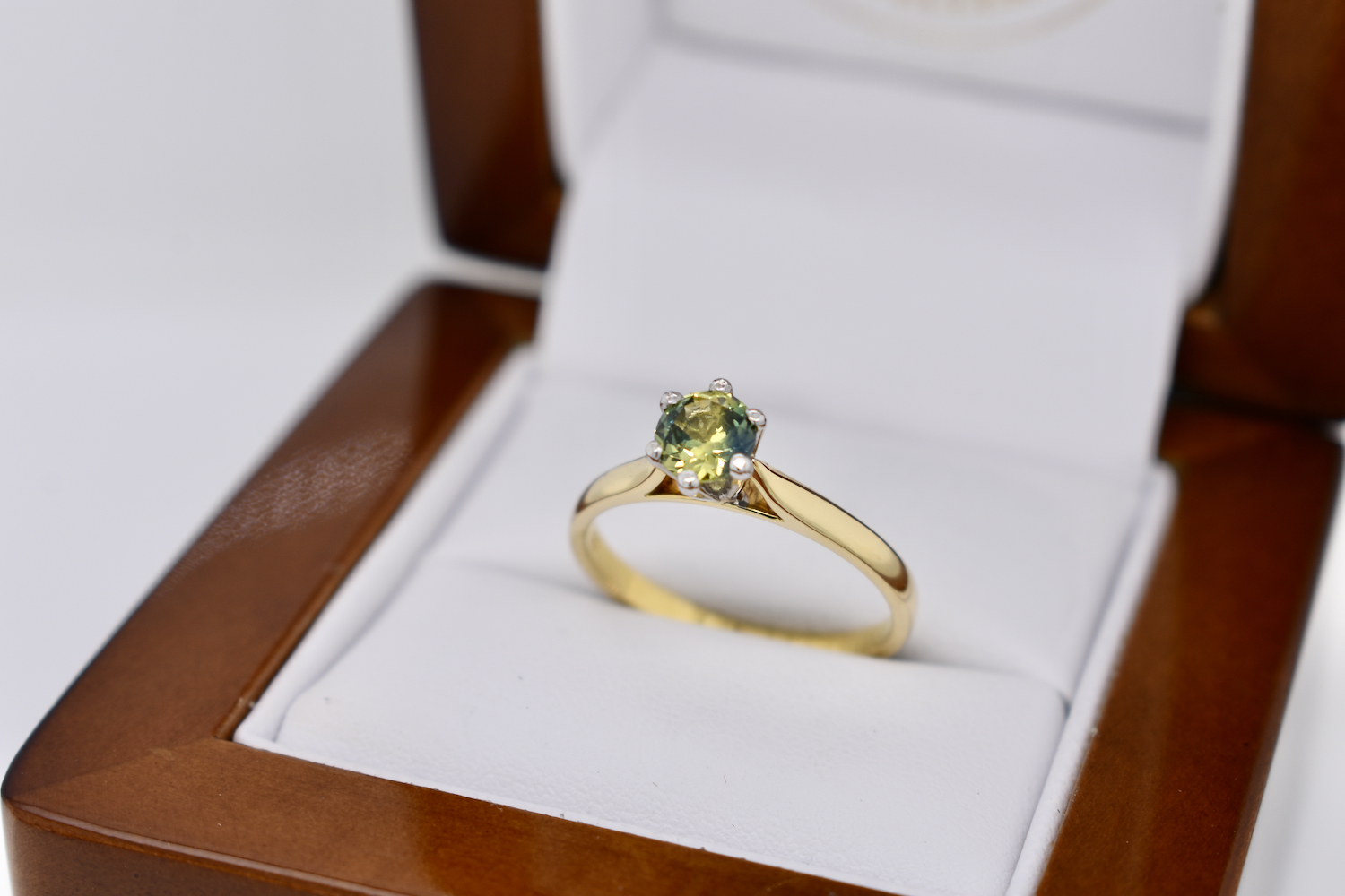 This simple yet pretty 18ct yellow gold ring is set with a solitaire 0.87ct round Australian blue yellow parti sapphire, set in six contrasting white gold claws in a raised setting on a plain band. This ring has been designed to be worn on its own or sit flush with other bands. Finger size N