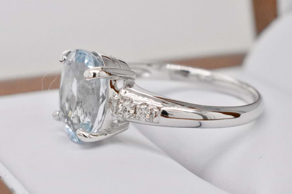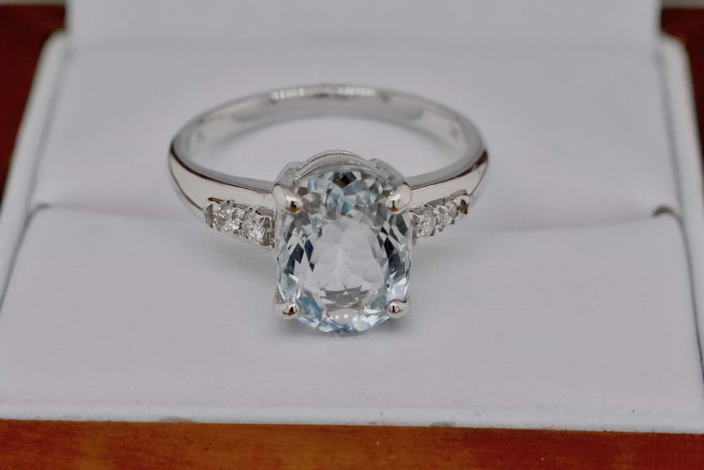 A large ice blue aquamarine weighing 2.90cts set into a simple 9ct white gold ring with four round brilliant cut diamonds equaling 0.07cts in 9ct white gold. Independent Valuation Supplied