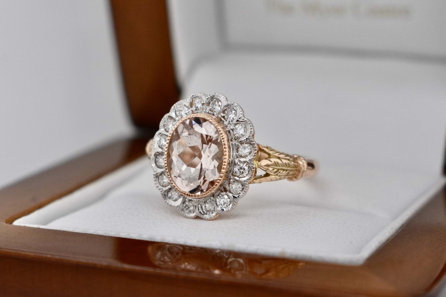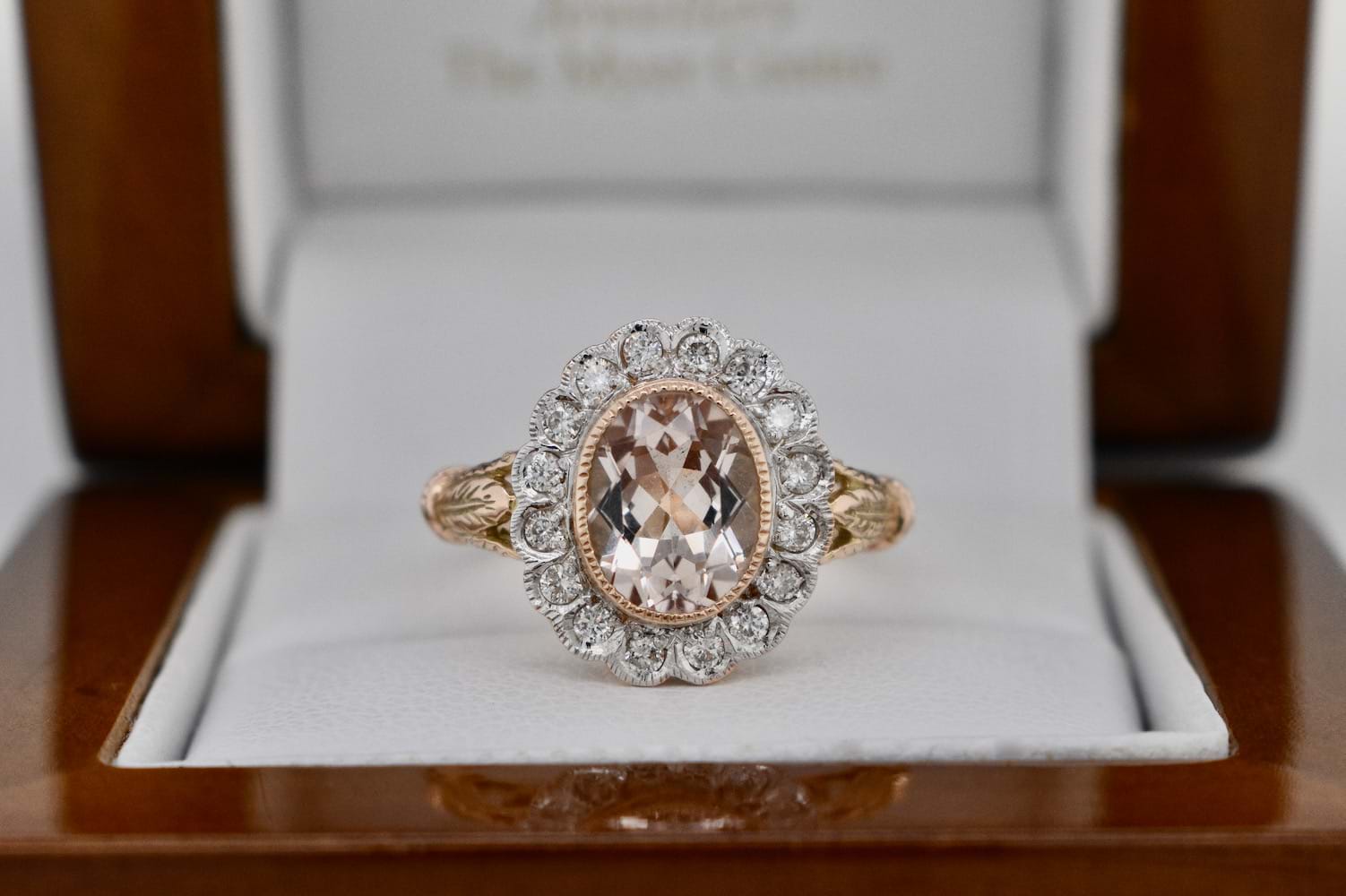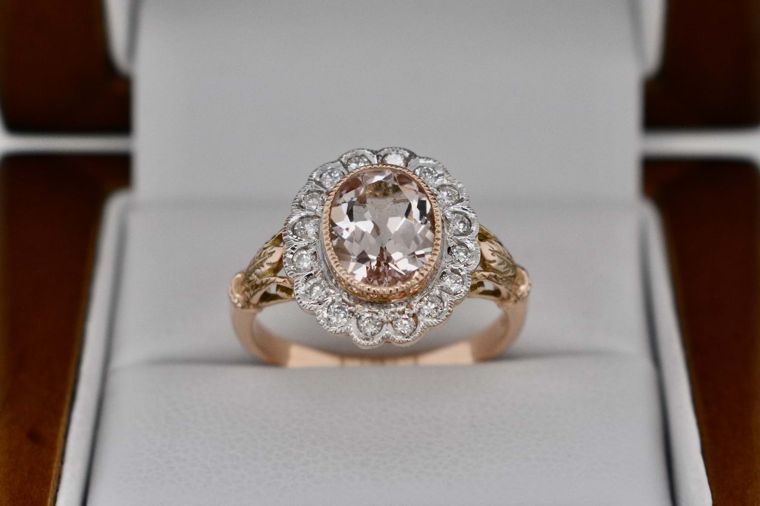 Vintage style 9ct rose gold dress ring featuring an oval 1.50ct morganite rose gold bezel set with a halo of shimmering round brilliant cut diamonds in a scalloped mill grain border with a fancy carved band. The piece contains 16 diamonds totalling 0.32cts (H/SI-P1). Finger size N+ Independent Valuation Supplied
