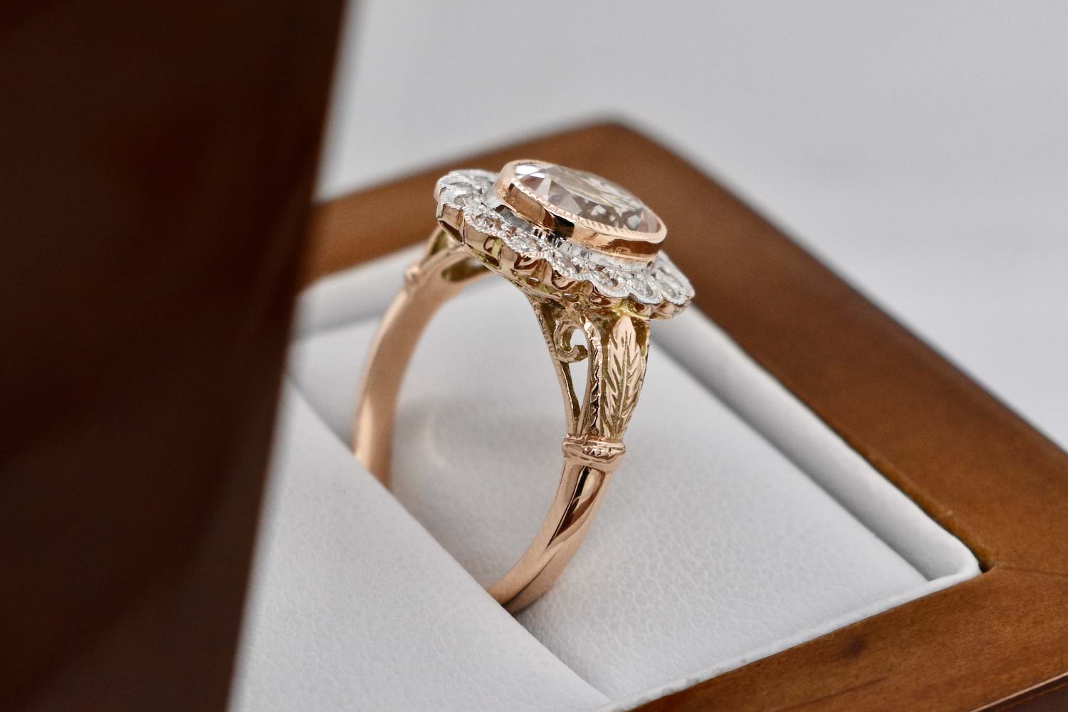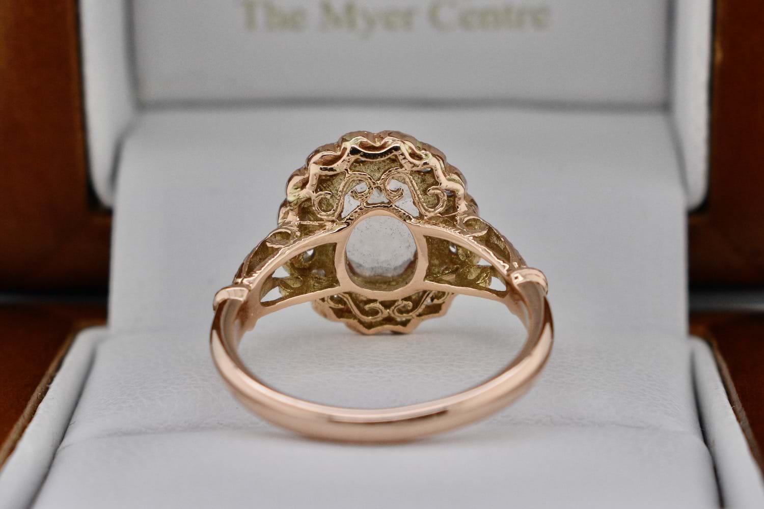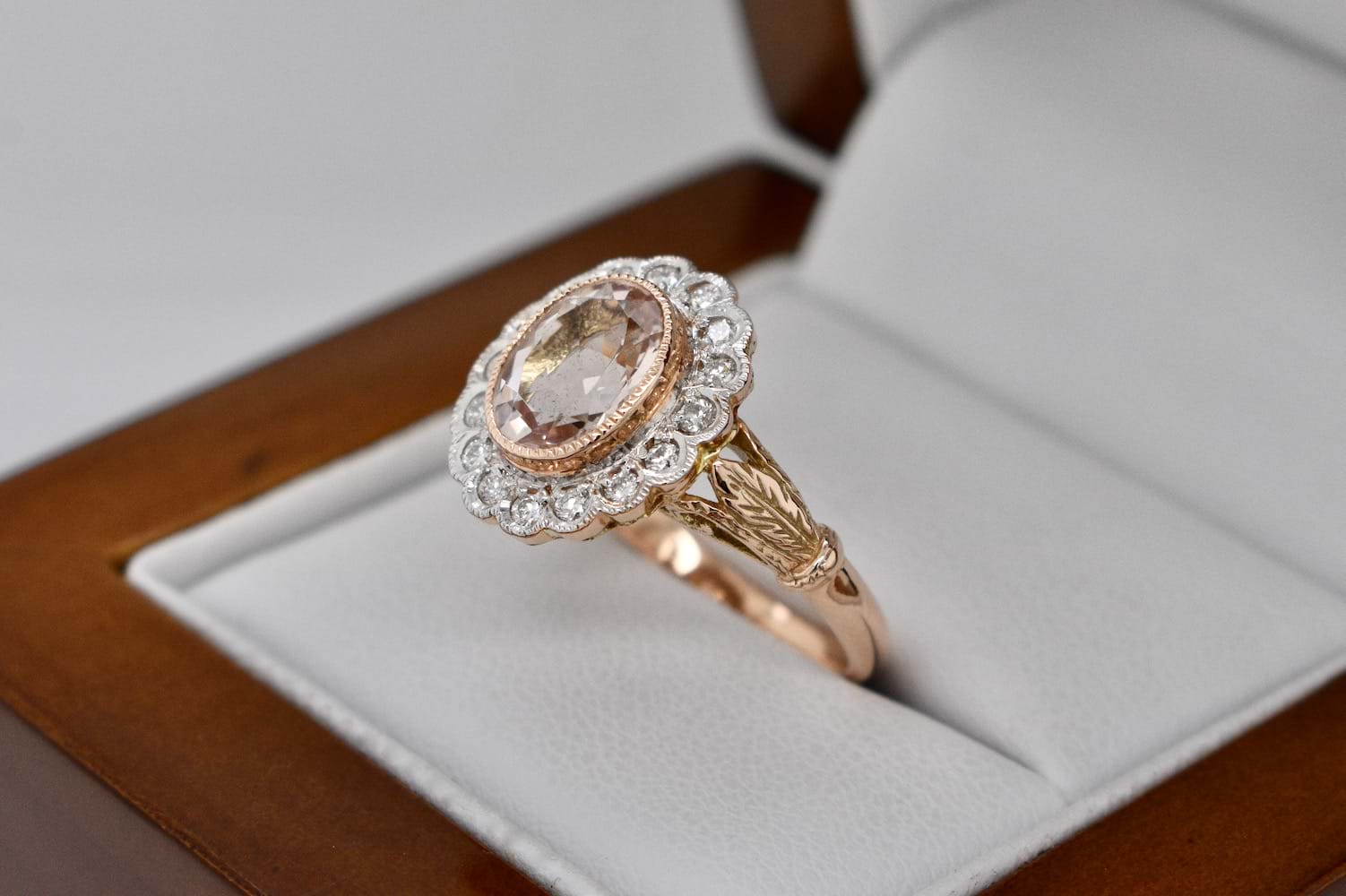 Vintage style 9ct rose gold dress ring featuring an oval 1.50ct morganite rose gold bezel set with a halo of shimmering round brilliant cut diamonds in a scalloped mill grain border with a fancy carved band. The piece contains 16 diamonds totalling 0.32cts (H/SI-P1). Finger size N+ Independent Valuation Supplied