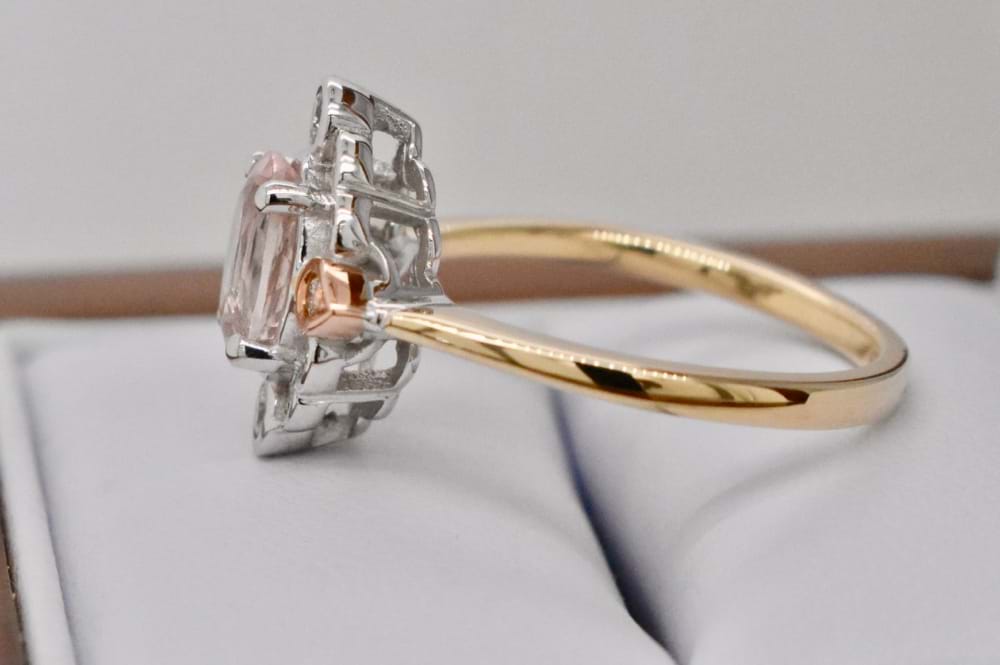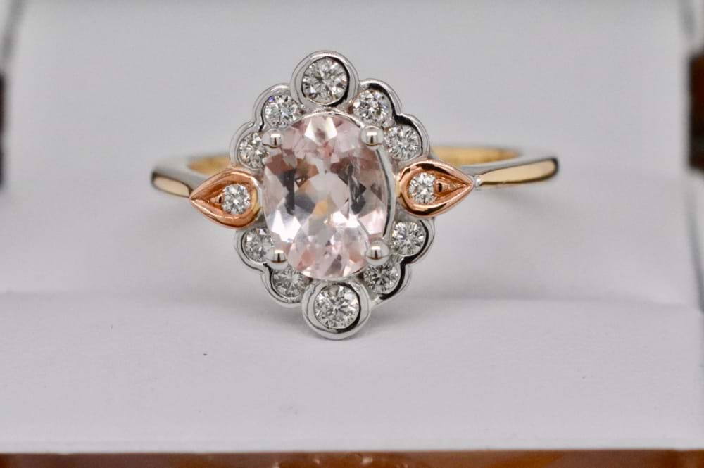 This 1ct soft pink Morganite surrounded by diamonds, totaling 0.27cts, is set in a vintage inspired 9ct yellow gold, pink gold and white gold ring. Independent Valuation Supplied