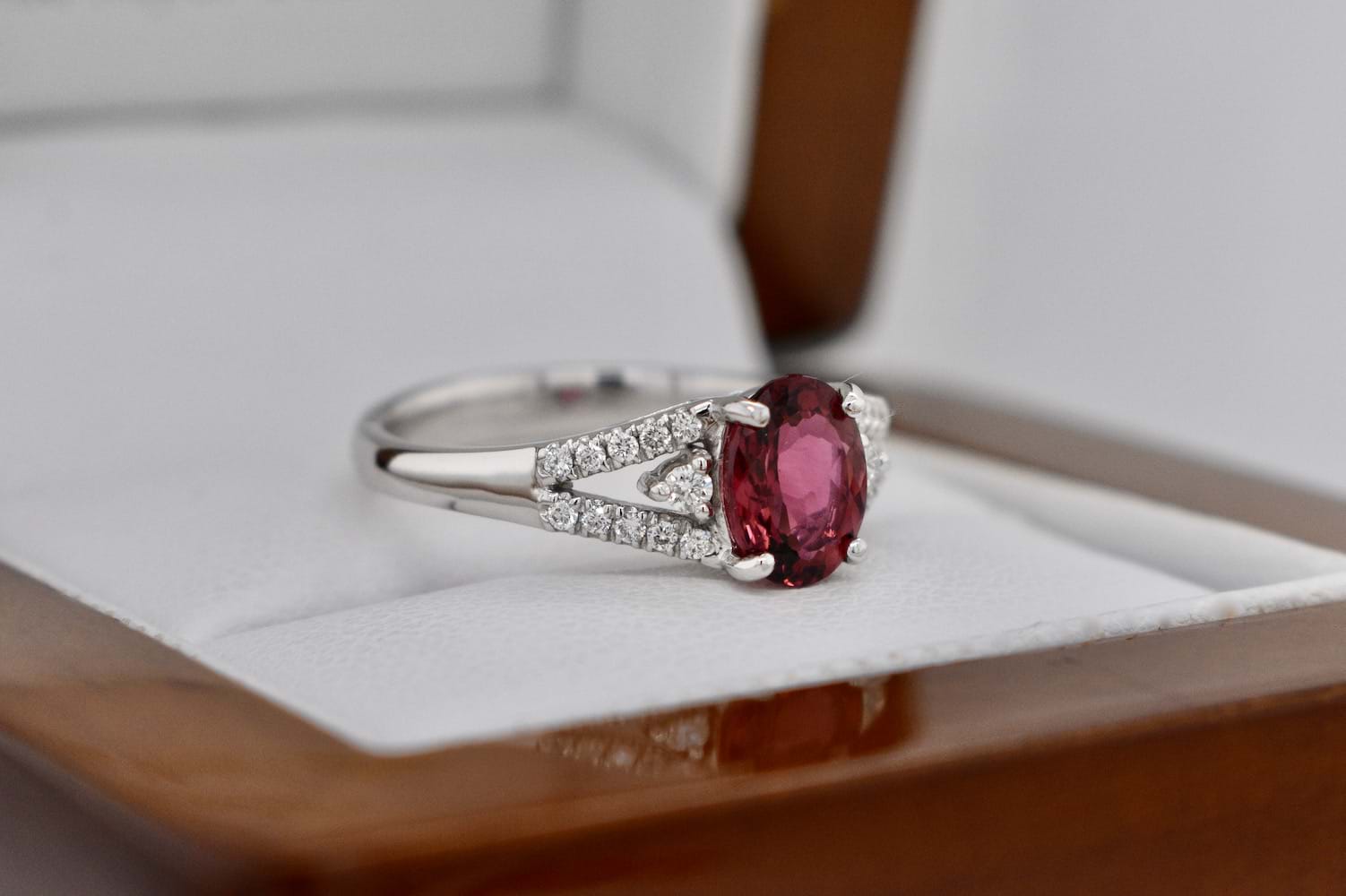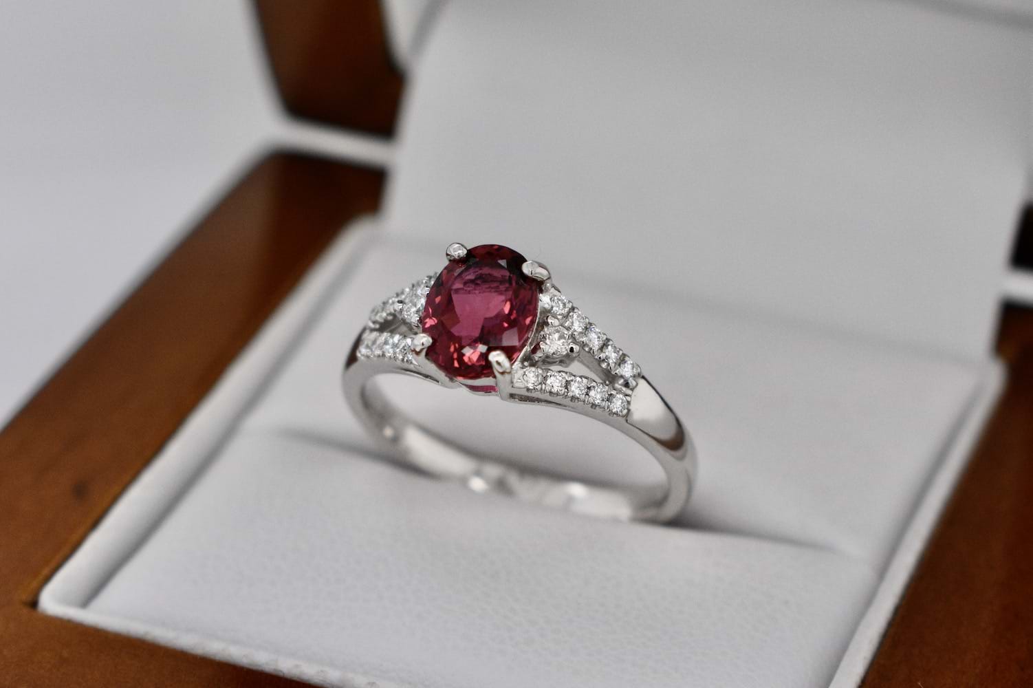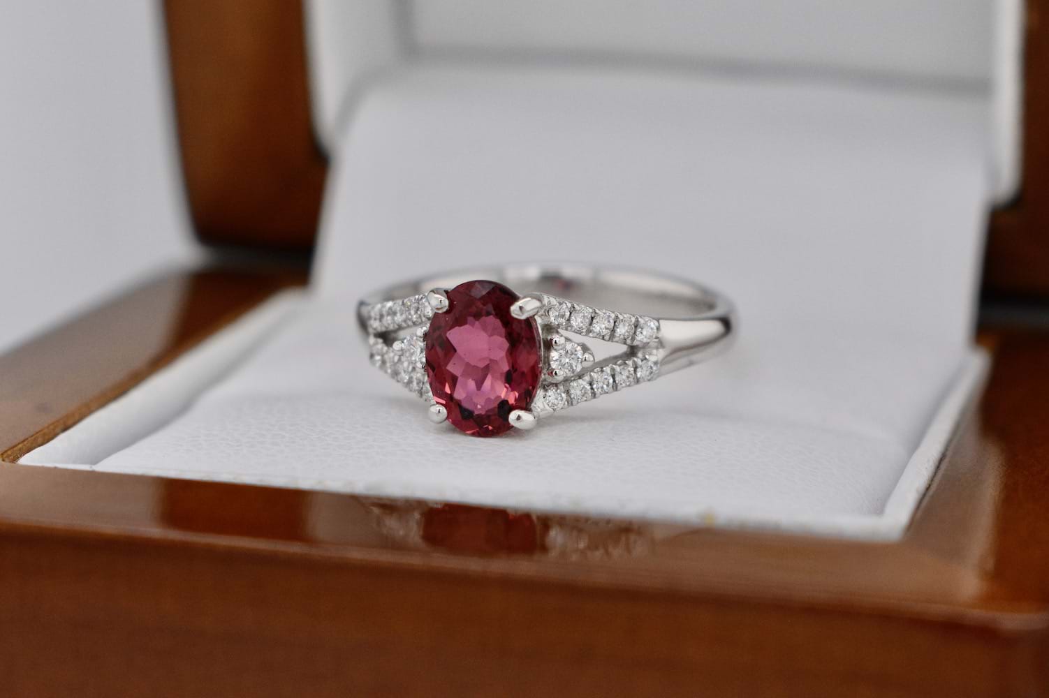 This pretty dark dusty pink tourmaline is a 1.07ct oval set into a 9ct white gold four claw setting with diamond set split shoulders a single round brilliant cut diamond 3 claw set on each side. Total diamond content equals 0.15cts (GVS-SI). Finger size N. Independent Valuation Supplied