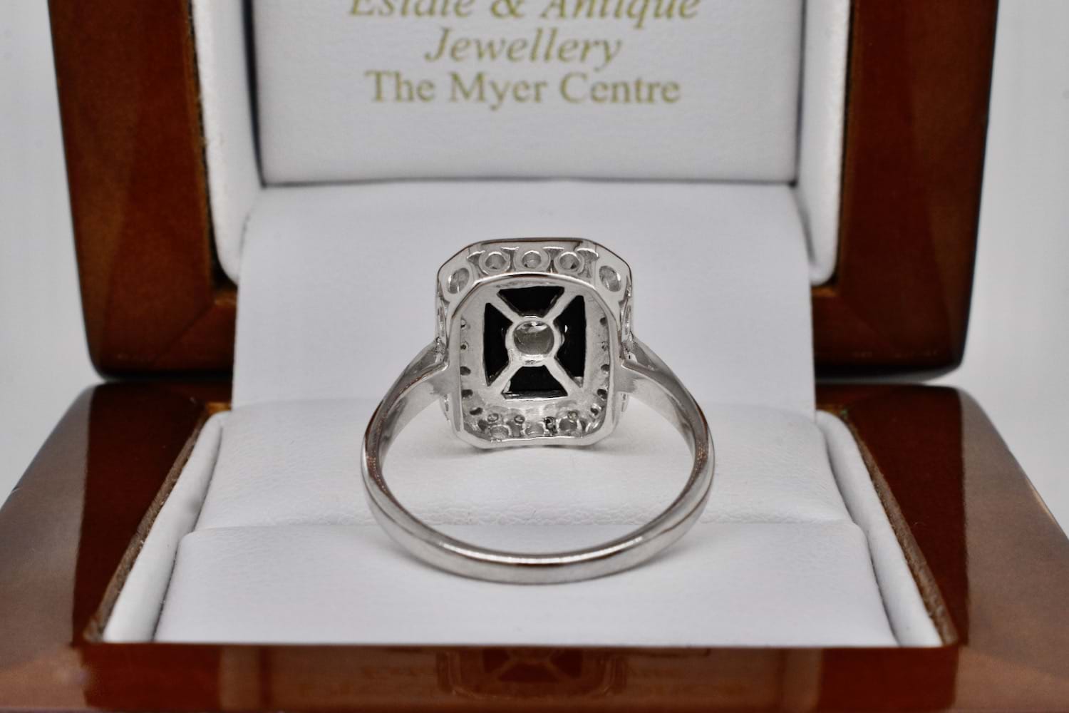 A 9ct white gold onyx and diamond ring featuring a sparkling 0.07ct round brilliant cut diamond white gold bezel set in a plate of black onyx with a grain set border of shimmering diamonds totalling 0.22cts. Finger size O Independent Valuation Supplied