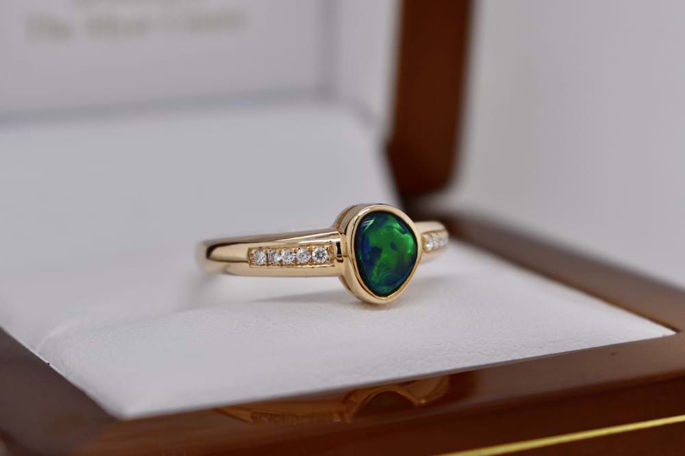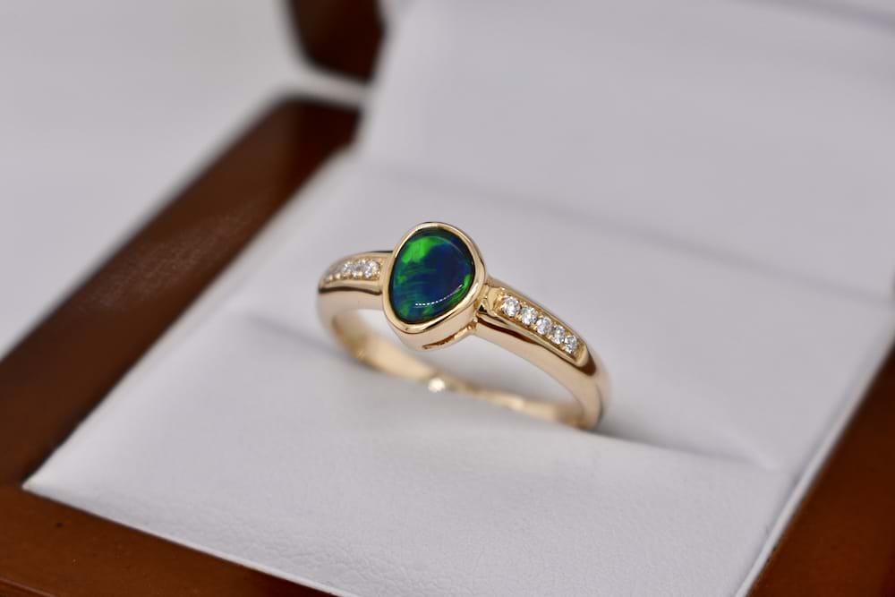 9ct yellow gold dress ring featuring a 0.40ct black opal displaying blue and green flashes in a bezel setting with diamonds in the shoulders totaling 0.07cts (GH/VS-SI). Finger size N