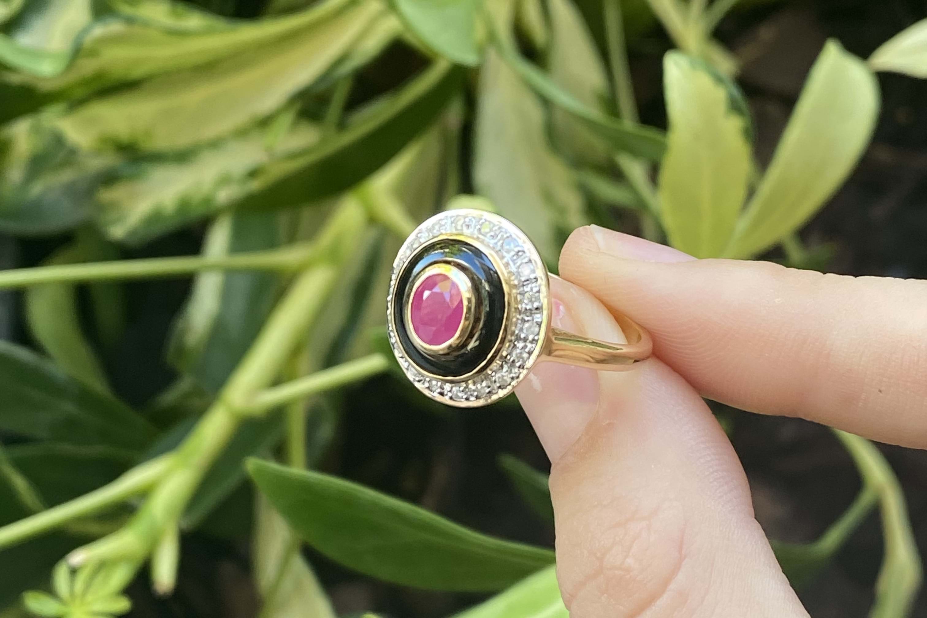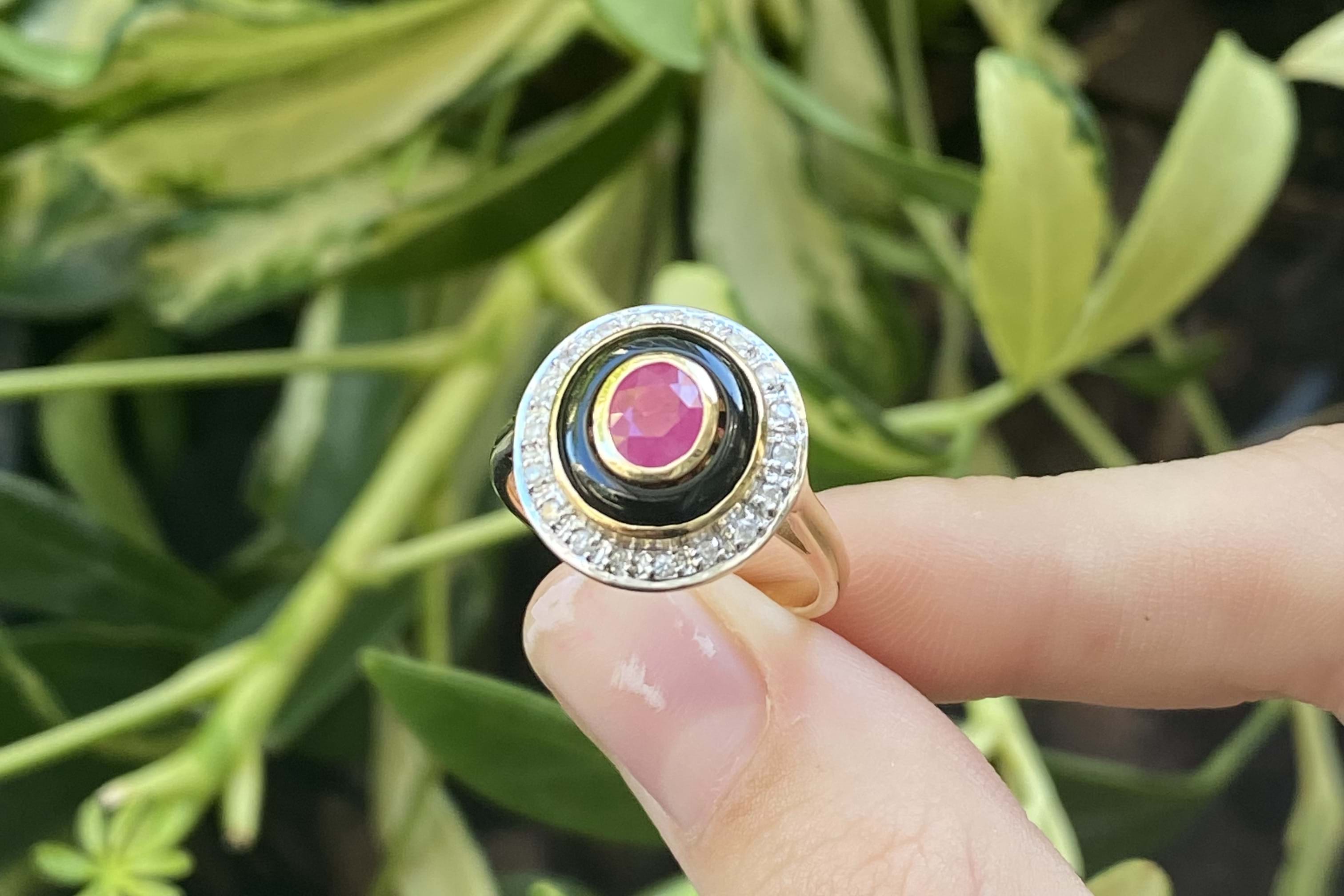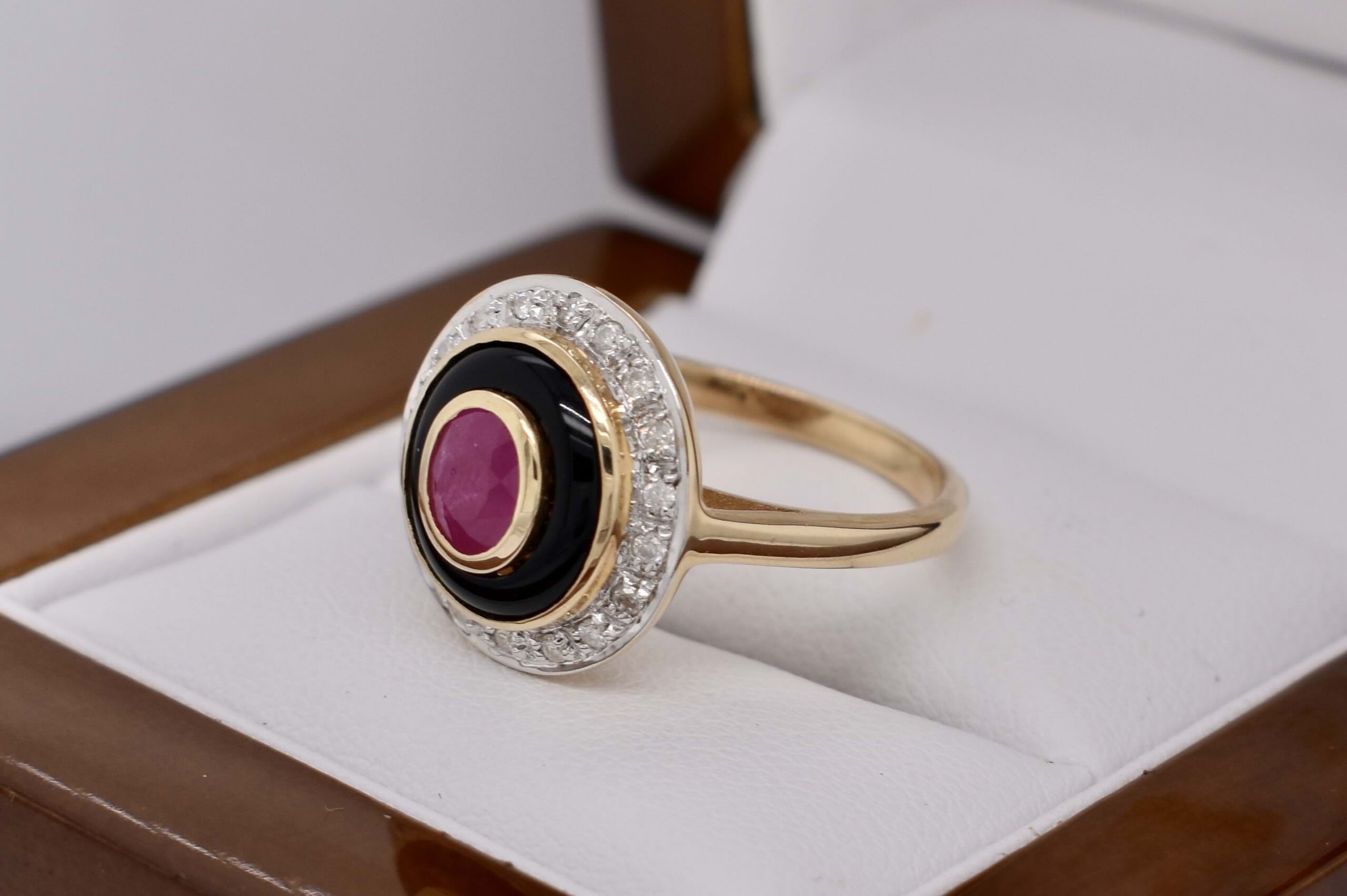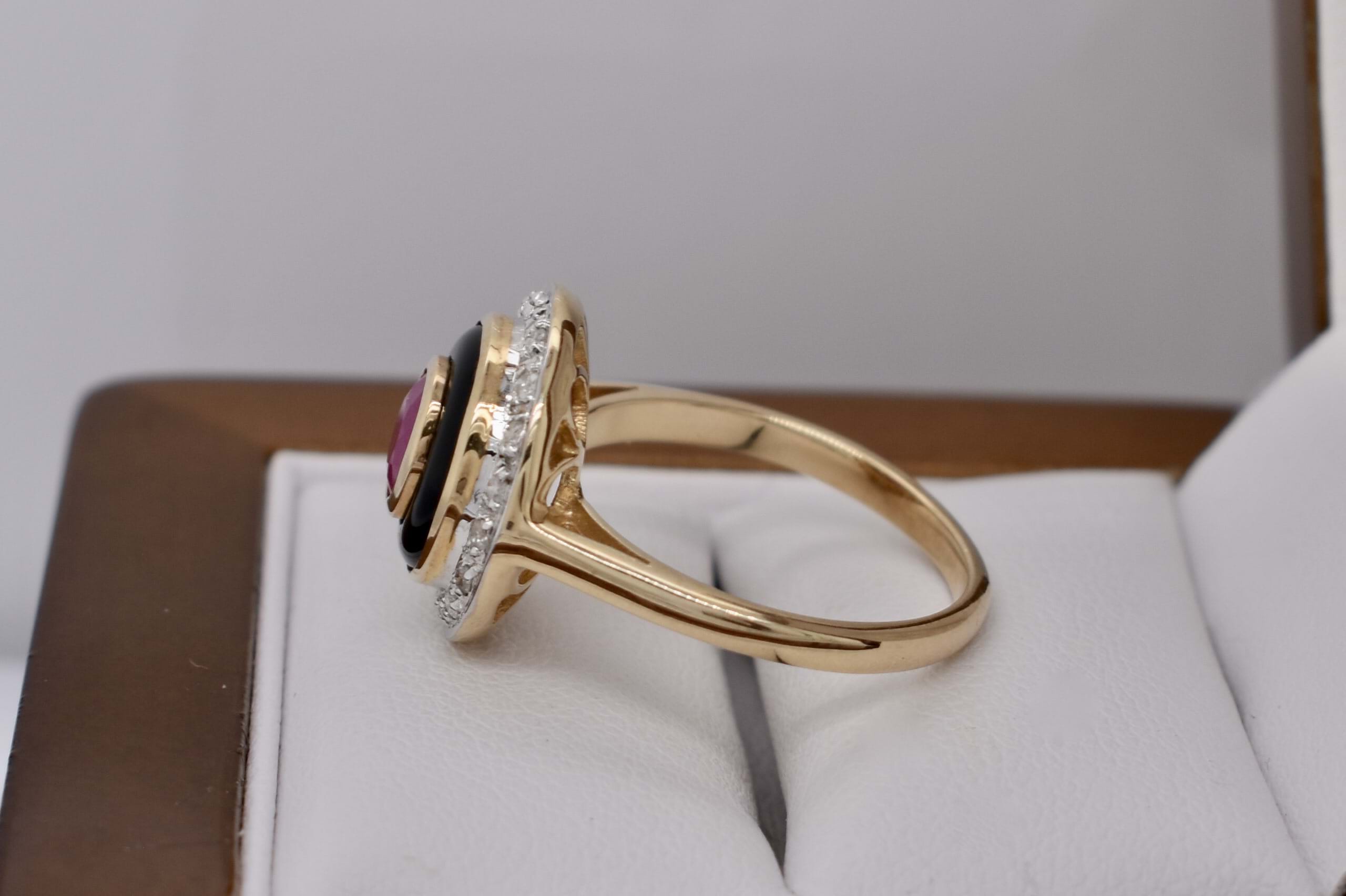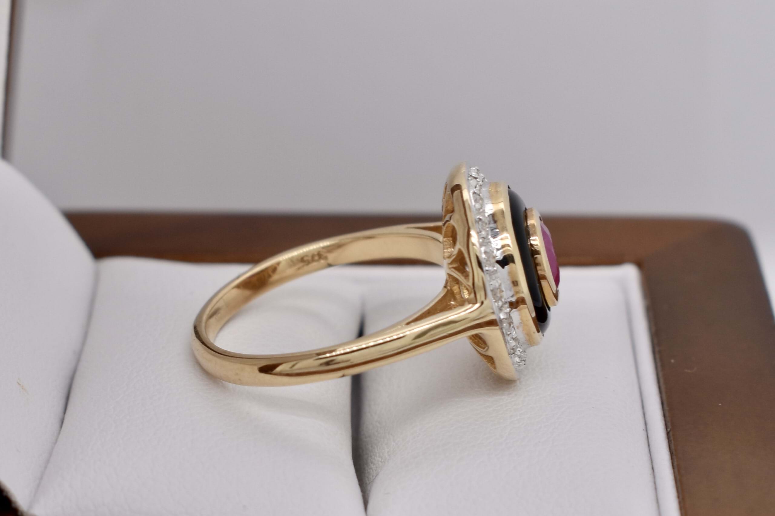 SOLD 9ct Yellow Gold 0.60ct Ruby, Onyx & Diamond Ring