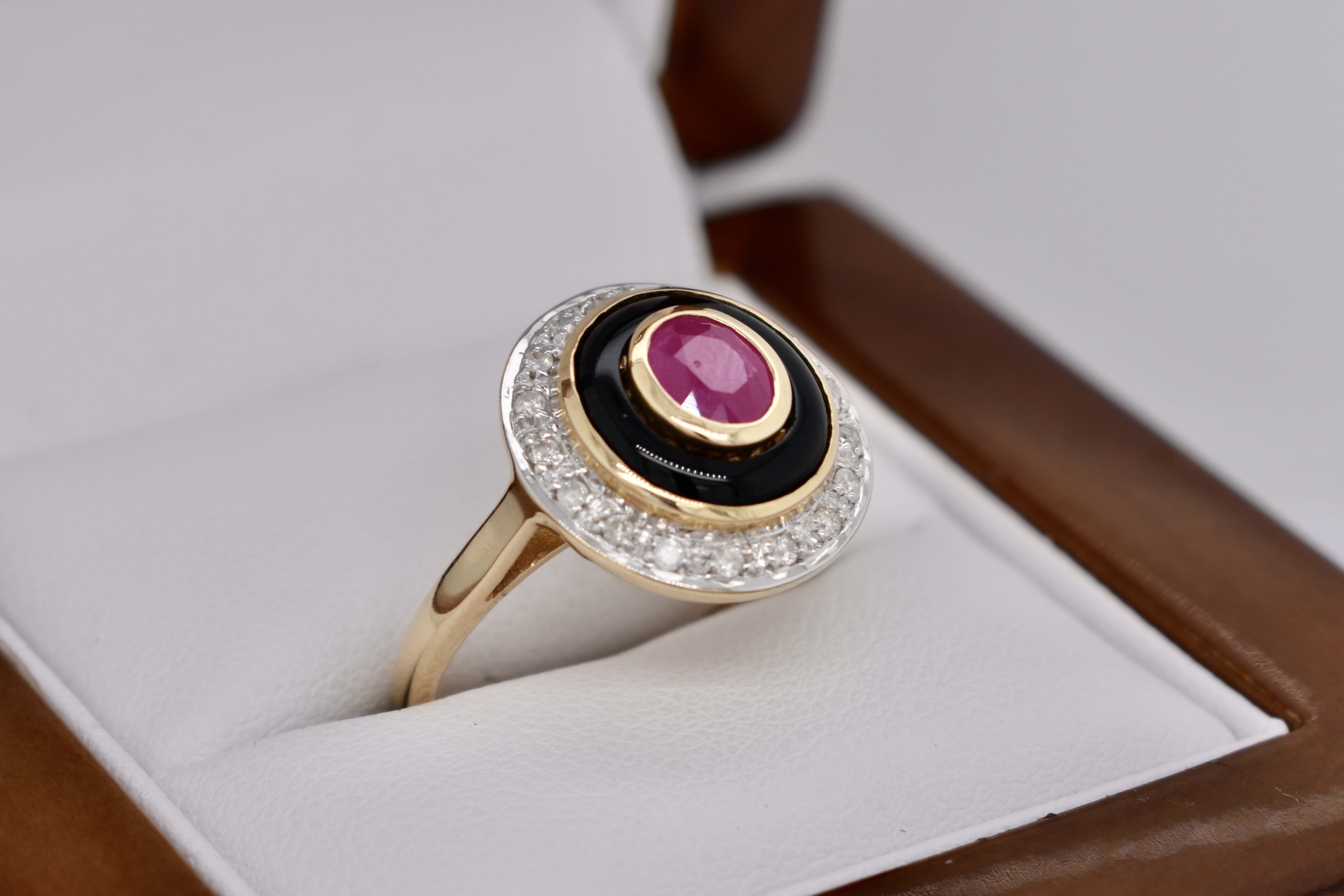 Beautiful antique style dress ring crafted in 9ct yellow gold featuring a bezel set oval ruby equalling 0.60ct, with a surround of lustrous black onyx and an outer halo of shimmering diamonds totalling 0.09ct HI/P2-3 and a plain 2mm band. Finger size N+ Independent Valuation Supplied