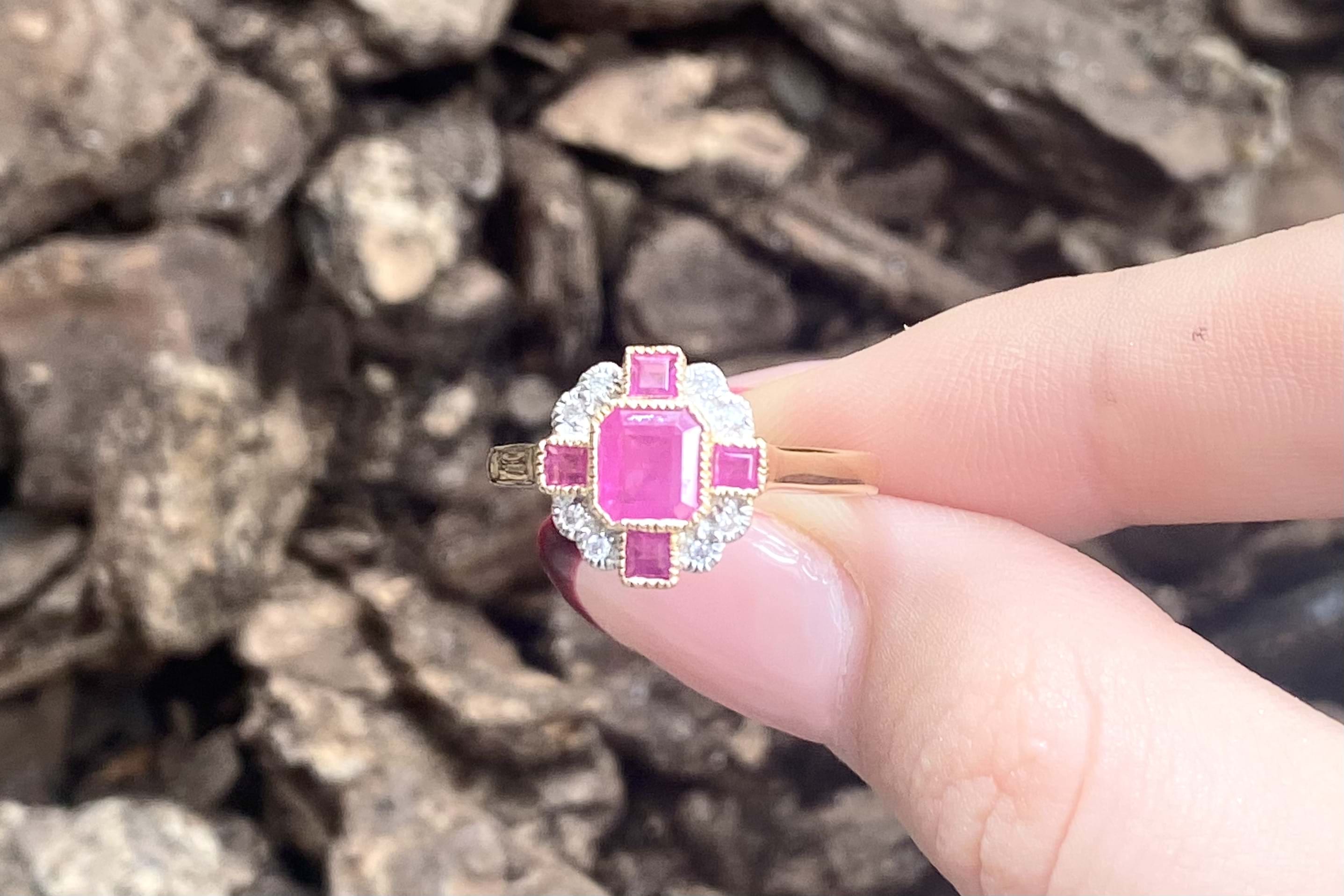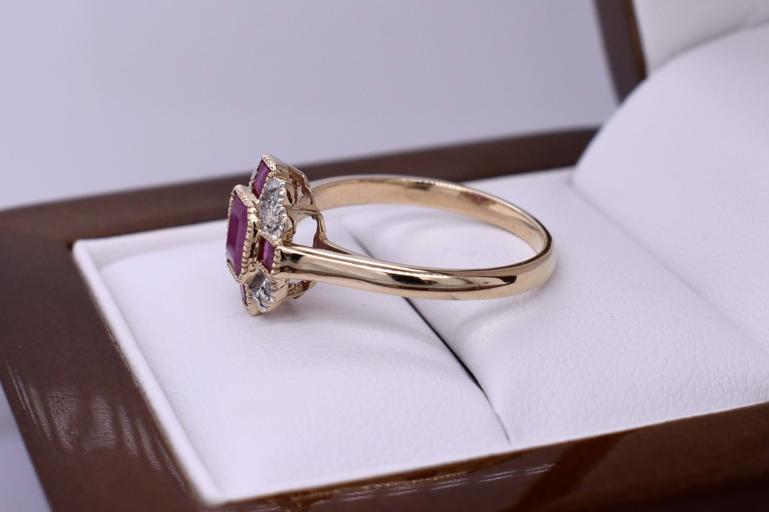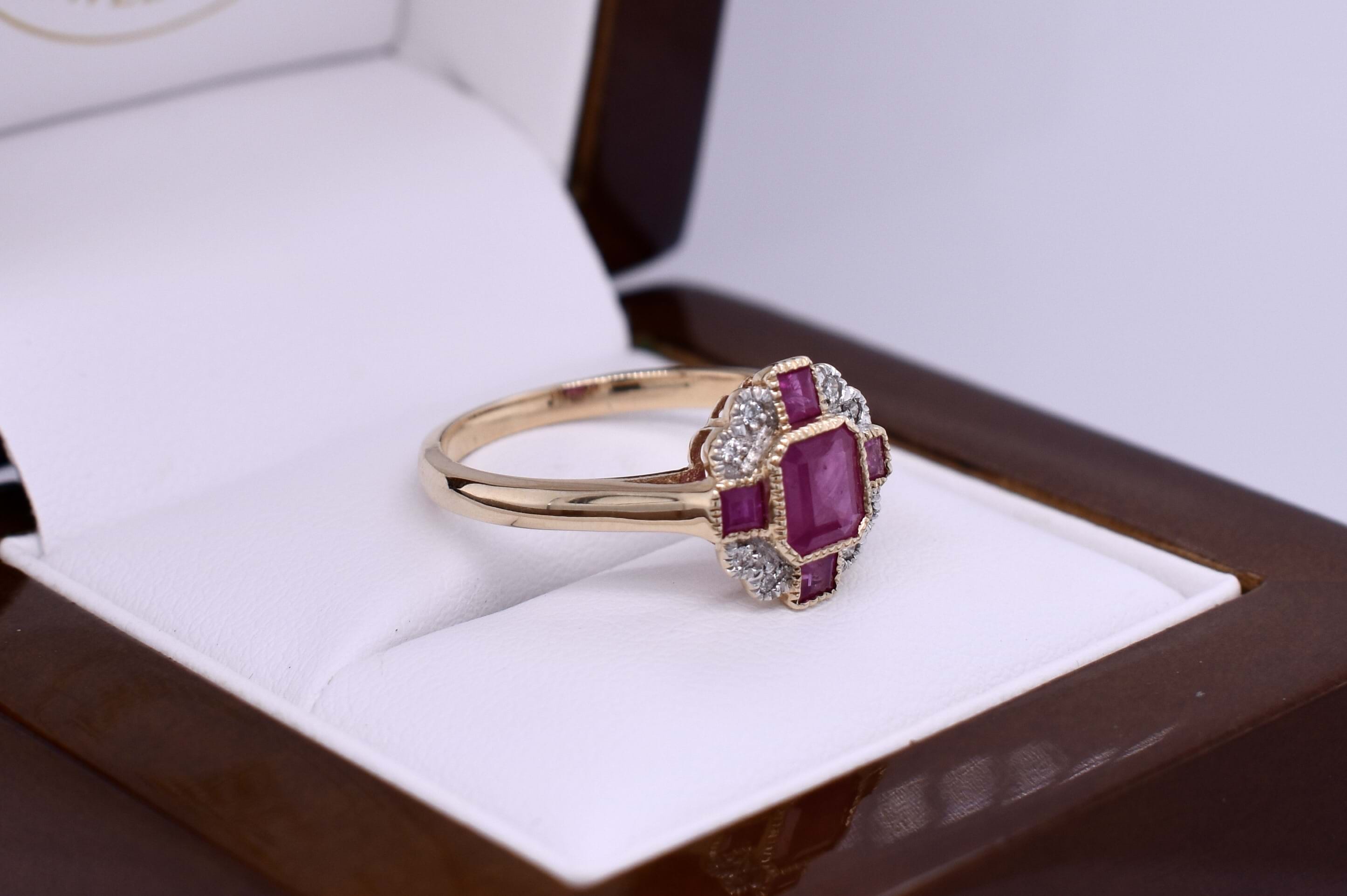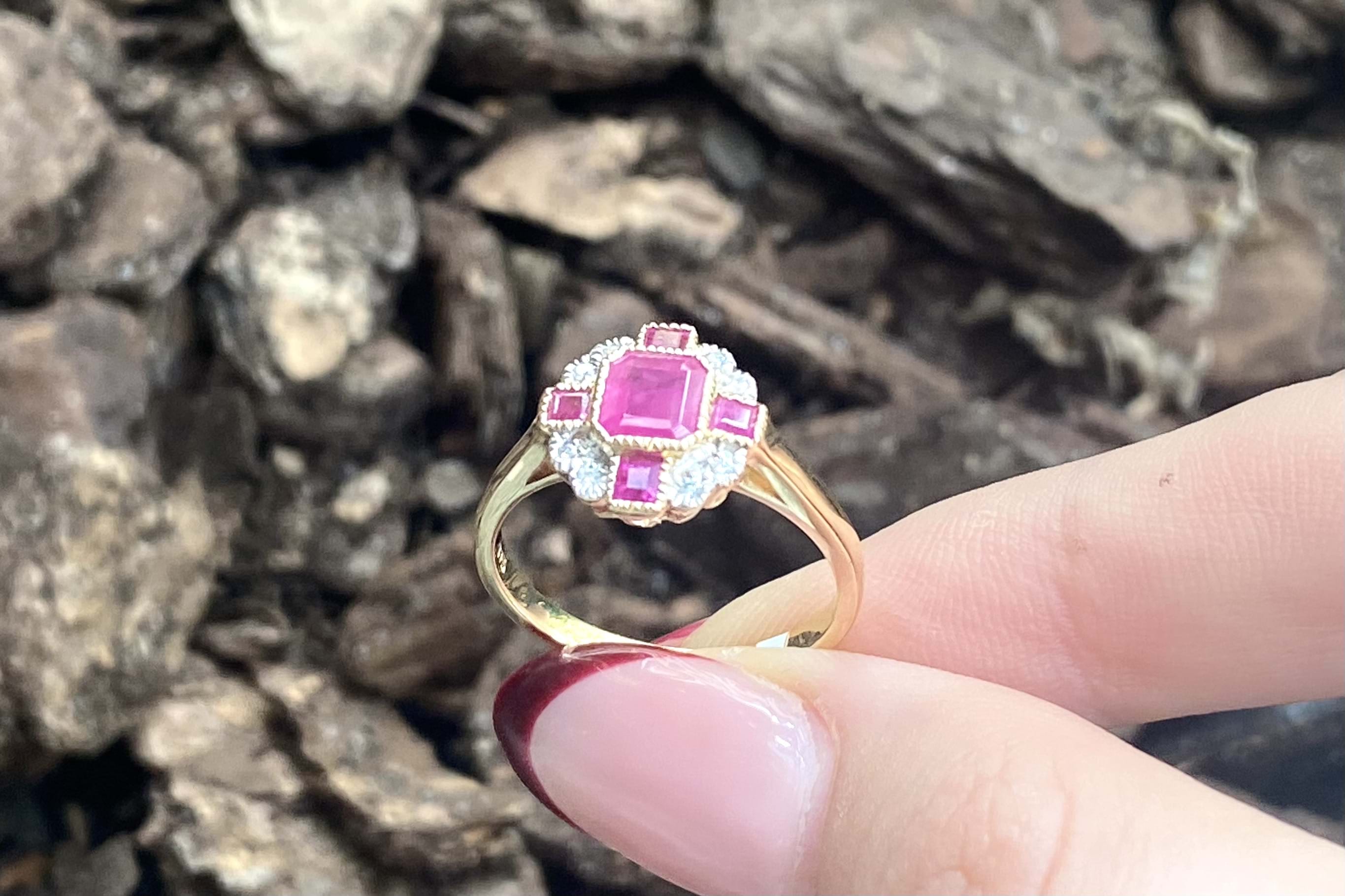 Vintage inspired dress ring crafted in 9ct yellow gold and featuring a centre millgrain bezel set emerald cut 0.75ct ruby with a smaller square at north/south/east west totalling 0.40ctd with grain set diamonds set in each corner with a scalloped millgrain border. Total diamond content 0.06ct JP1-2. Finger size N+. Independent Valuation Supplied