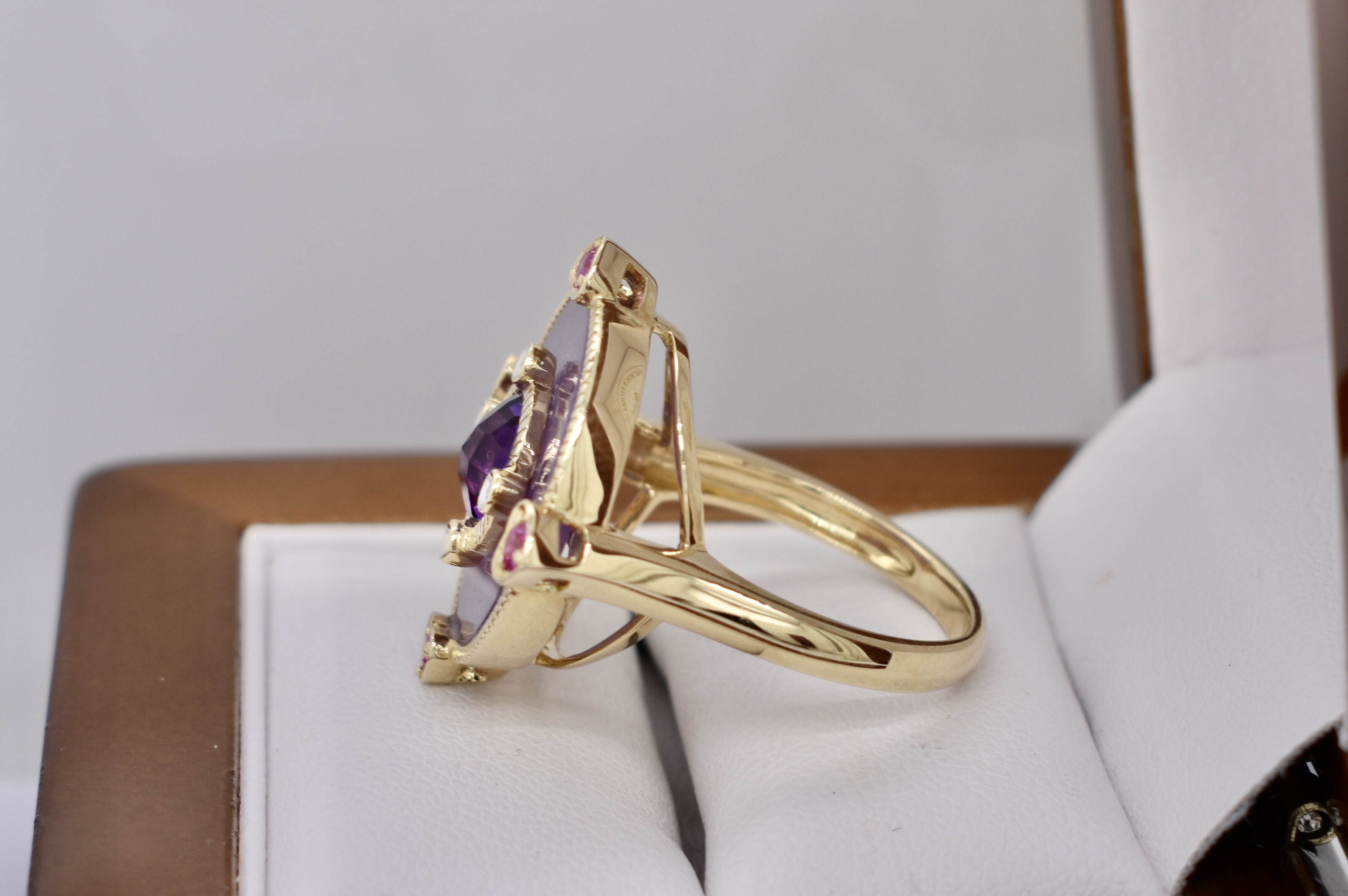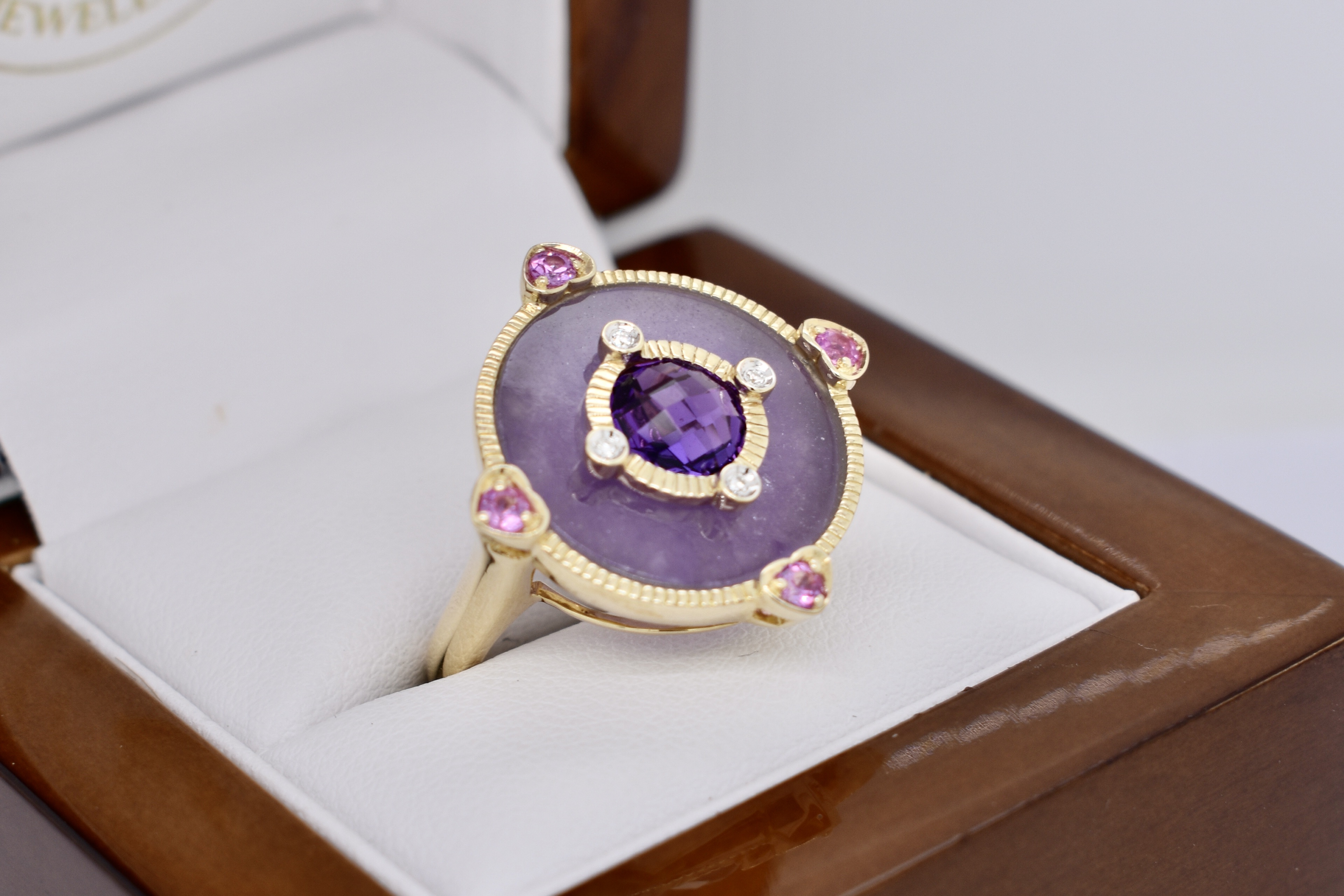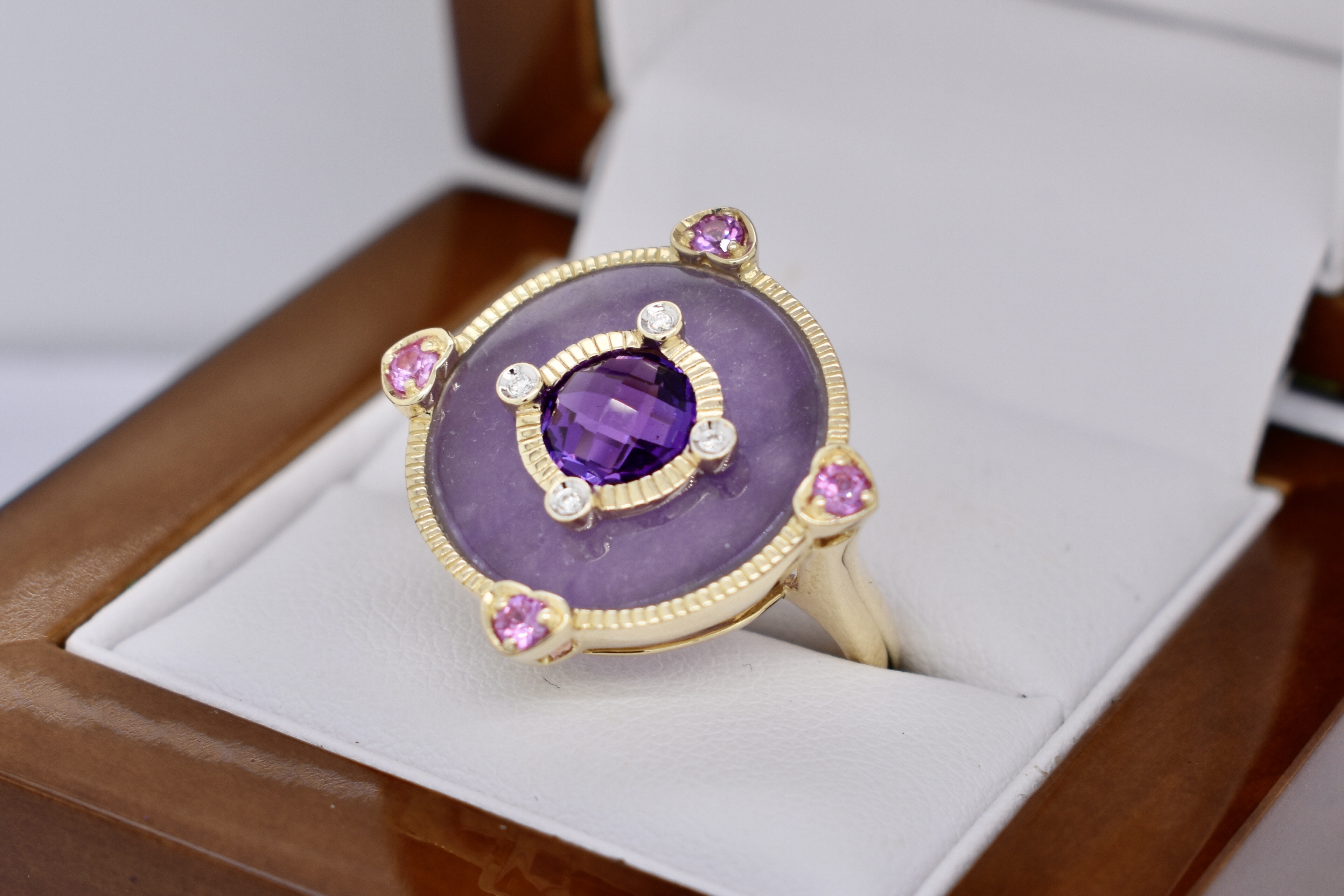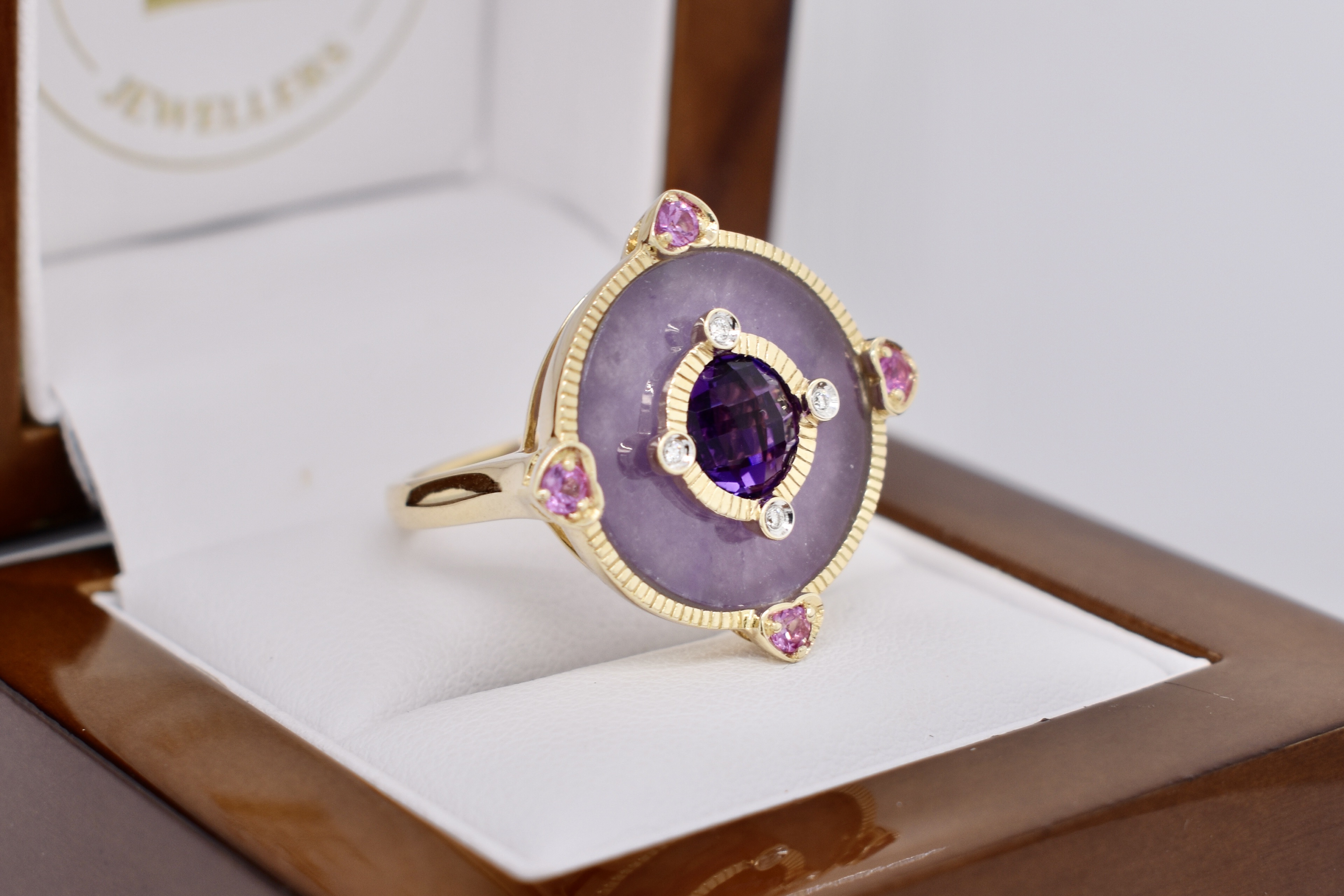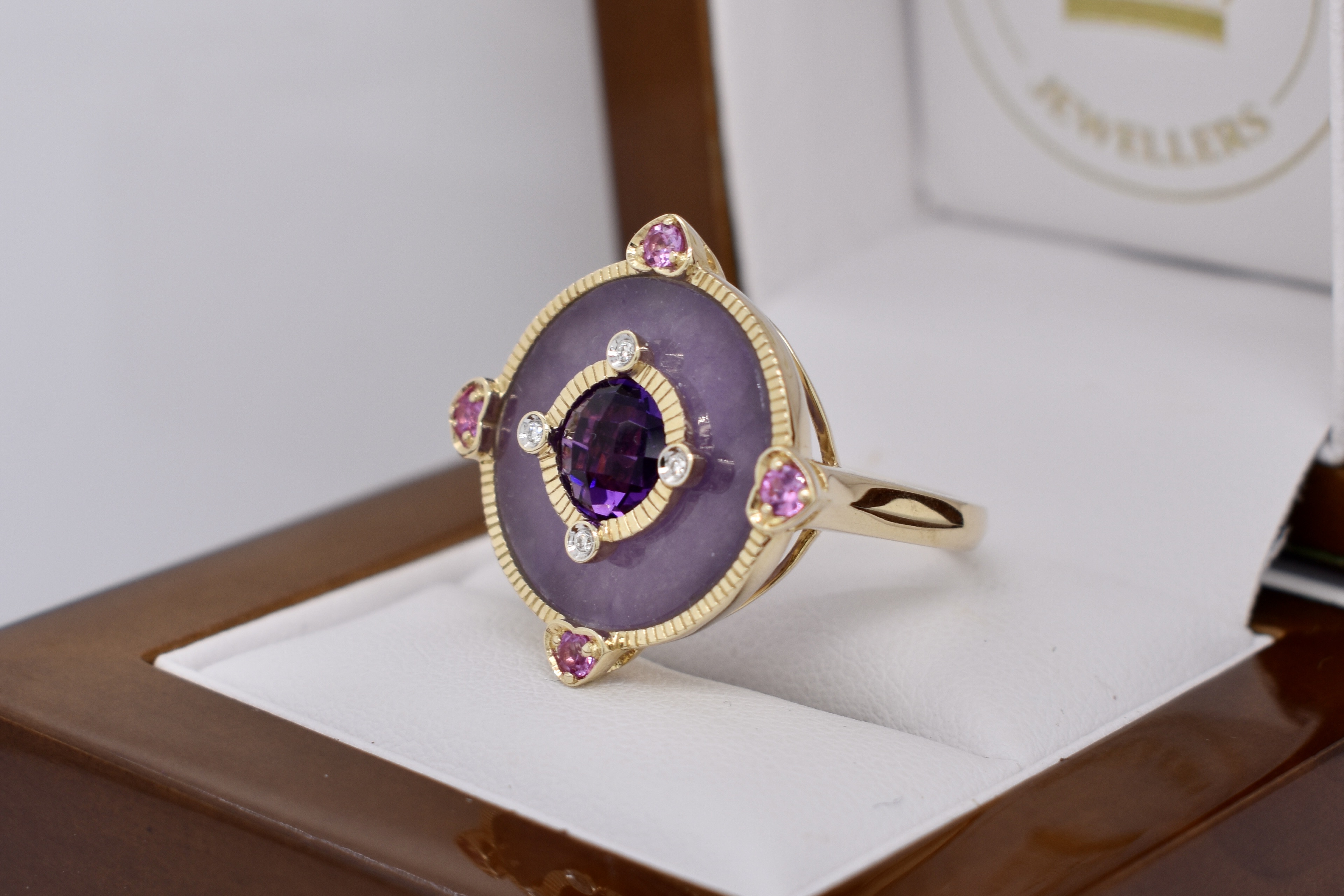 SOLD 9ct Yellow Gold Amethyst, Pink Sapphire, Diamond & Dyed Purple Jade Ring