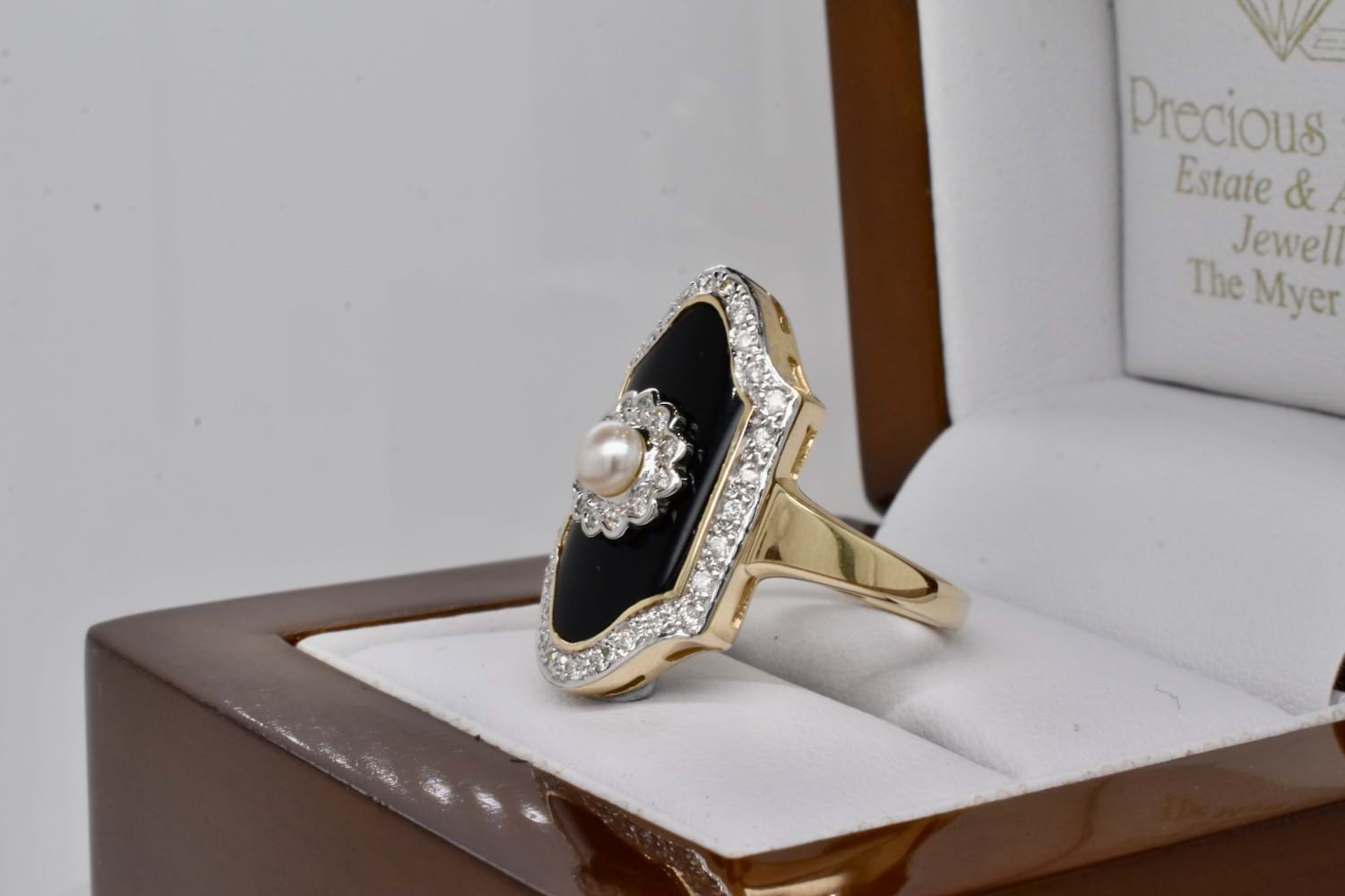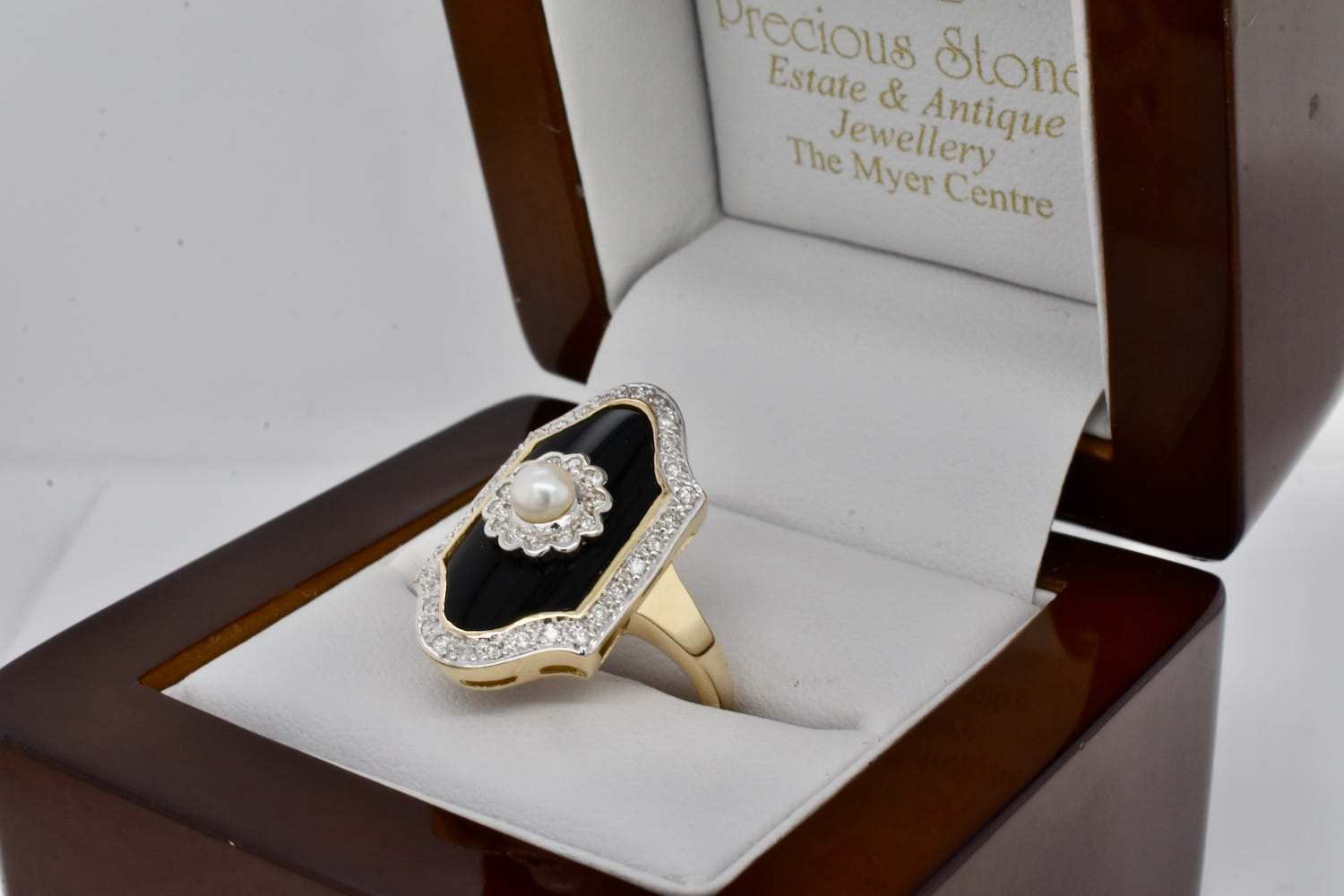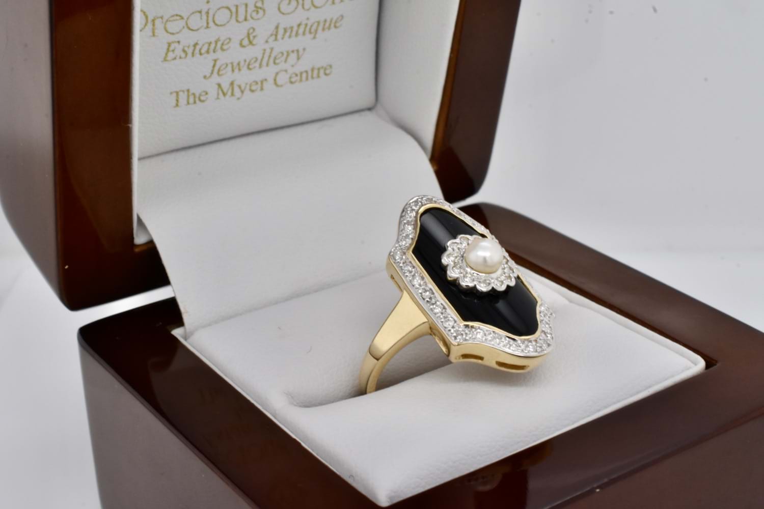 A stunning Art Deco inspired ring with a plain tapered band crafted in 9ct yellow gold, with a piece of shiny black onyx measuring 18.75 x 10mm and set with a 3.8mm round cultured pearl in a stunning diamond set flower style scalloped surround. Onyx has a bezel of gold and is surrounded by a border of more sparkling white H/P1-P2 diamonds. Total diamond weight equals 0.21ct. Finger size N+