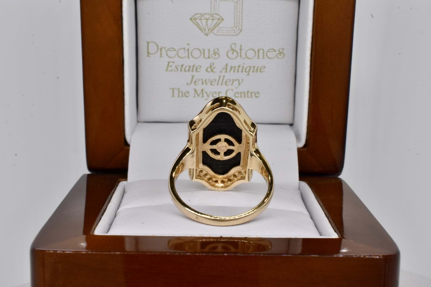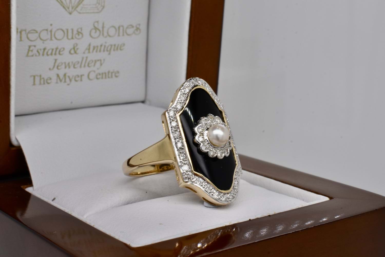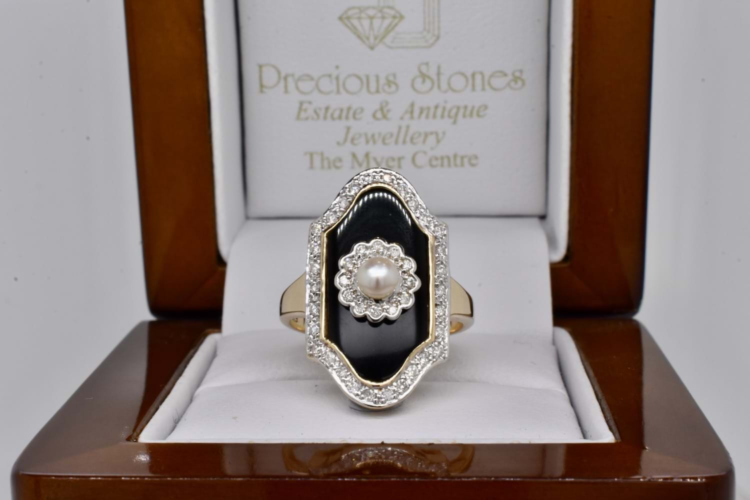 A stunning Art Deco inspired ring with a plain tapered band crafted in 9ct yellow gold, with a piece of shiny black onyx measuring 18.75 x 10mm and set with a 3.8mm round cultured pearl in a stunning diamond set flower style scalloped surround. Onyx has a bezel of gold and is surrounded by a border of more sparkling white H/P1-P2 diamonds. Total diamond weight equals 0.21ct. Finger size N+