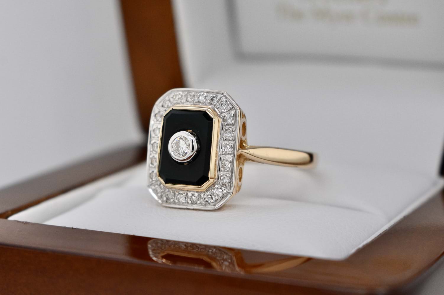 A 9ct yellow gold onyx and diamond ring featuring a sparkling 0.07ct round brilliant cut diamond white gold bezel set in a plate of black onyx with a grain set border of shimmering diamonds totalling 0.13cts. Finger size N+ Independent Valuation Supplied