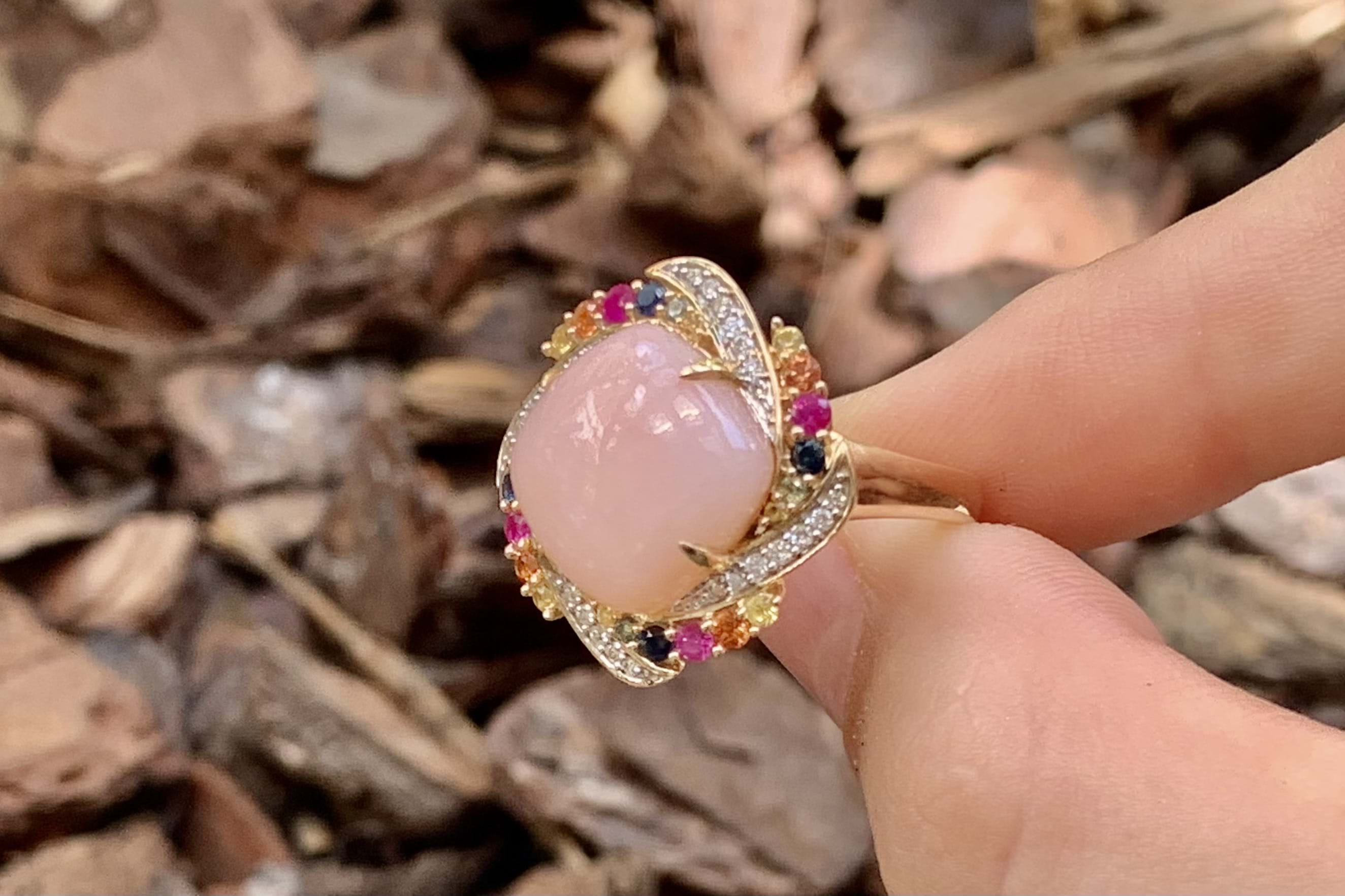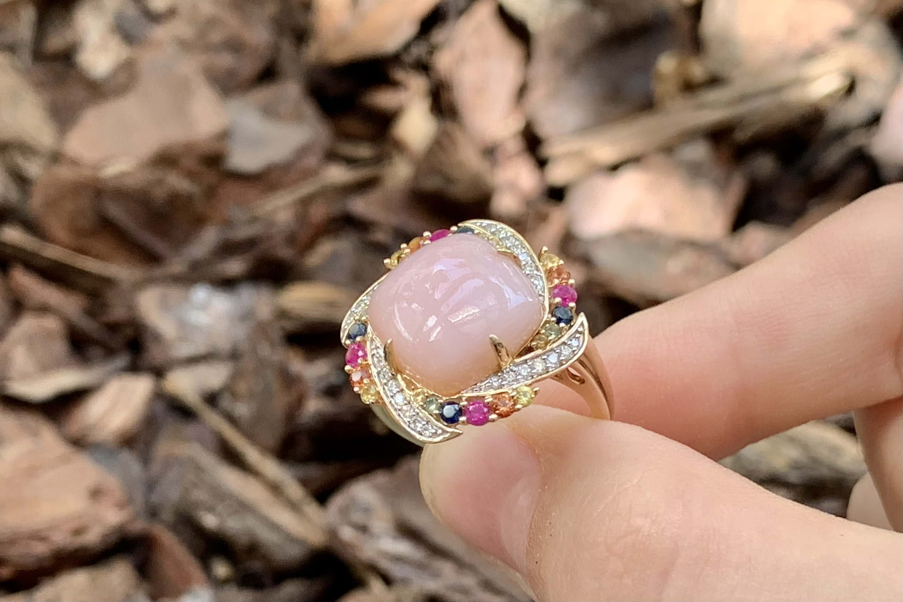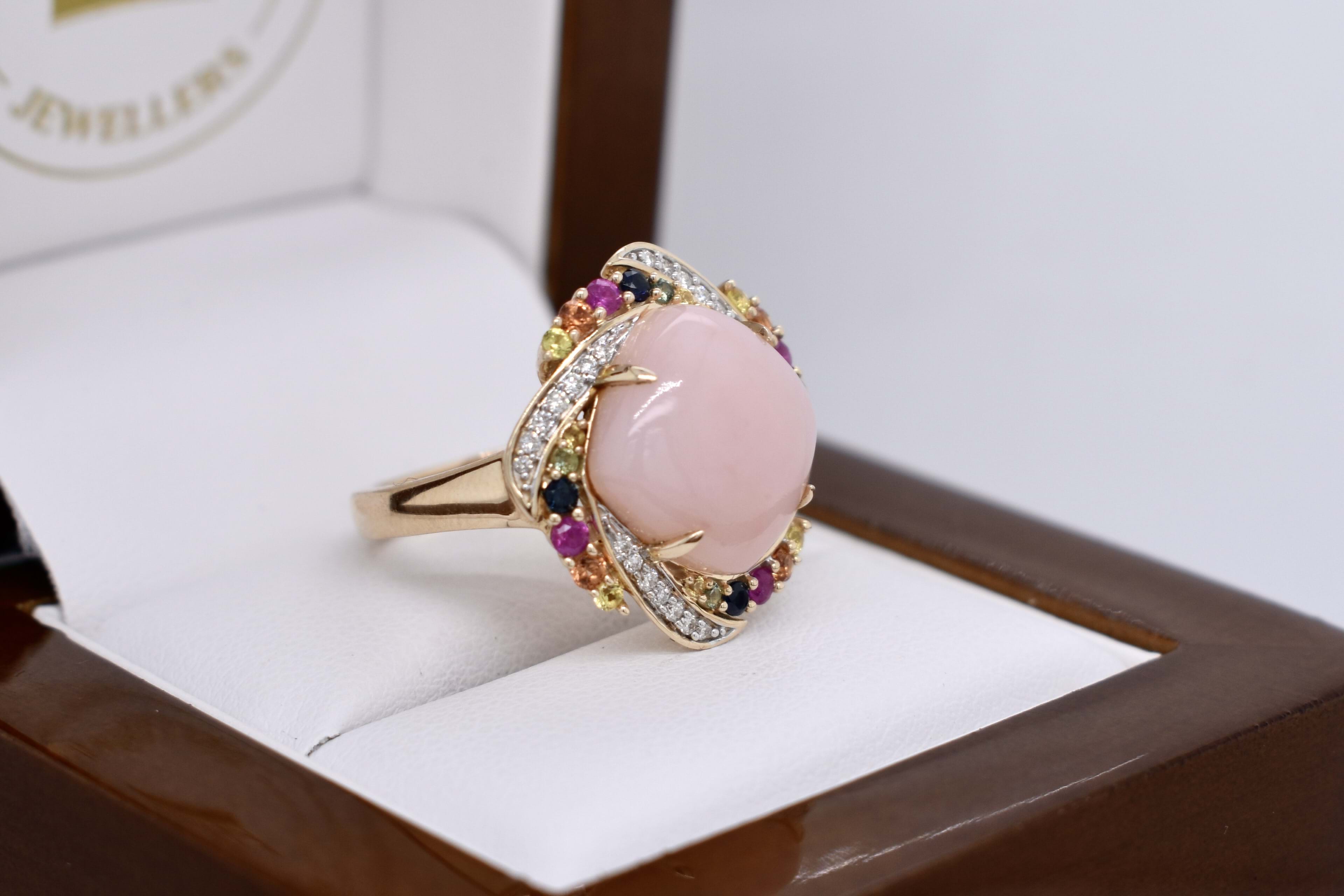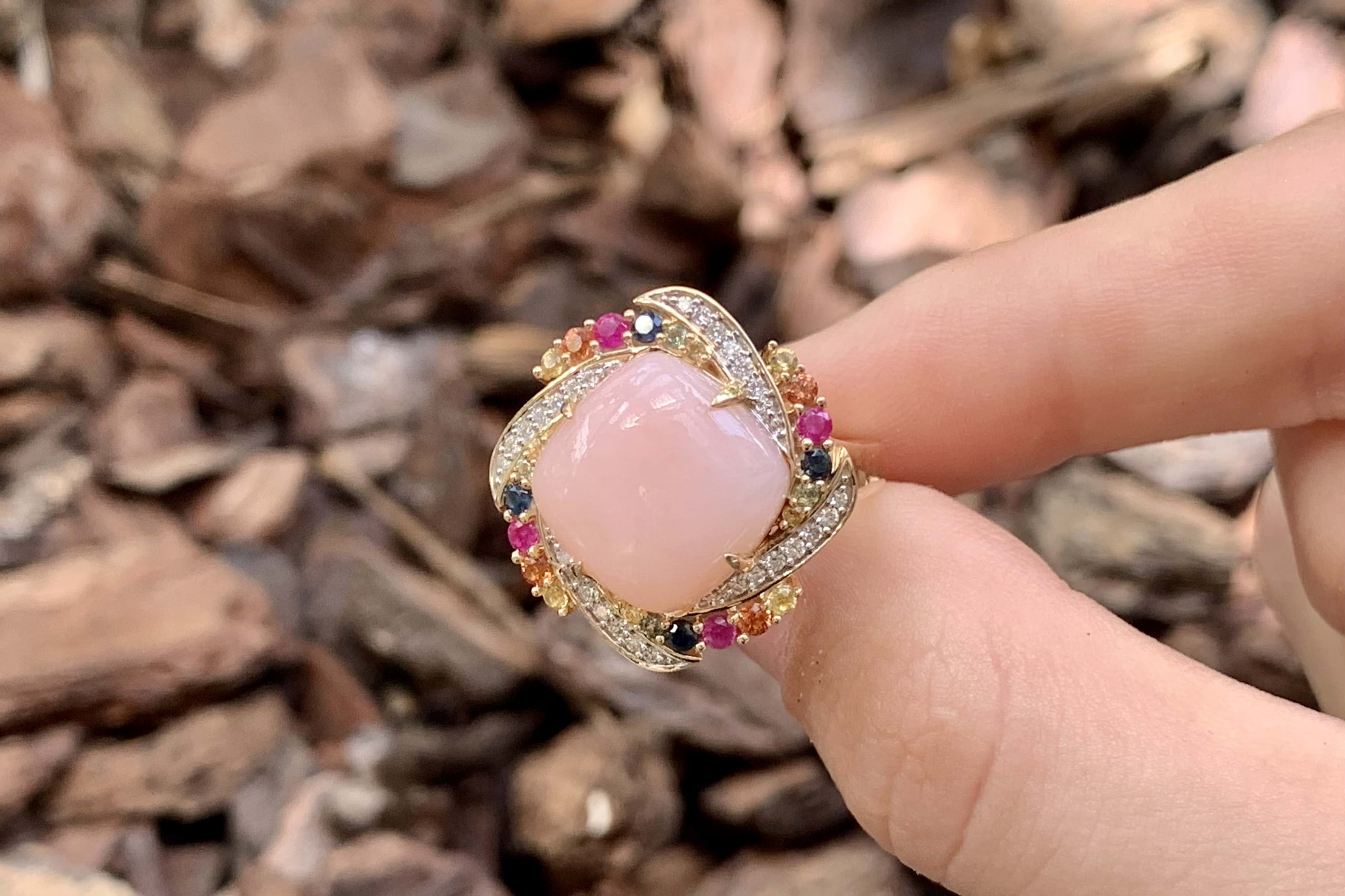 SOLD 9ct Yellow Gold Pink Opal, Multi Coloured Sapphire & 0.16ct Diamond Ring (N)