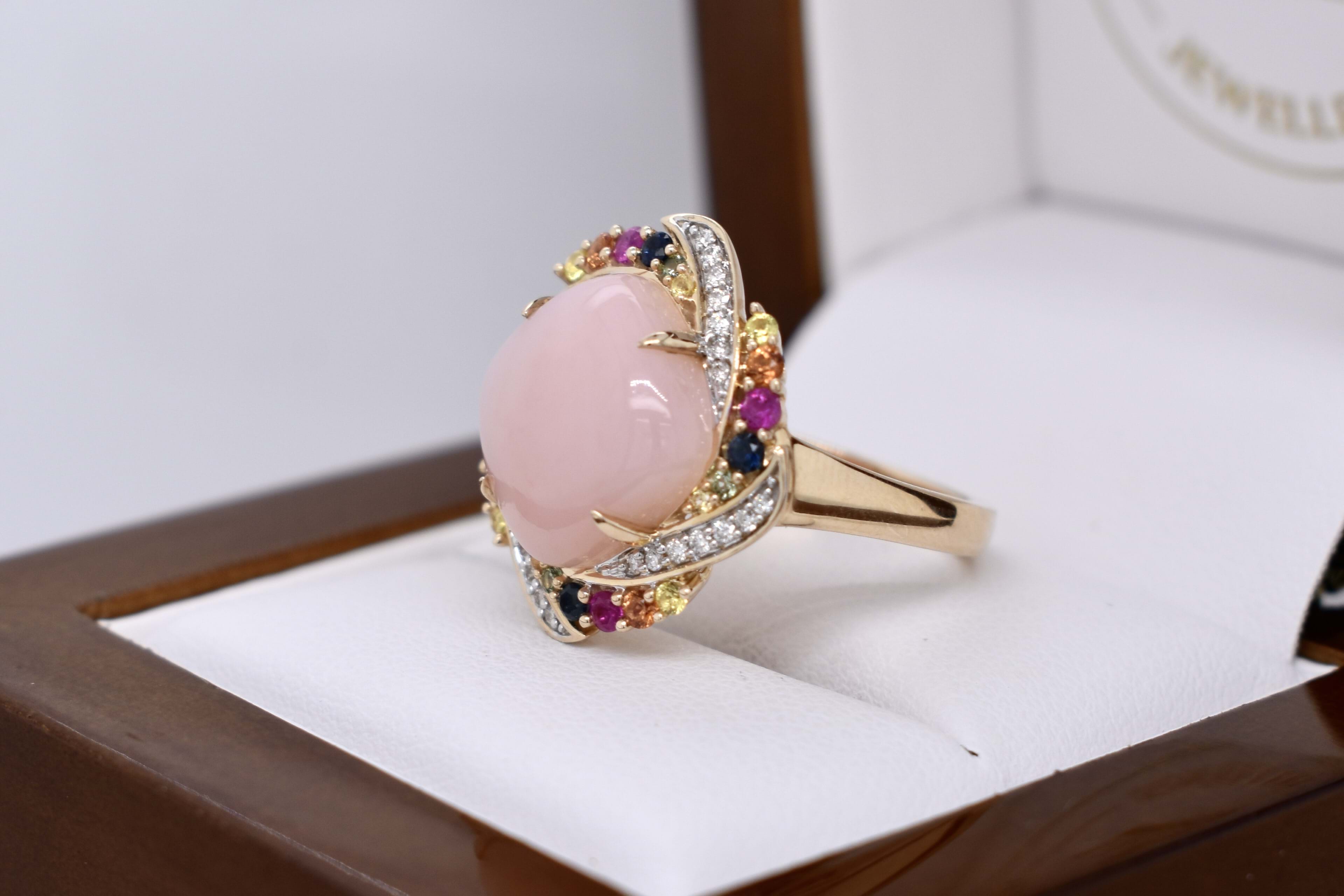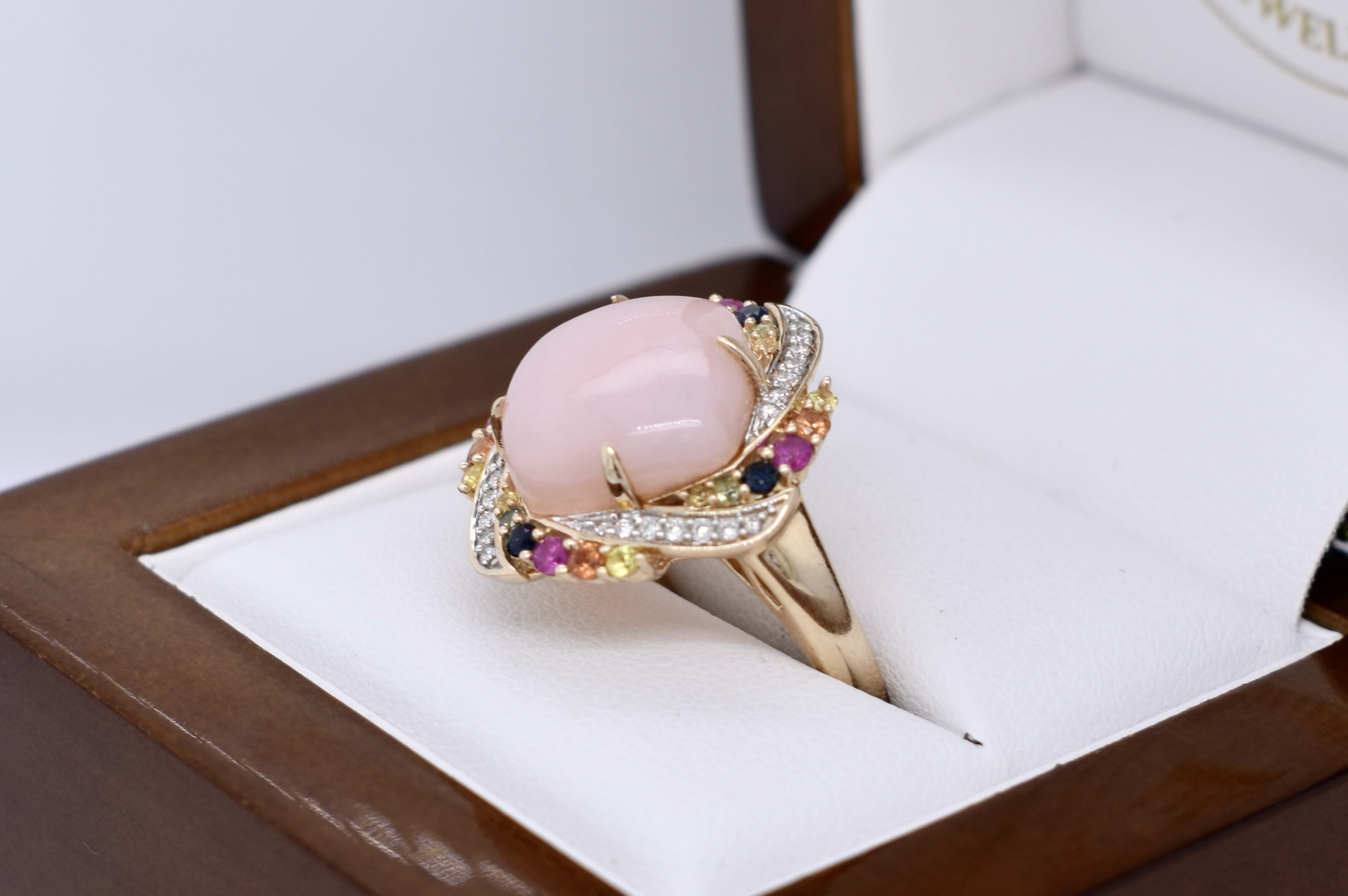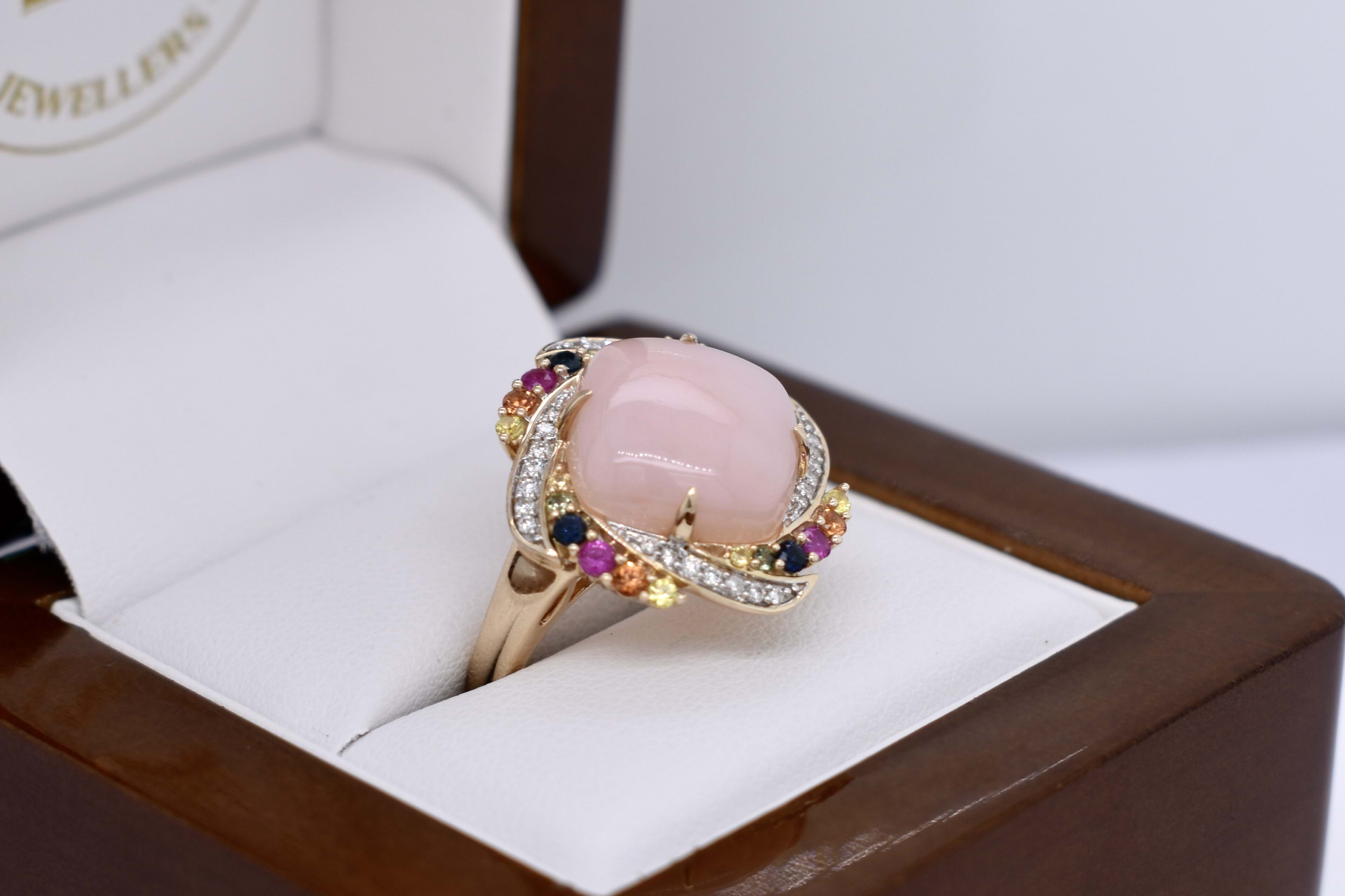 Pretty and eye-catching, this stunning 9ct yellow gold ring features a diamond shaped pink opal in the centre, four claw set, measuring 13.7x13.7mm. Surrounded by a swirl border with rows of diamonds, totalling 0.16ct, alternating with multi coloured sapphires (yellow, orange, pink and blue). Finger size N.