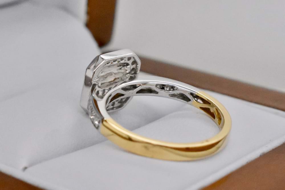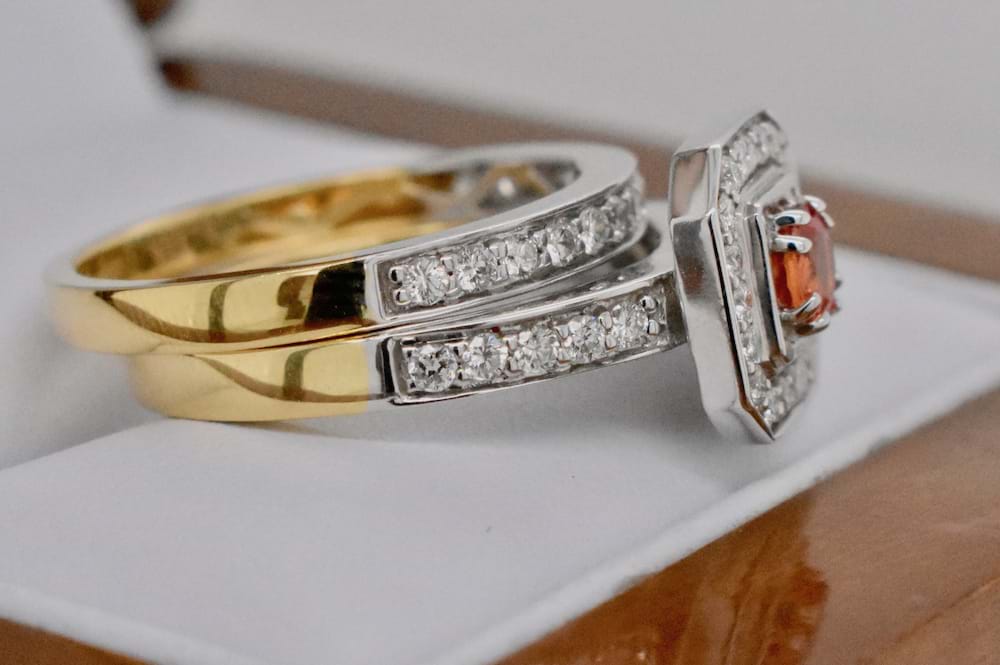In 18ct yellow gold and white gold this stunning, corner cut, square halo ring features a vivid natural 0.30ct orange sapphire surrounded by 0.30cts of sparkling diamonds both in the halo and down the shoulders. This ring is priced with a matching two tone band (not pictured) containing 0.15cts of diamonds. Available with or without matching band. Independent Valuations Supplied.