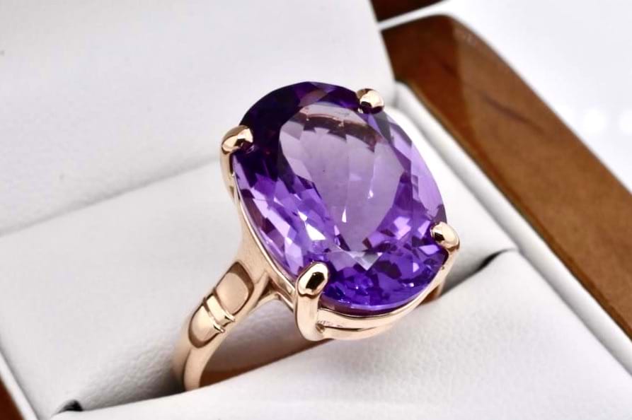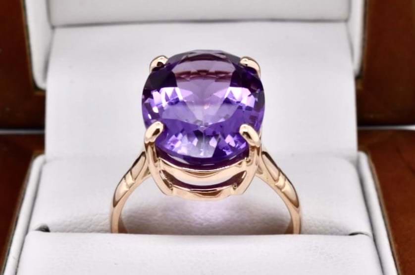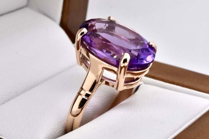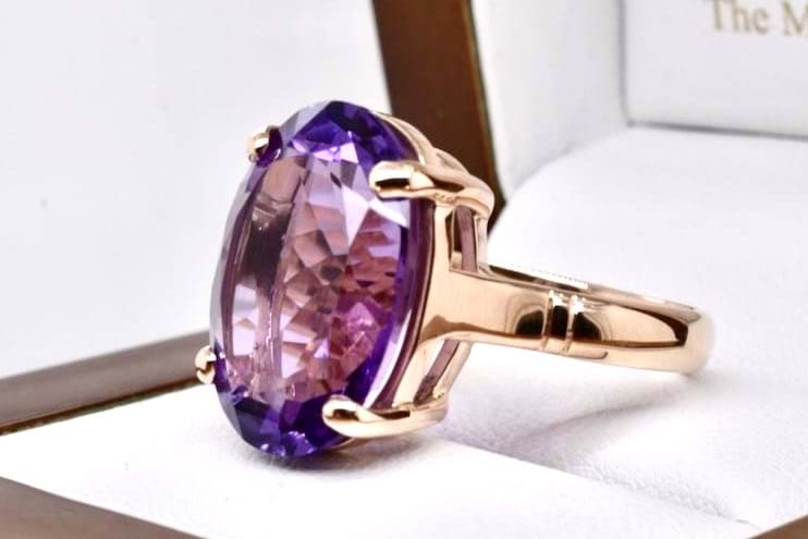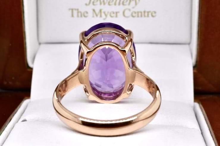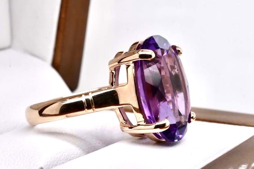 A gorgeous warm combination of purple and rose gold, this ring has been handcrafted in 9ct rose gold and is set with a resplendent, oval shape 12.50ct amethyst in four claws with a plain band with two notch detailing. Finger size S+