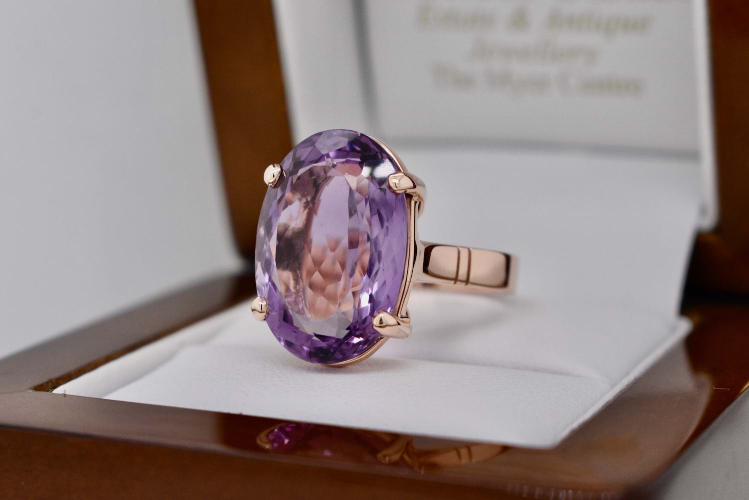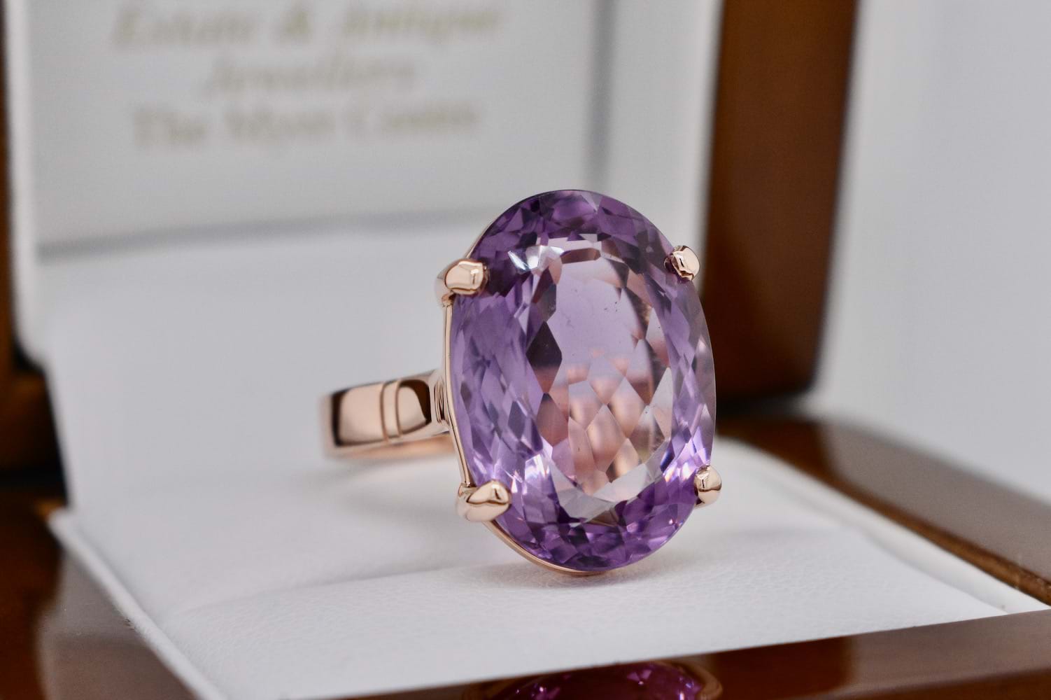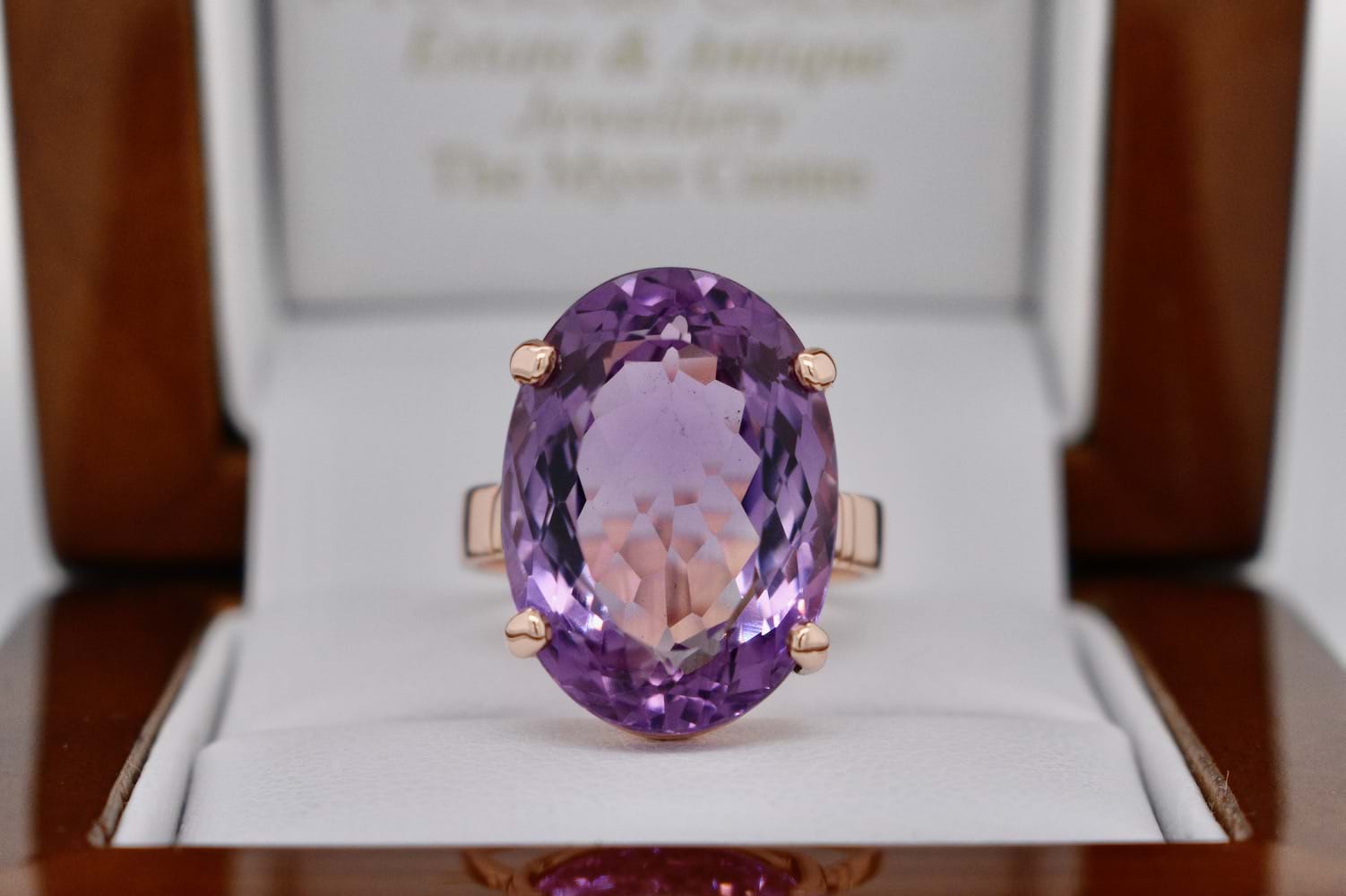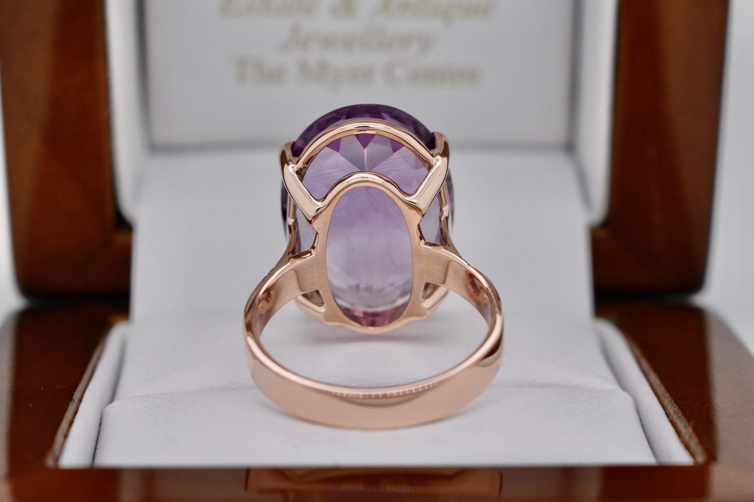 A stunning and sizeable 12ct oval cut amethyst which measures approximately 19 x 13.5mm, in a handmade 9ct rose gold setting with 4 claws and a plain band. Finger size M. Independent Valuation Supplied