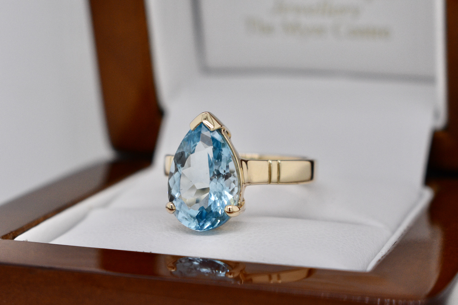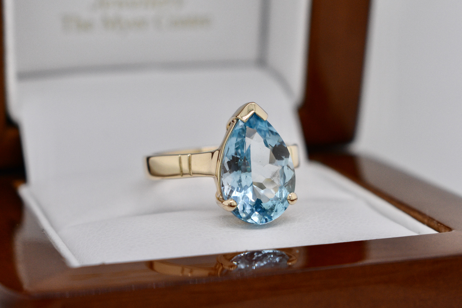 Gorgeous 4.25ct pear shape sky blue topaz measuring approx. 13 x 8.5mm in a handmade 9ct yellow gold setting of v cap and two claws with a flat band. Finger size M+. Independent Valuation Supplied