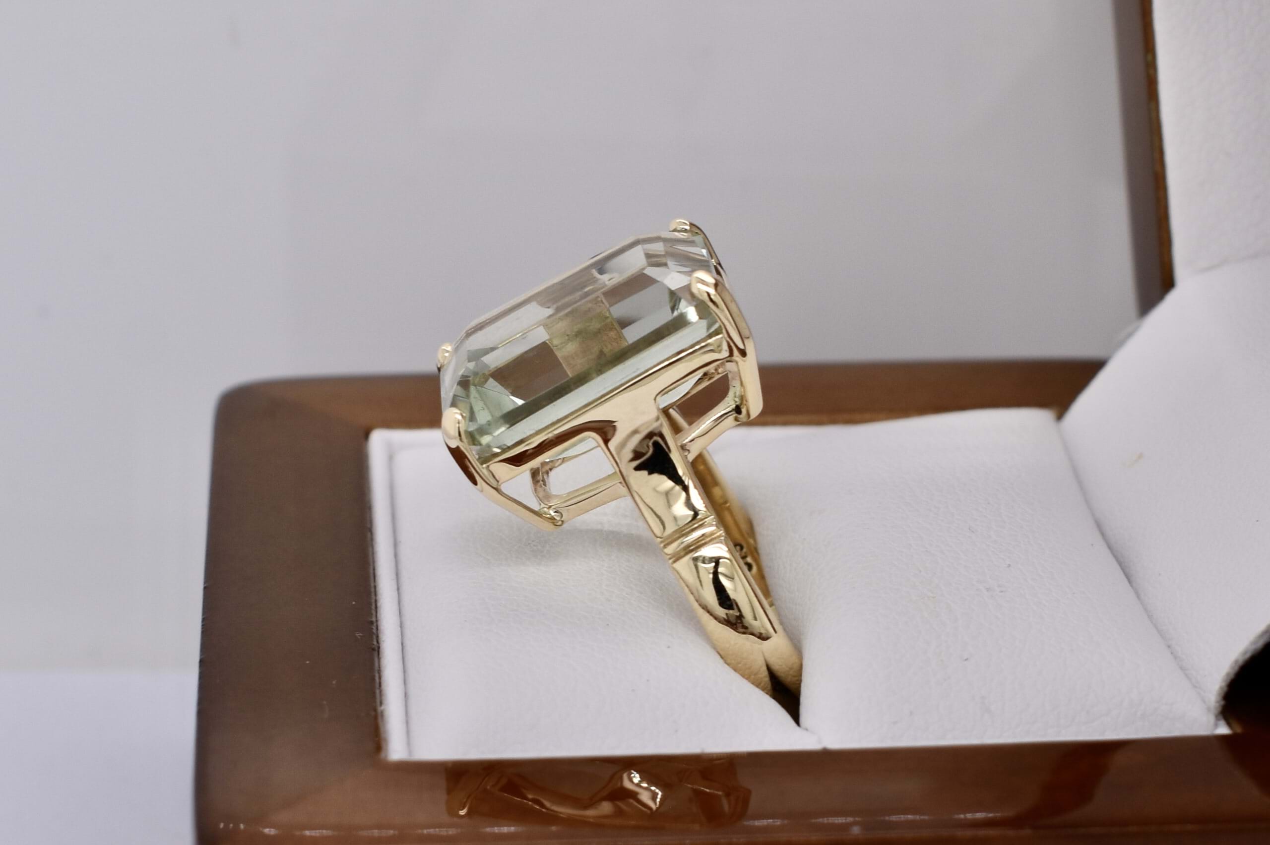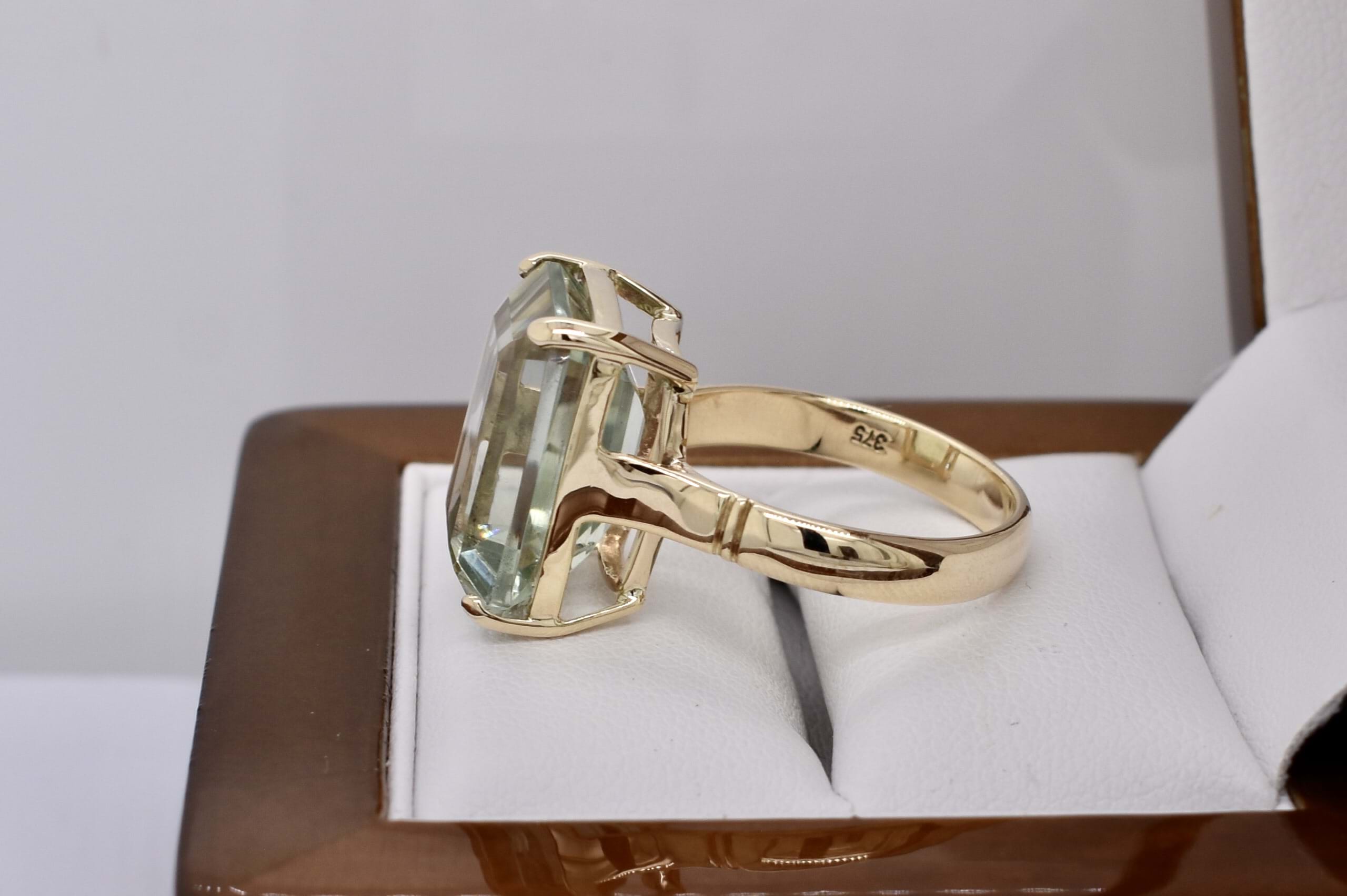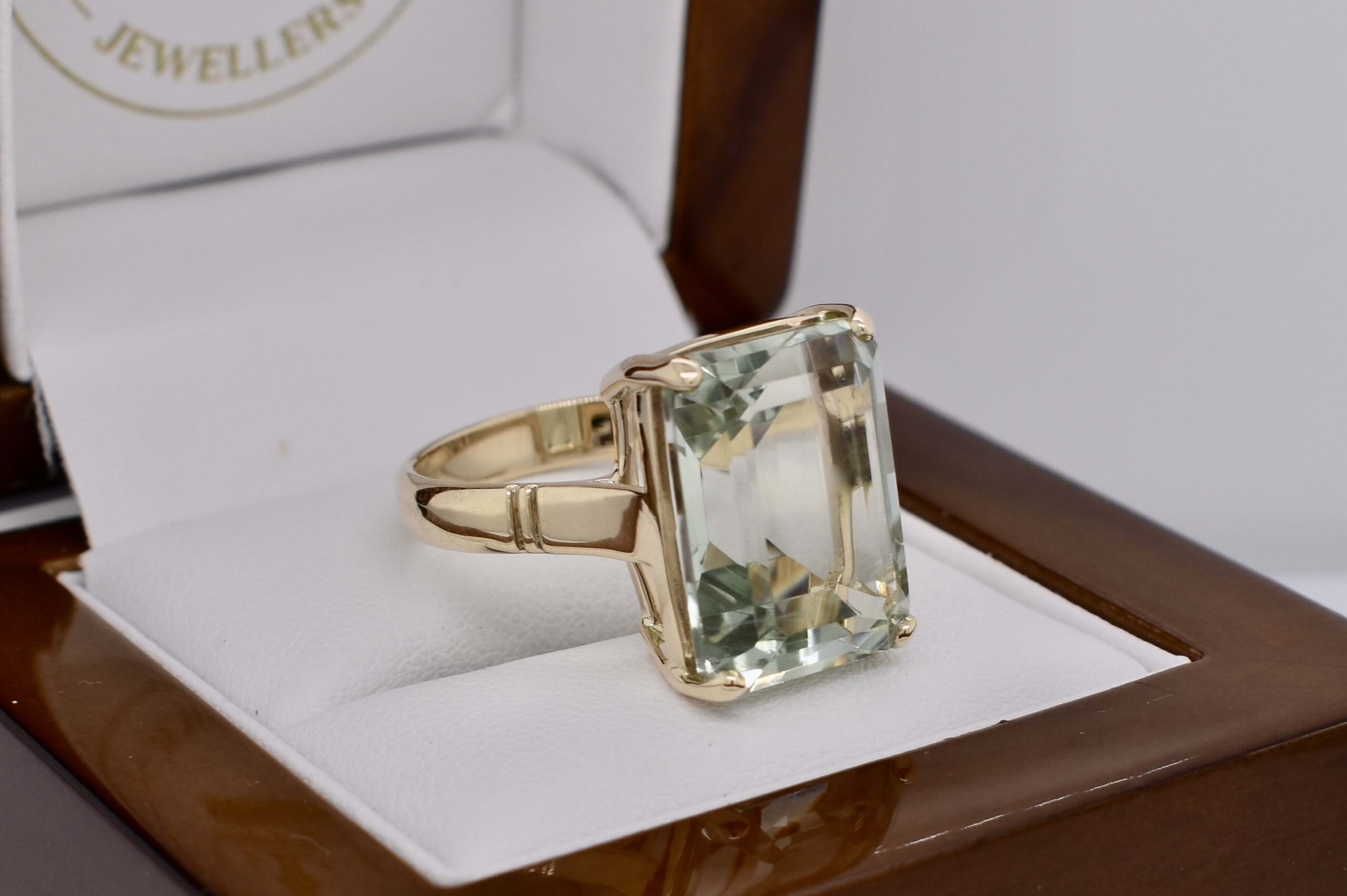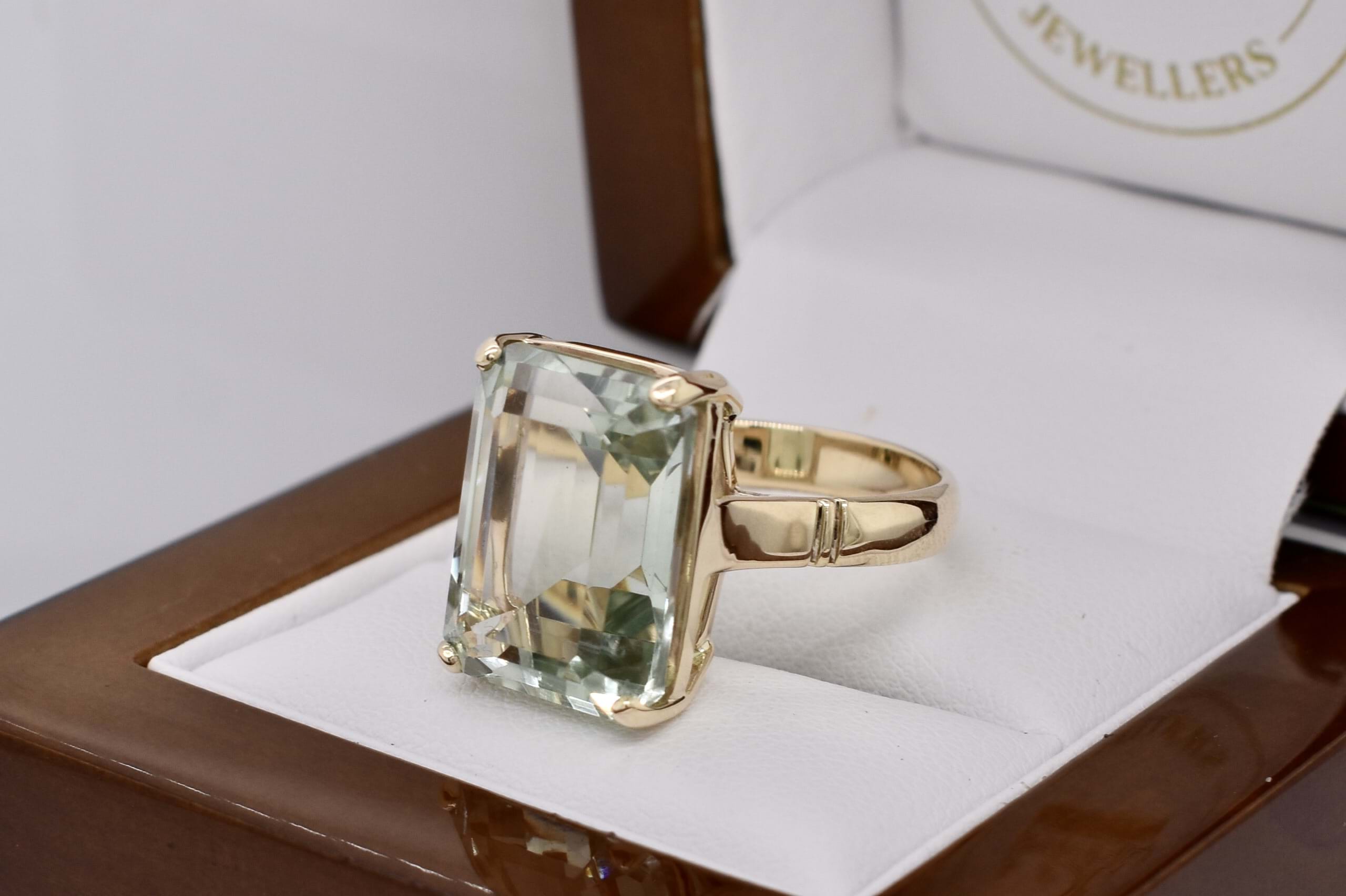 Hand crafted in 9ct yellow gold, this lovely emerald cut prasiolite ring, measuring a sizeable 16.8x12.2mm. Four claw set on a plain gold band. Finger size Q.