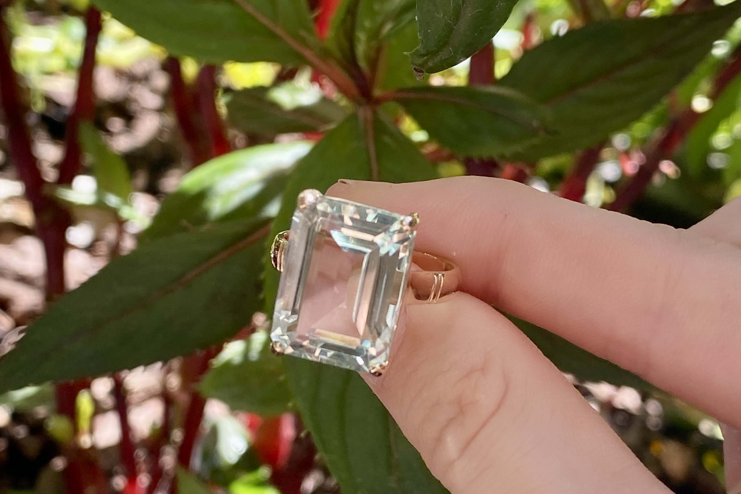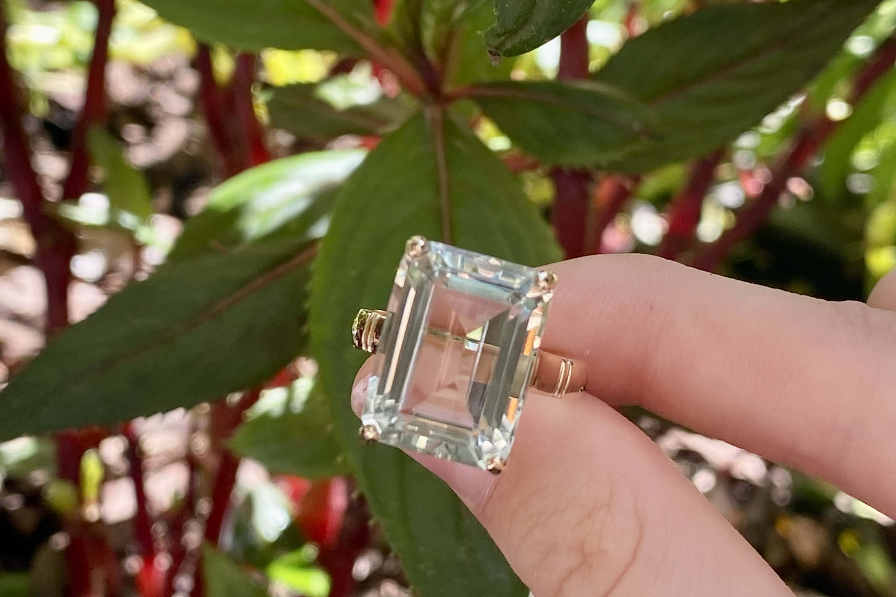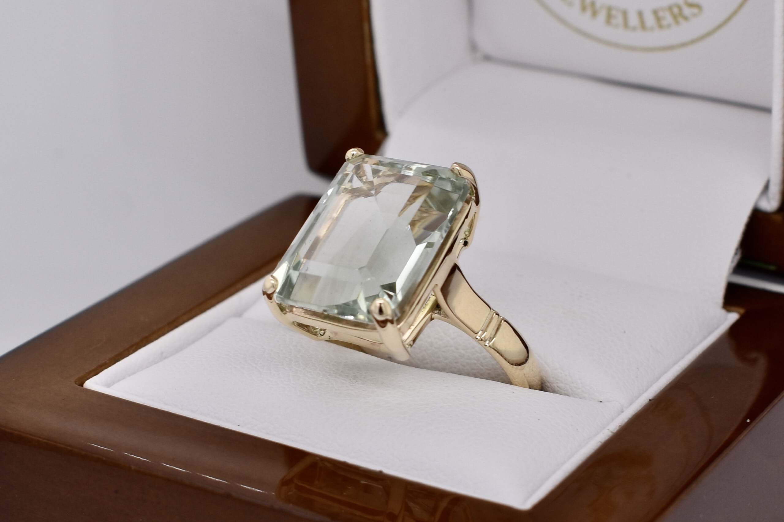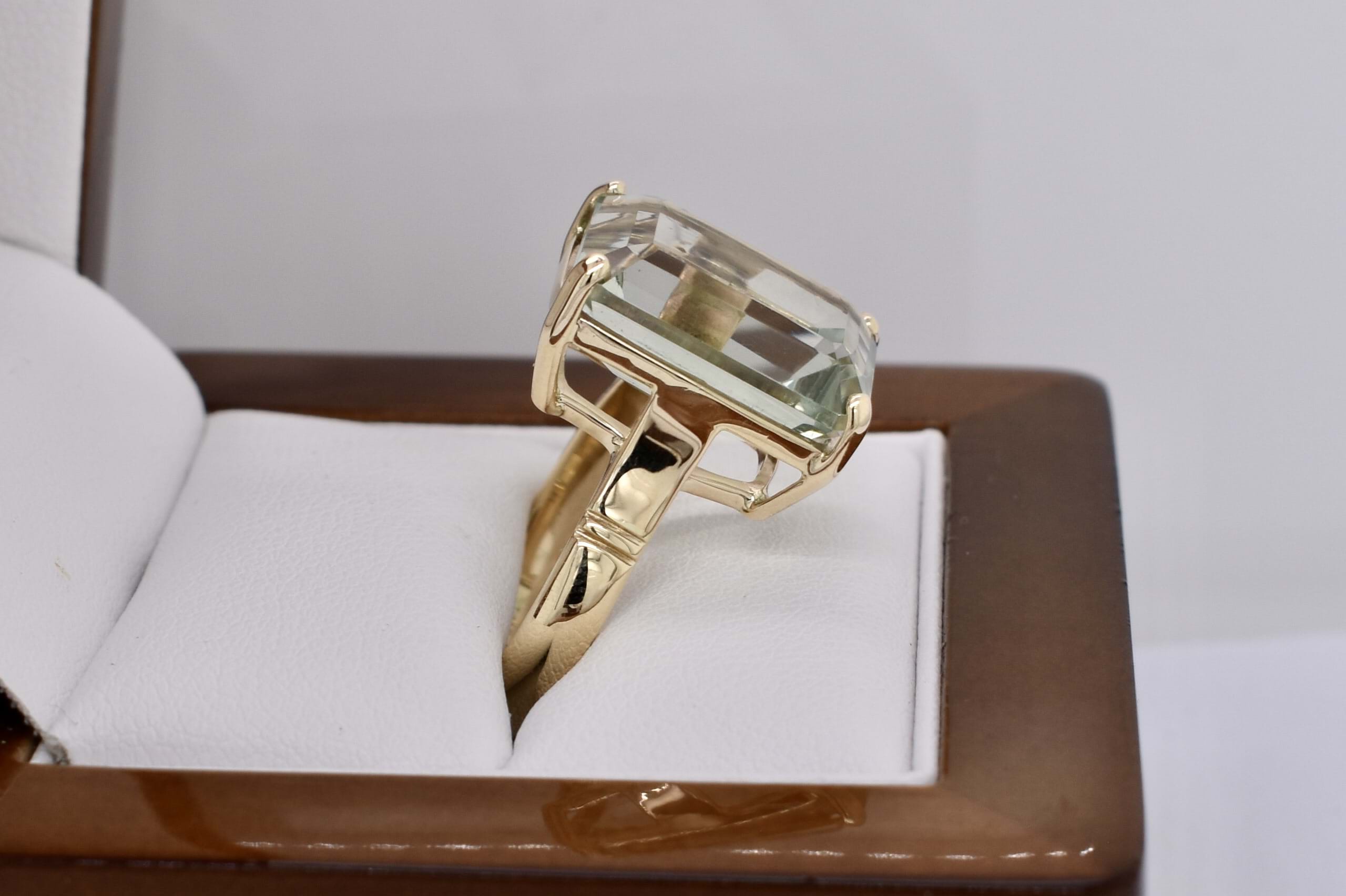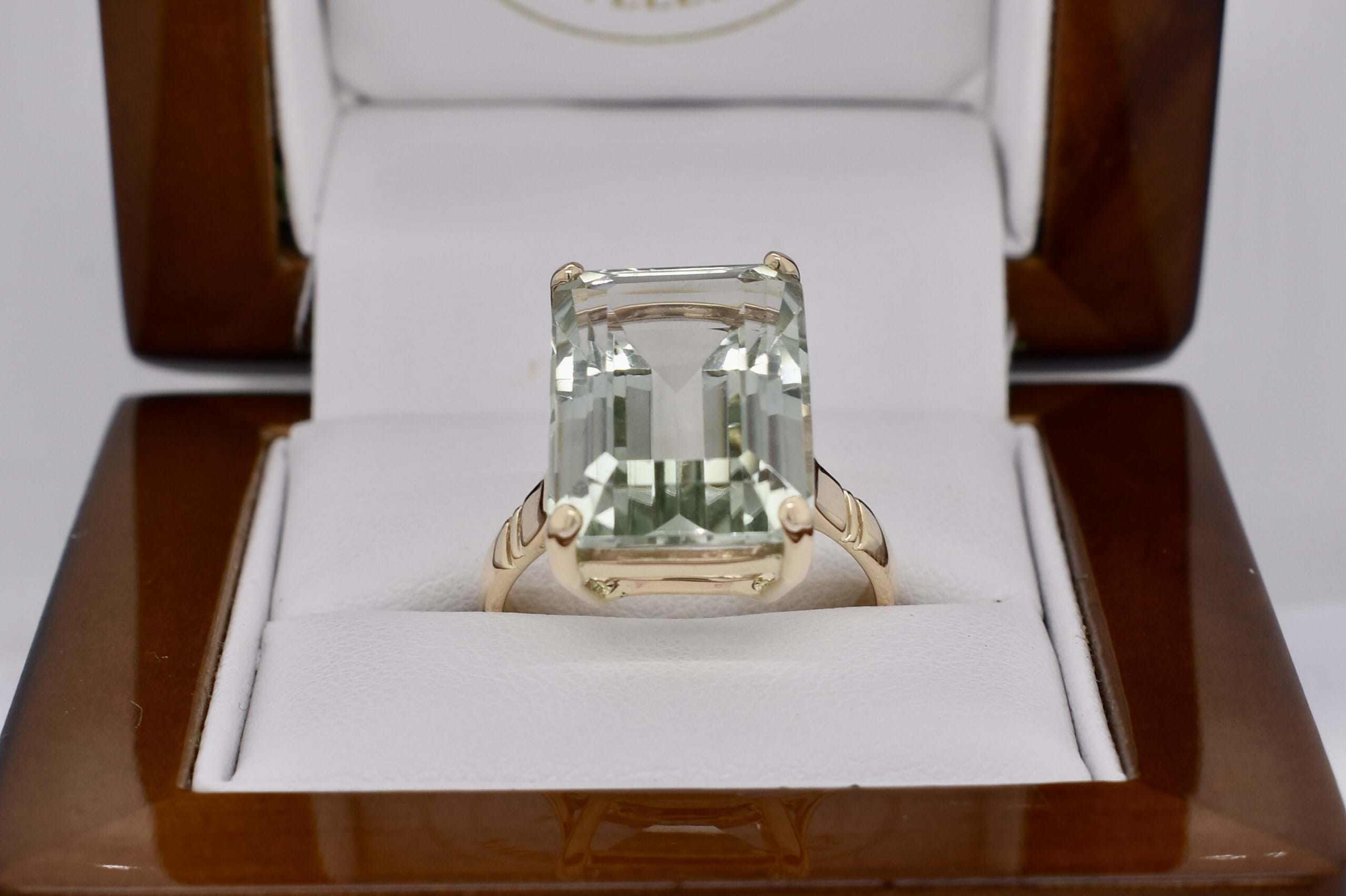 Hand crafted in 9ct yellow gold, this lovely emerald cut prasiolite ring, measuring a sizeable 16.8x12.2mm. Four claw set on a plain gold band. Finger size Q.
