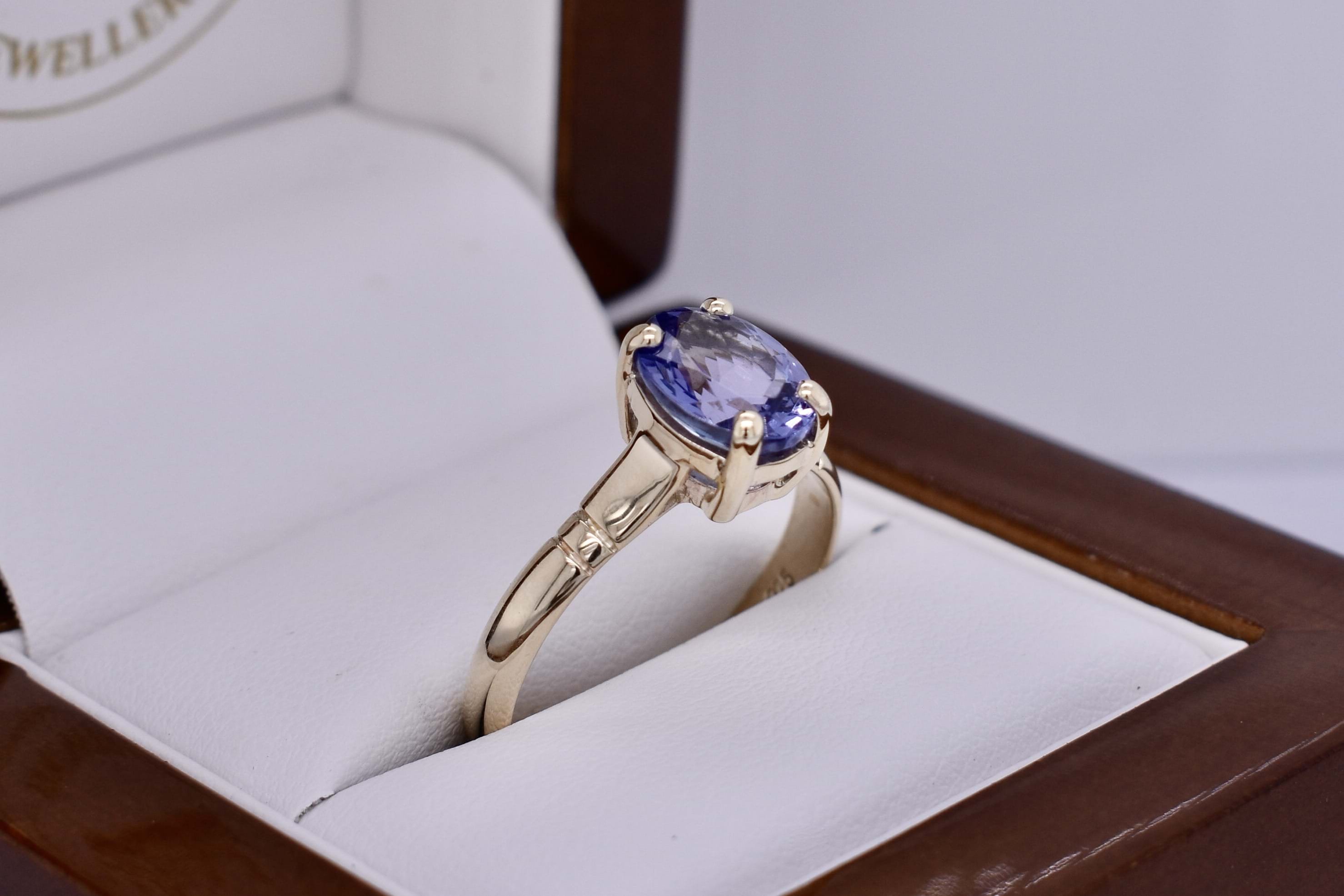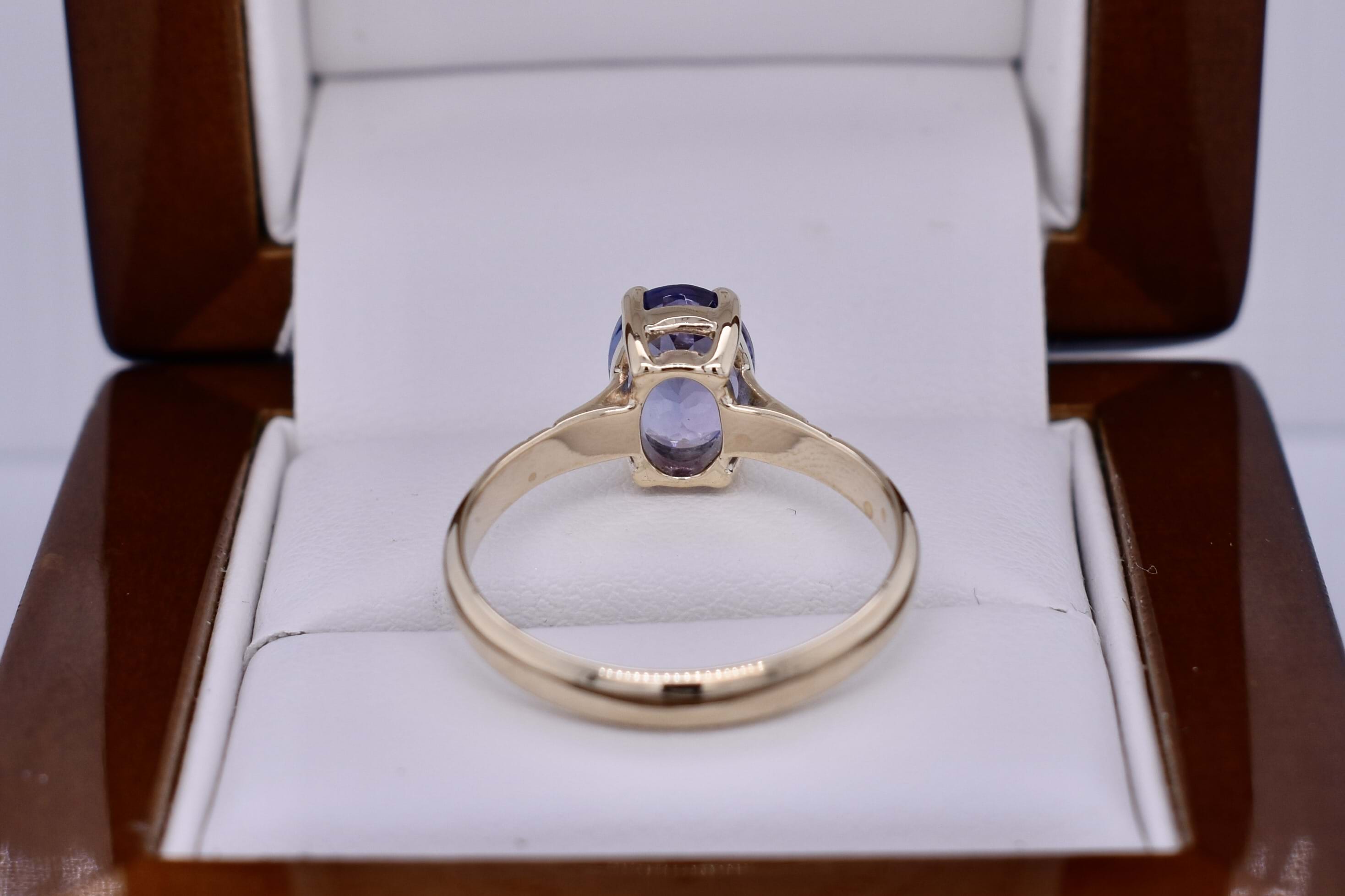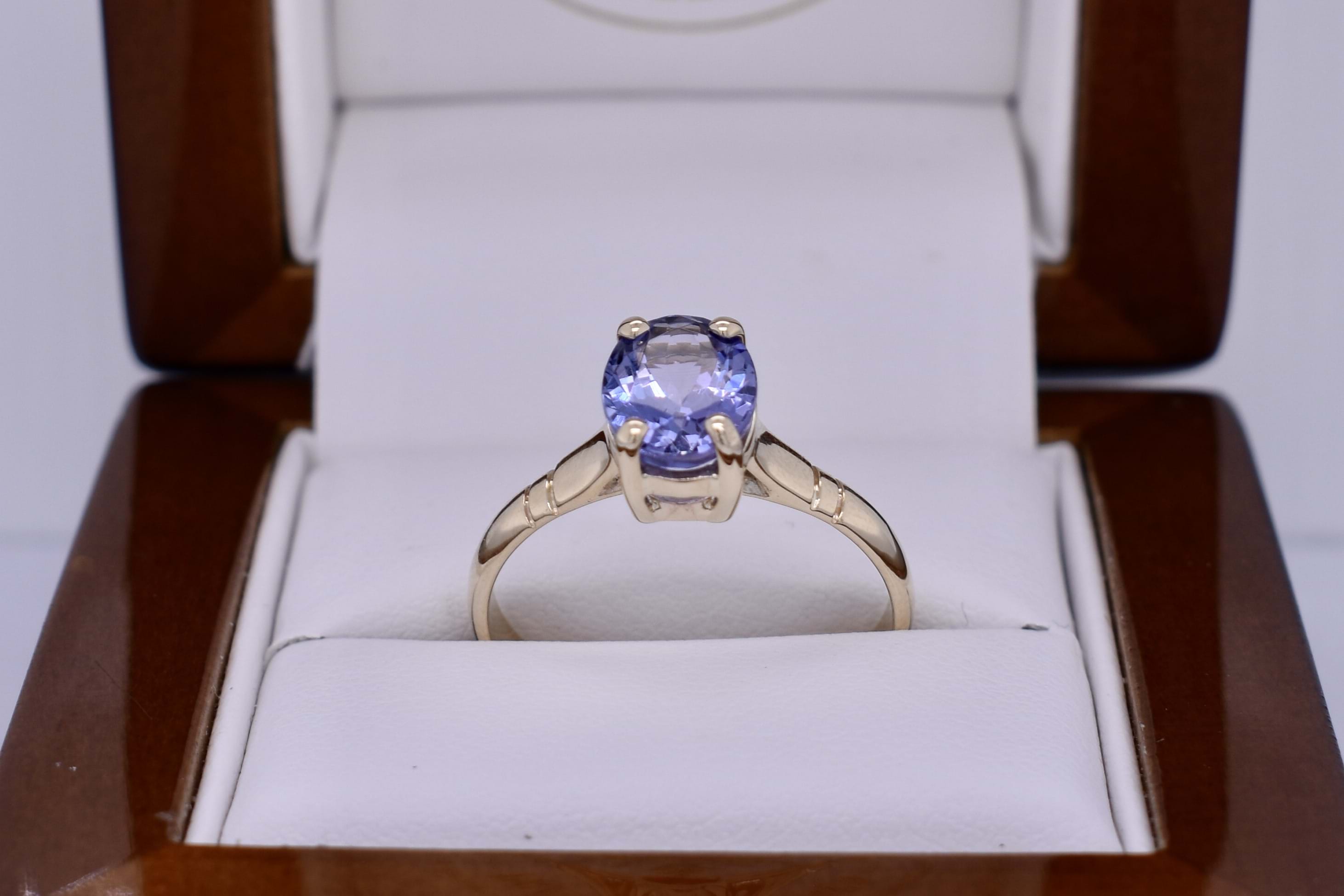 Hand crafted in 9ct yellow gold, this gorgeous oval 9.5x7.1mm tanzanite ring is four claw set with a plain grooved band. Finger size S.