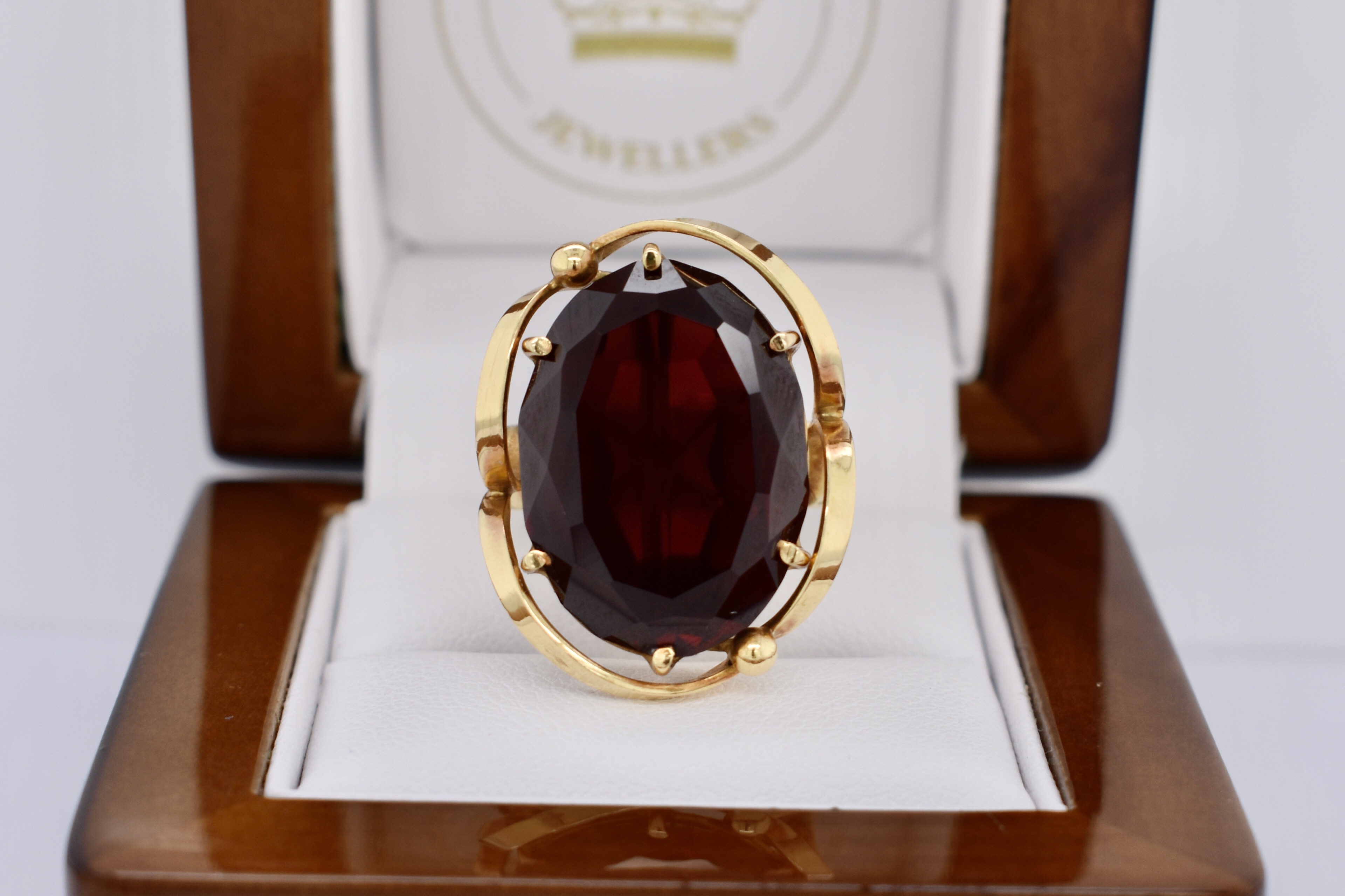 SOLD 18ct Yellow Gold Large Synthetic Ruby Oval Swirl Border Ring (P)