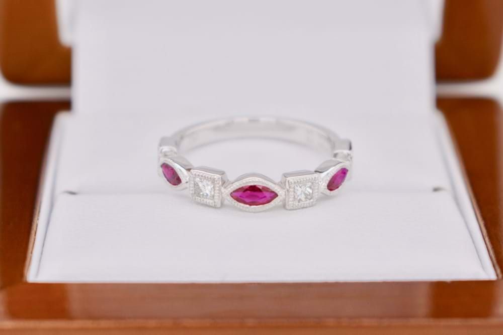 SOLD 18ct White Gold 0.48ct Marquise Ruby & 0.36cts Princess Cut Diamond Deco Style Band