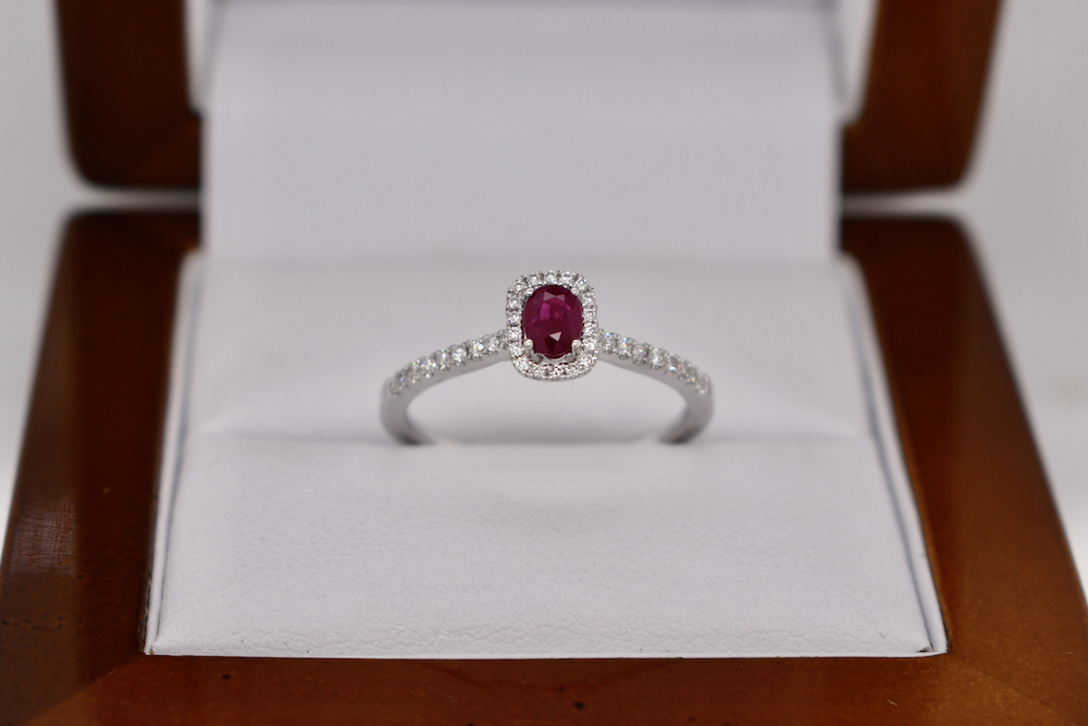 SOLD 18ct White Gold 0.27ct Ruby & 0.17ct Diamond Halo Ring