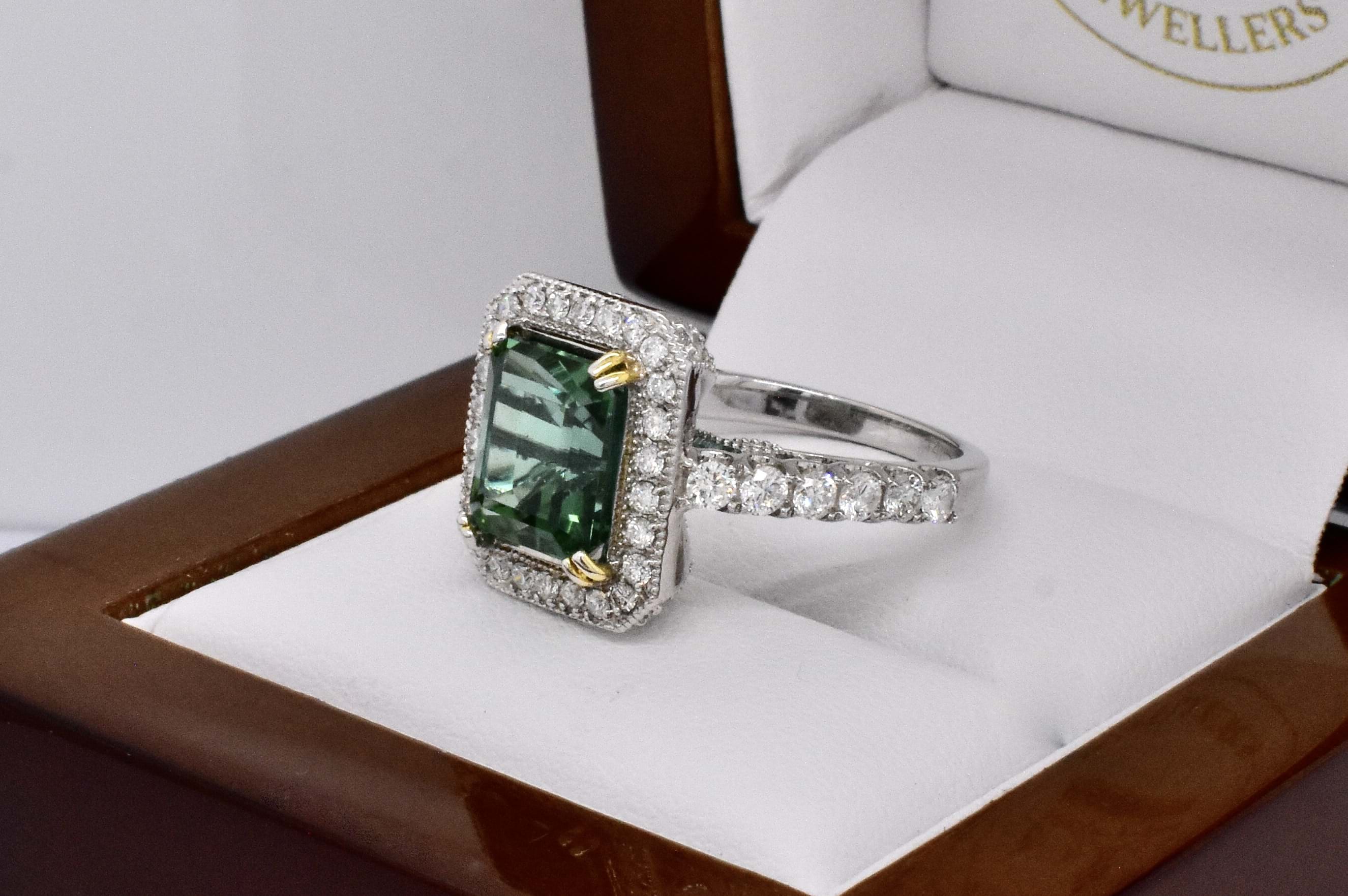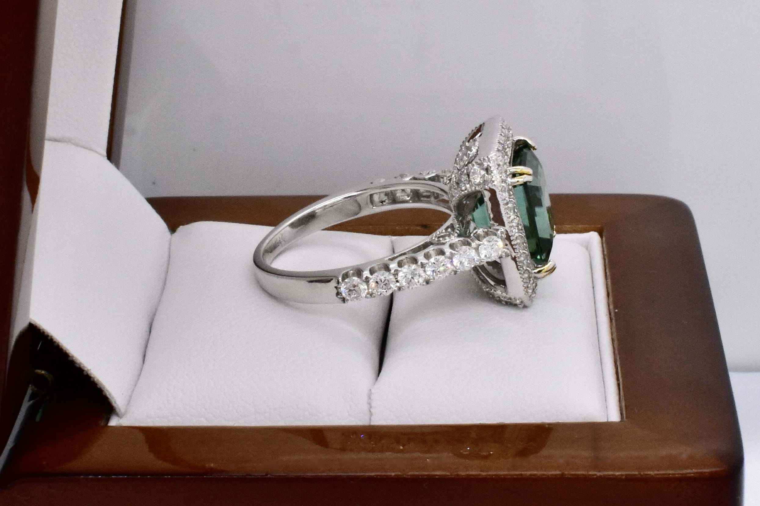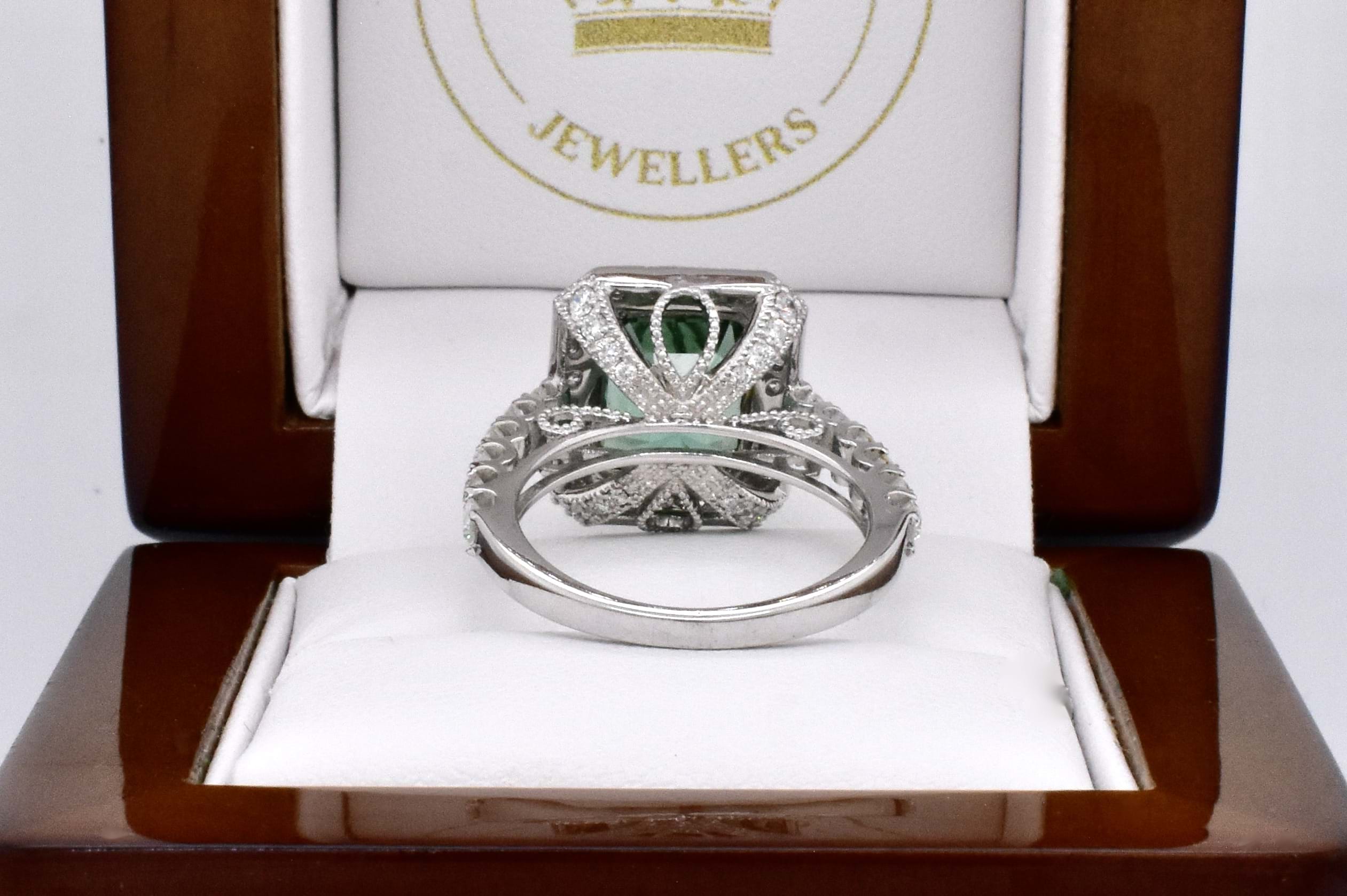 Gorgeous vibrant blueish green eye clean tourmaline in an emerald cut shape, measuring 9.20x8.03x7.30mm and weighing 4.60ct. The tourmaline is split four claw set in 14ct white gold with a surrounded by a cluster of round brilliant cut diamonds which continue down the band. The gallery of this ring has beautiful wire looped cut out detailing and is completed on a 2.22mm soft edge flat band. With a total of 54 diamonds totalling 1.30ct H SI-P1-P2. Finger size N+. Independent Valuation Supplied.