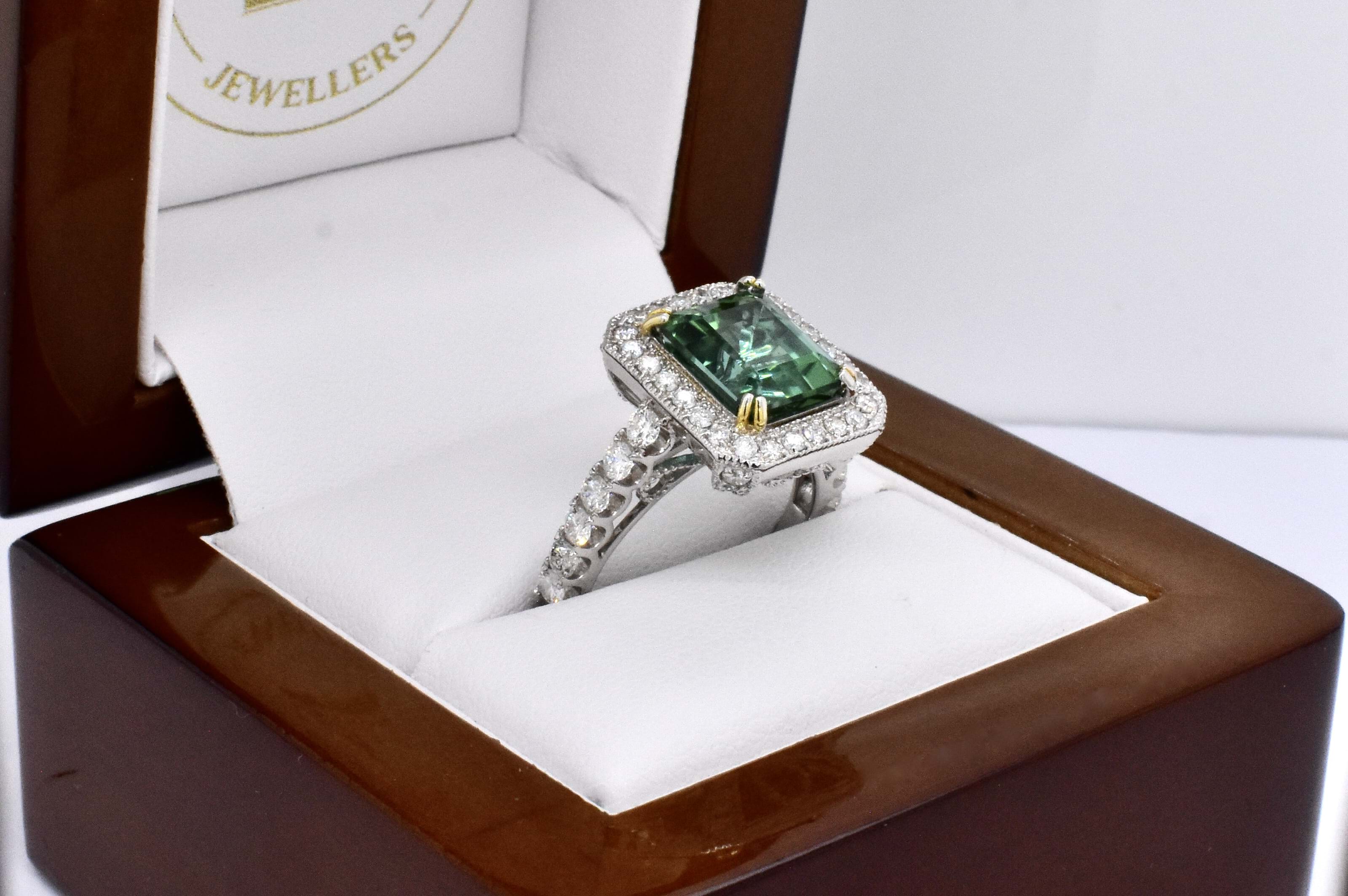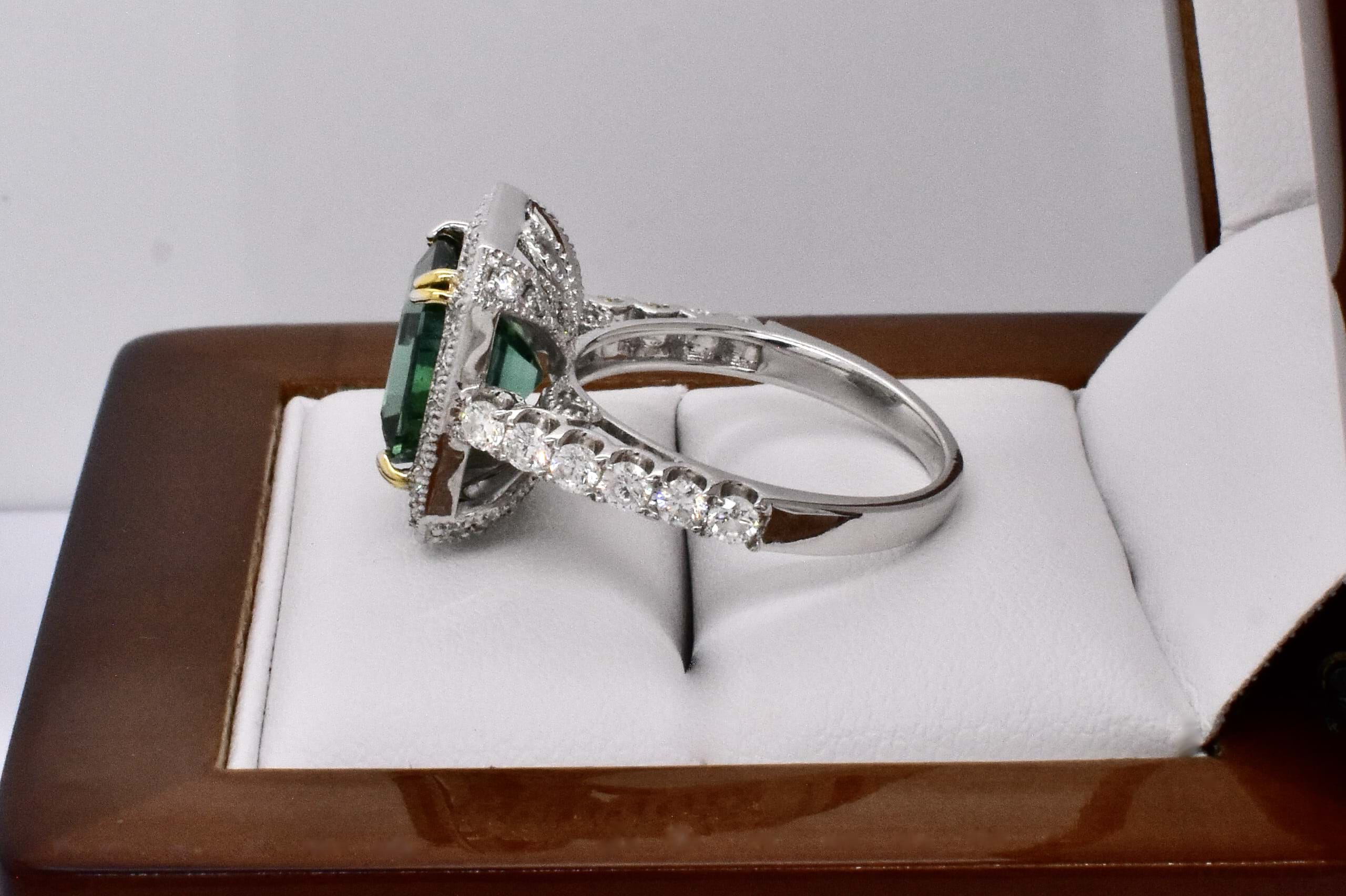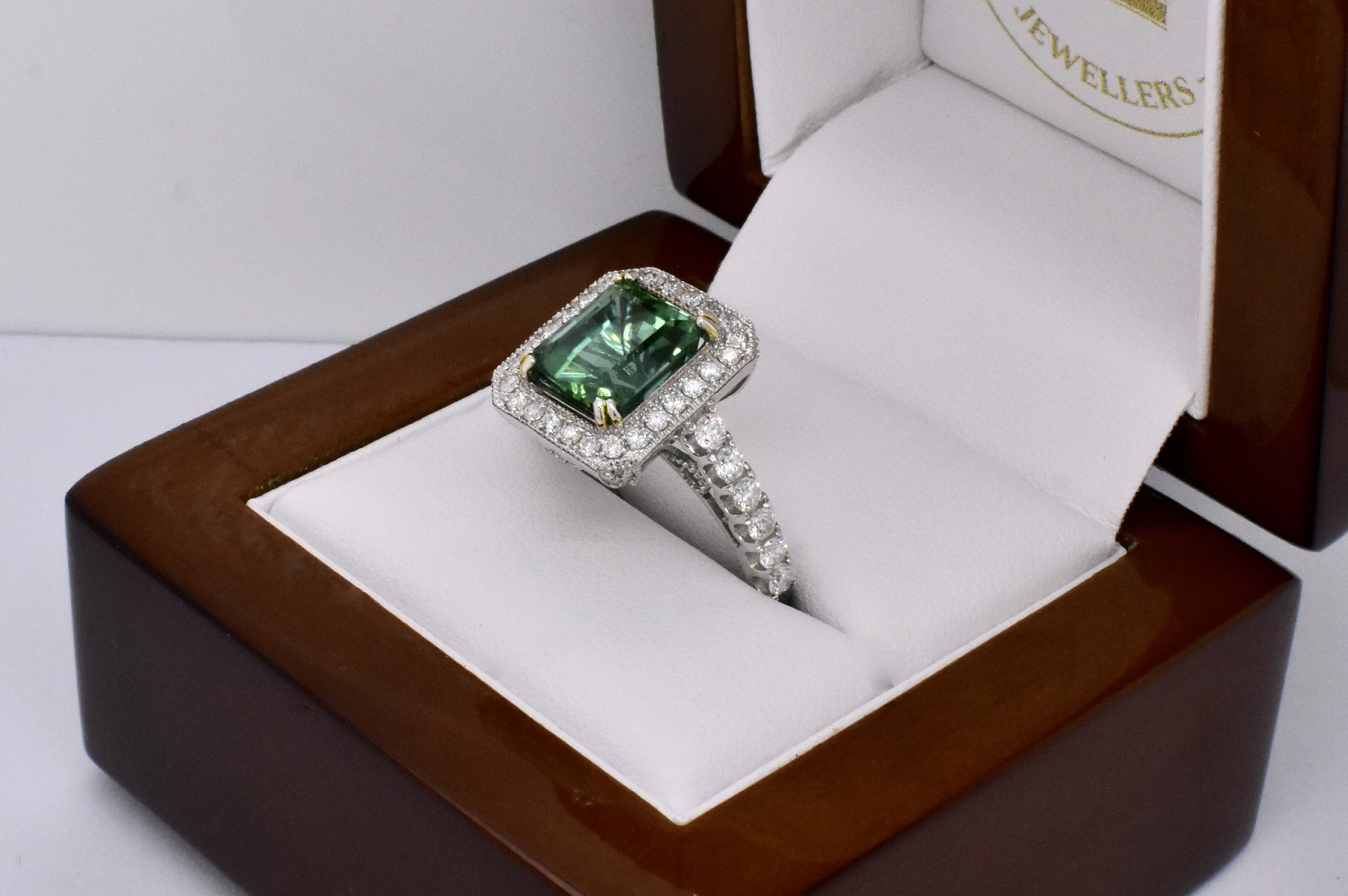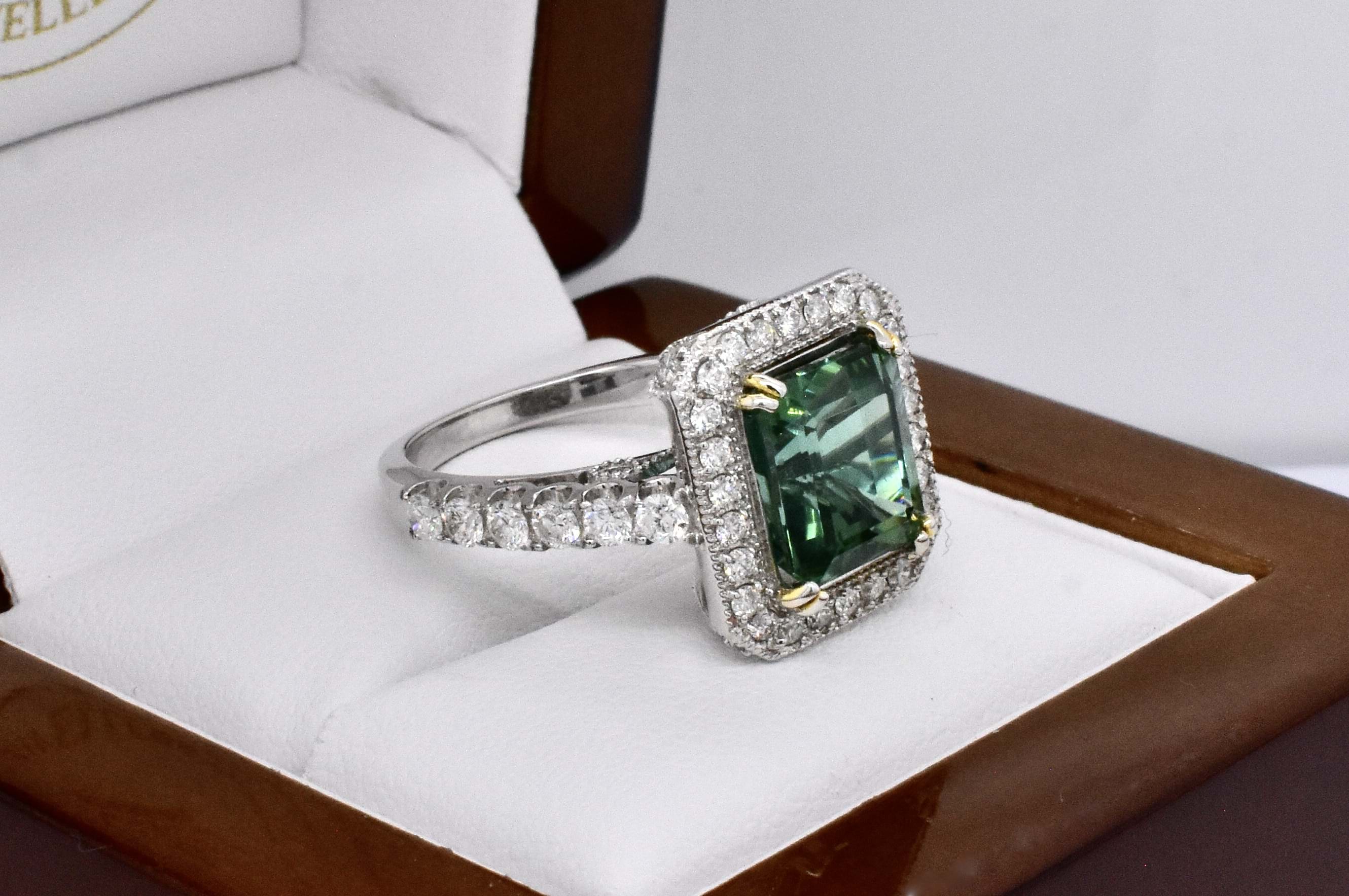 Gorgeous vibrant blueish green eye clean tourmaline in an emerald cut shape, measuring 9.20x8.03x7.30mm and weighing 4.60ct. The tourmaline is split four claw set in 14ct white gold with a surrounded by a cluster of round brilliant cut diamonds which continue down the band. The gallery of this ring has beautiful wire looped cut out detailing and is completed on a 2.22mm soft edge flat band. With a total of 54 diamonds totalling 1.30ct H SI-P1-P2. Finger size N+. Independent Valuation Supplied.