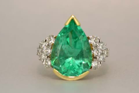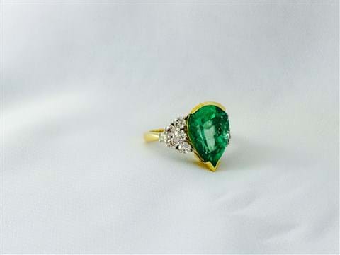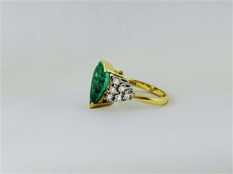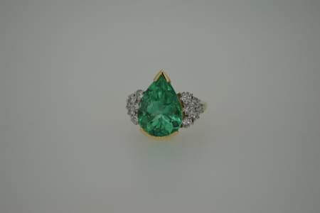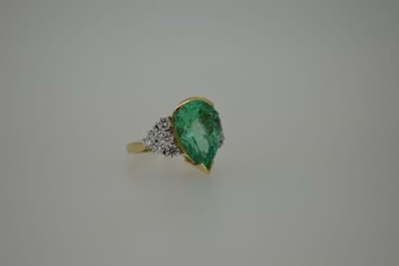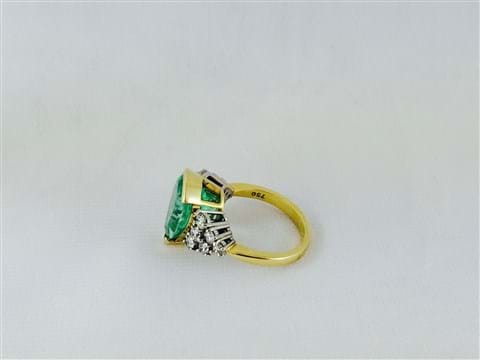 This Glamorous cocktail ring is in 18ct yellow and white gold. With an apple green natural Emerald of an impressive 6.81ct, that is shanked by 6 sparkling white round brilliant cut diamonds on each side it has fabulous impact! Independent Valuation Supplied.