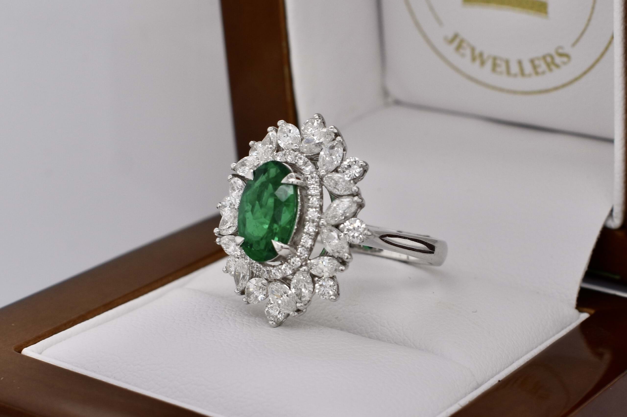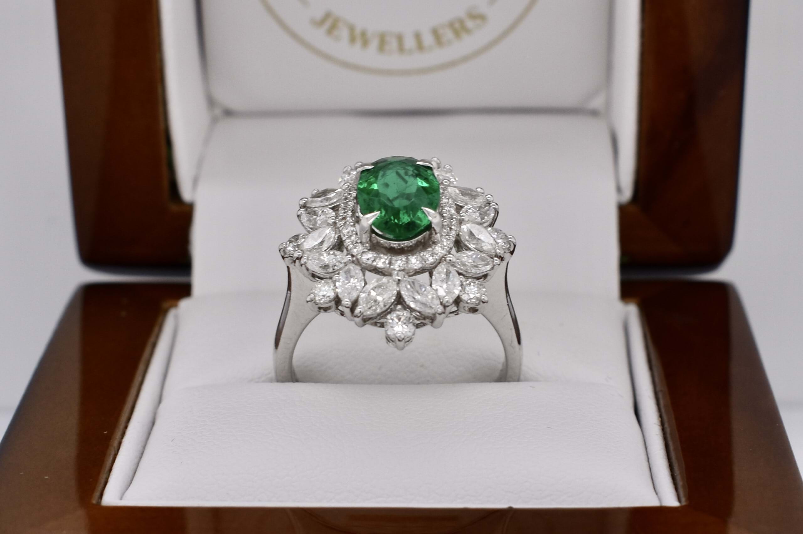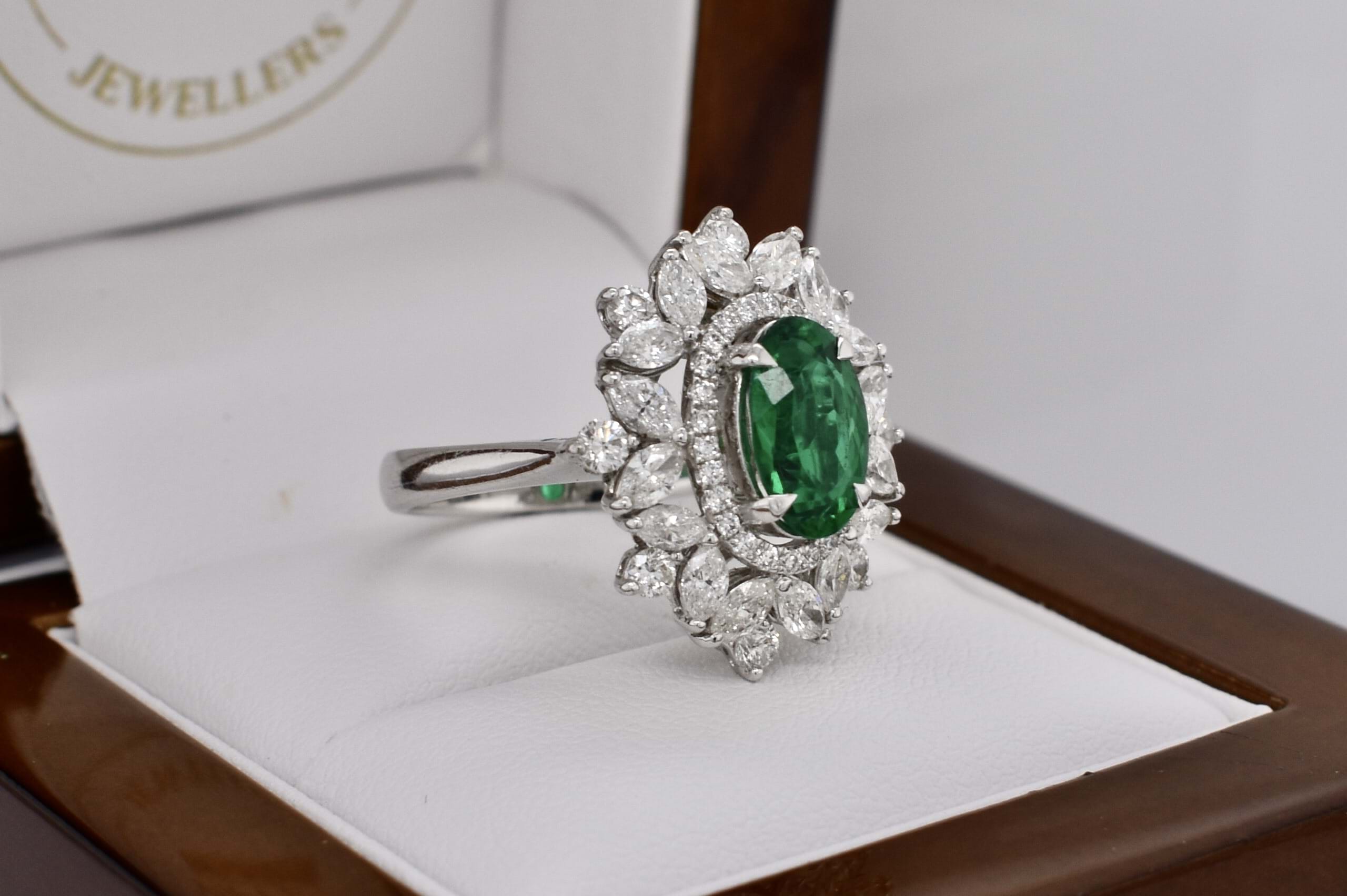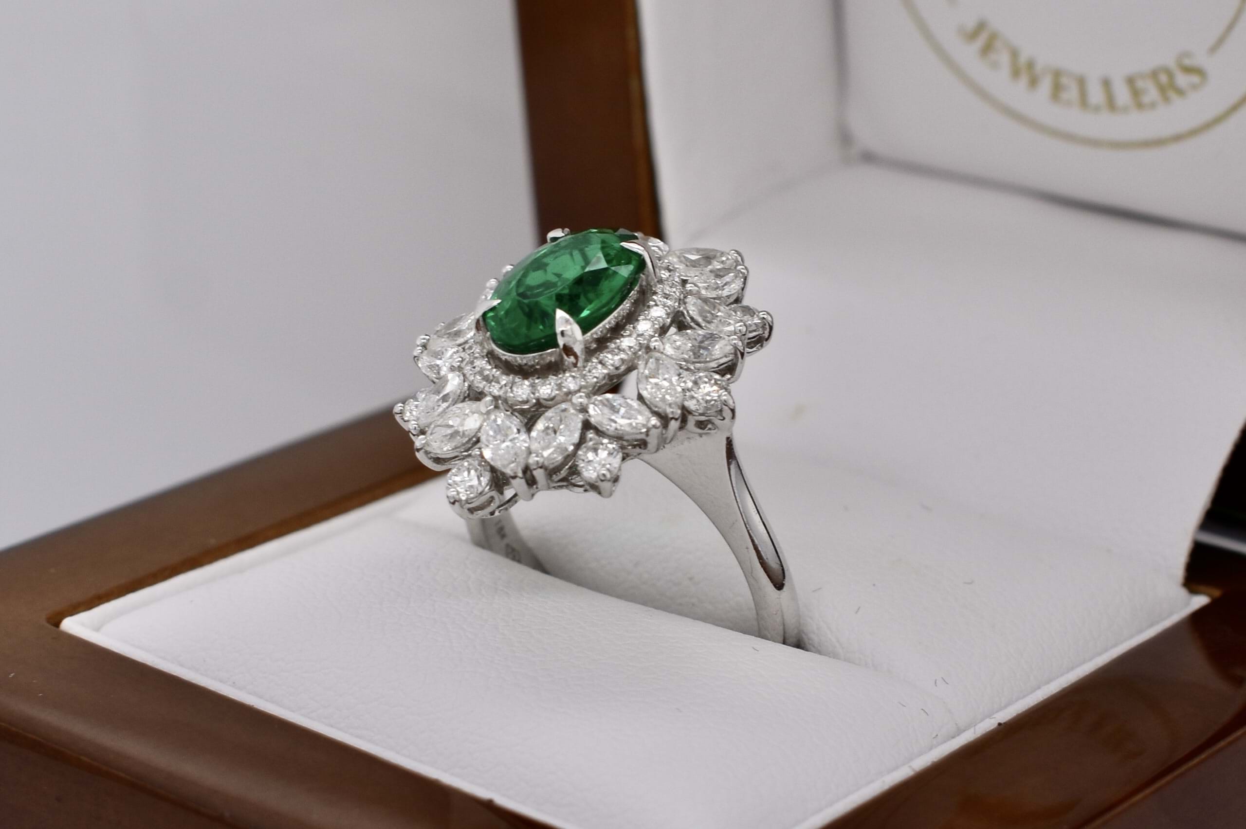Absolutely spectacular, this 1.42ct Colombian emerald ring measures 9.86x6.33x4.16mm, comes with a Gubelin certificate and is beautifully crafted in 18ct white gold. The large oval emerald has a bright deep green colour and eye clean clarity. There are 50 diamonds including marquise and round shaped in a cluster around the centre emerald. with 16 marquise diamonds, totalling 1.19ct, and 34 round brilliant cuts equalling 0.51ct. Total diamond weight of 1.70ct GH VS-SI. Finished with a lovely wire scroll gallery on a 3.11mm band. Finger size N. Independent Valuation Supplied