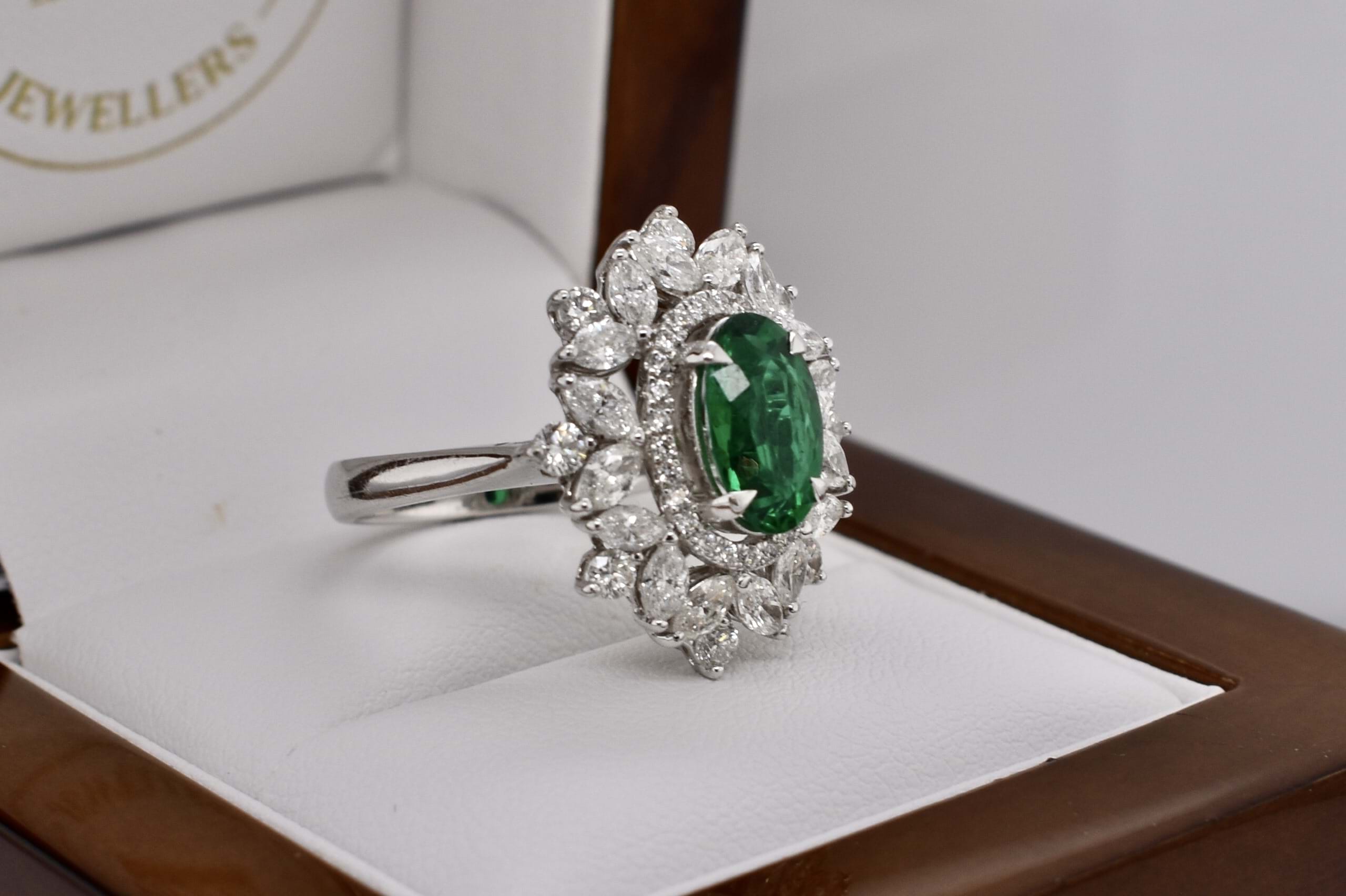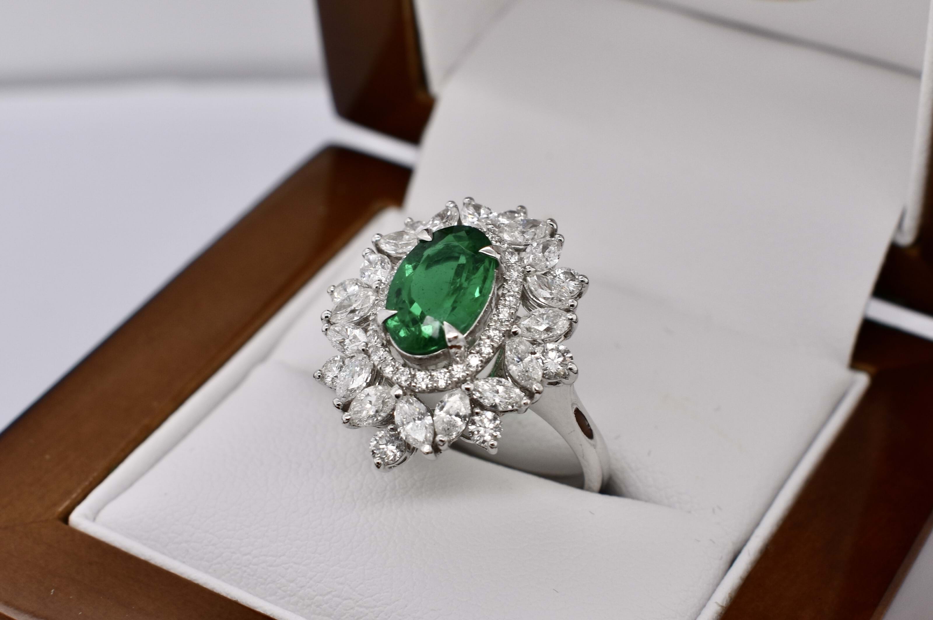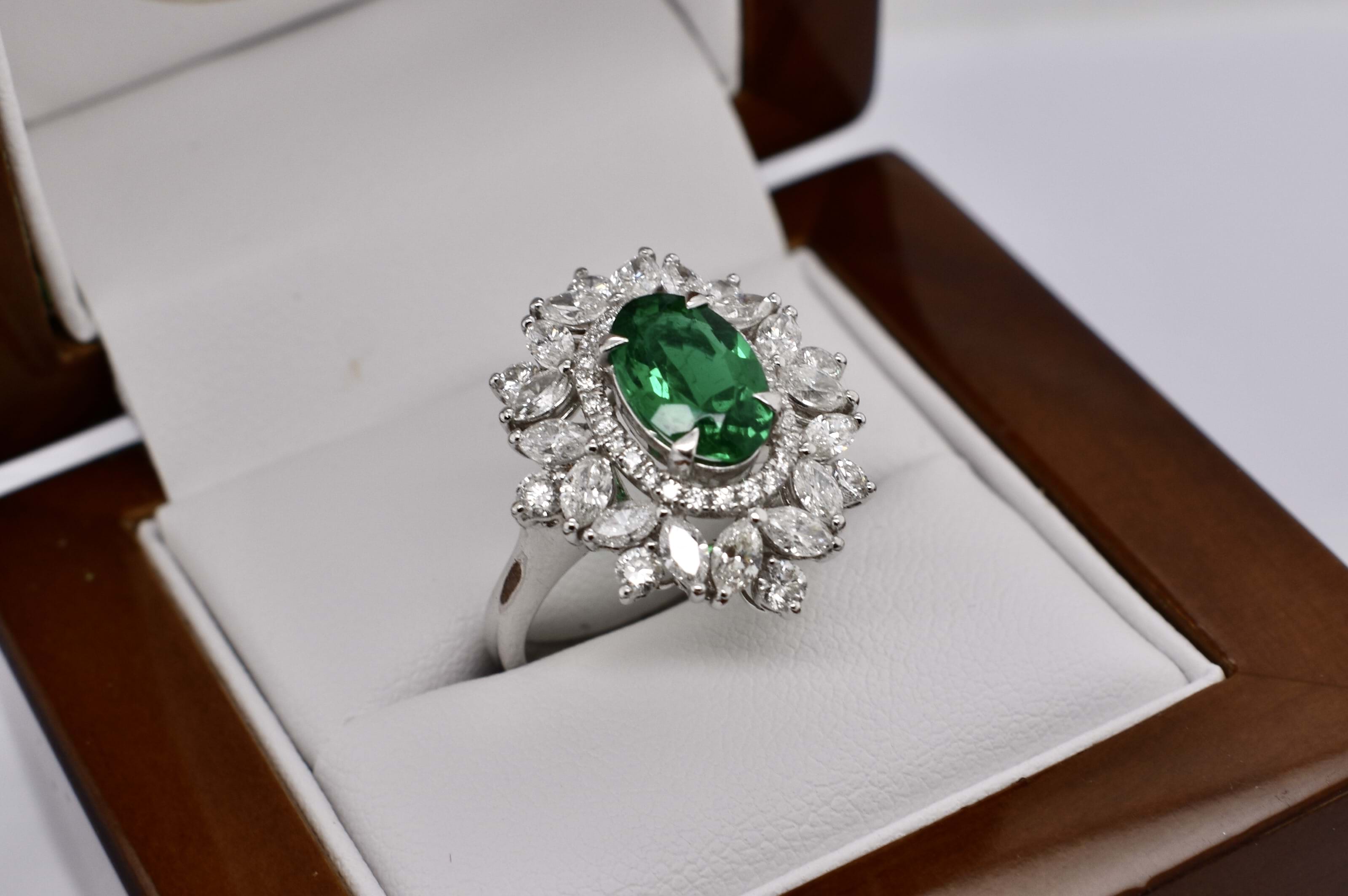 Absolutely spectacular, this 1.42ct Colombian emerald ring measures 9.86x6.33x4.16mm, comes with a Gubelin certificate and is beautifully crafted in 18ct white gold. The large oval emerald has a bright deep green colour and eye clean clarity. There are 50 diamonds including marquise and round shaped in a cluster around the centre emerald. with 16 marquise diamonds, totalling 1.19ct, and 34 round brilliant cuts equalling 0.51ct. Total diamond weight of 1.70ct GH VS-SI. Finished with a lovely wire scroll gallery on a 3.11mm band. Finger size N. Independent Valuation Supplied