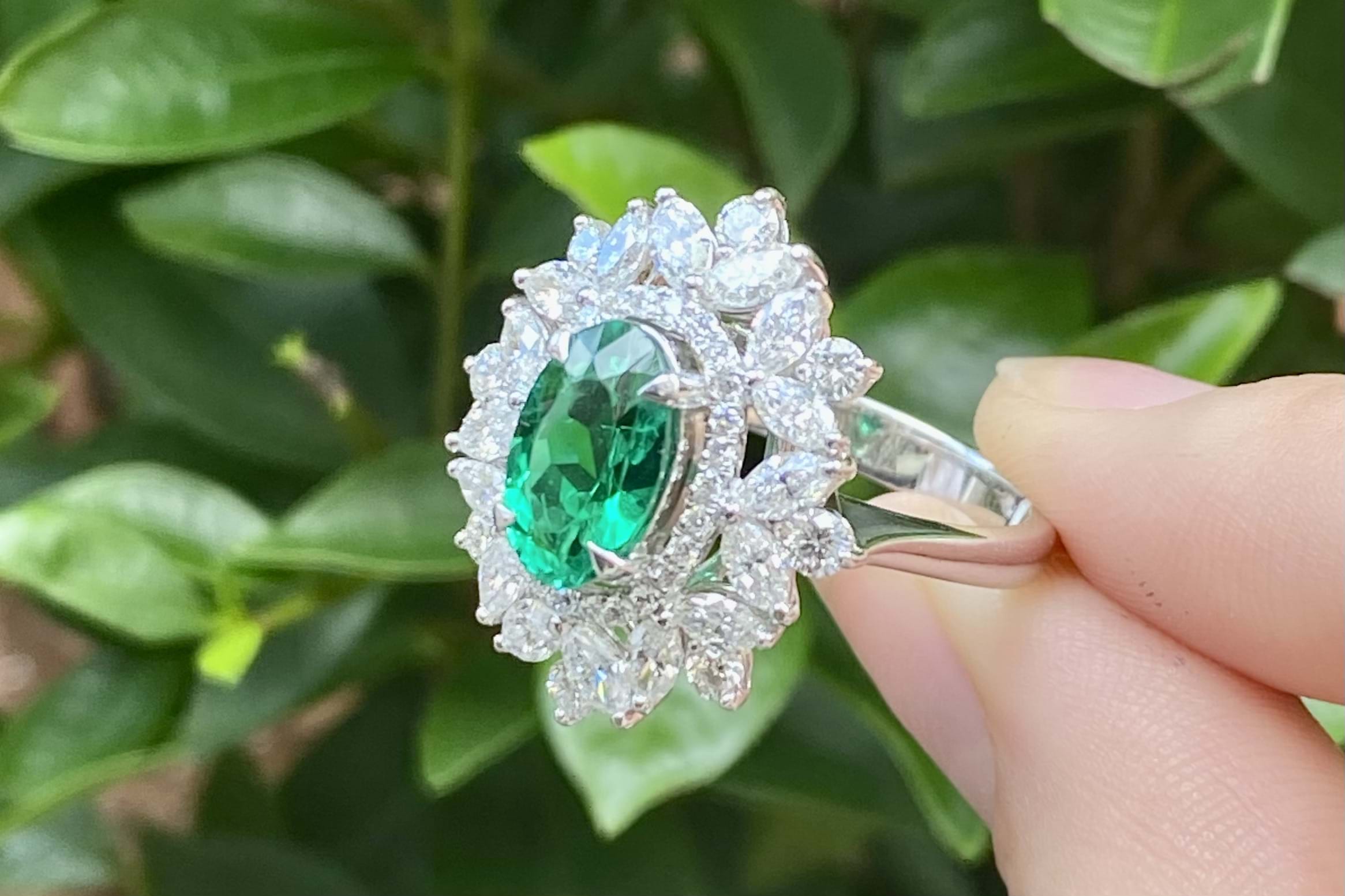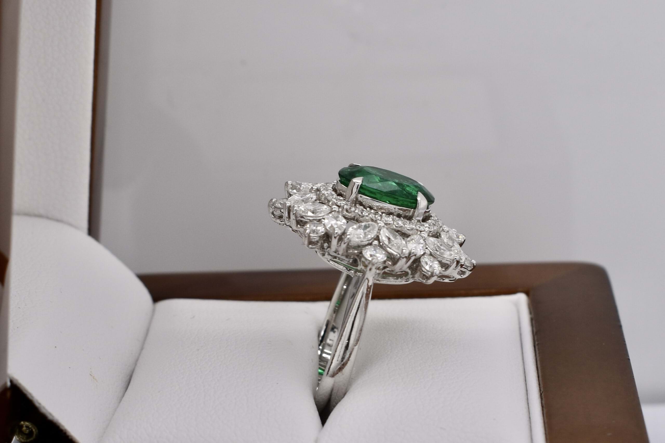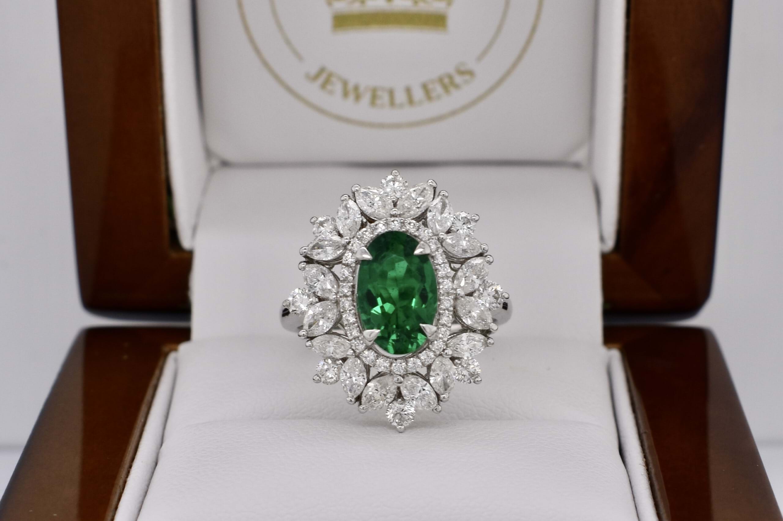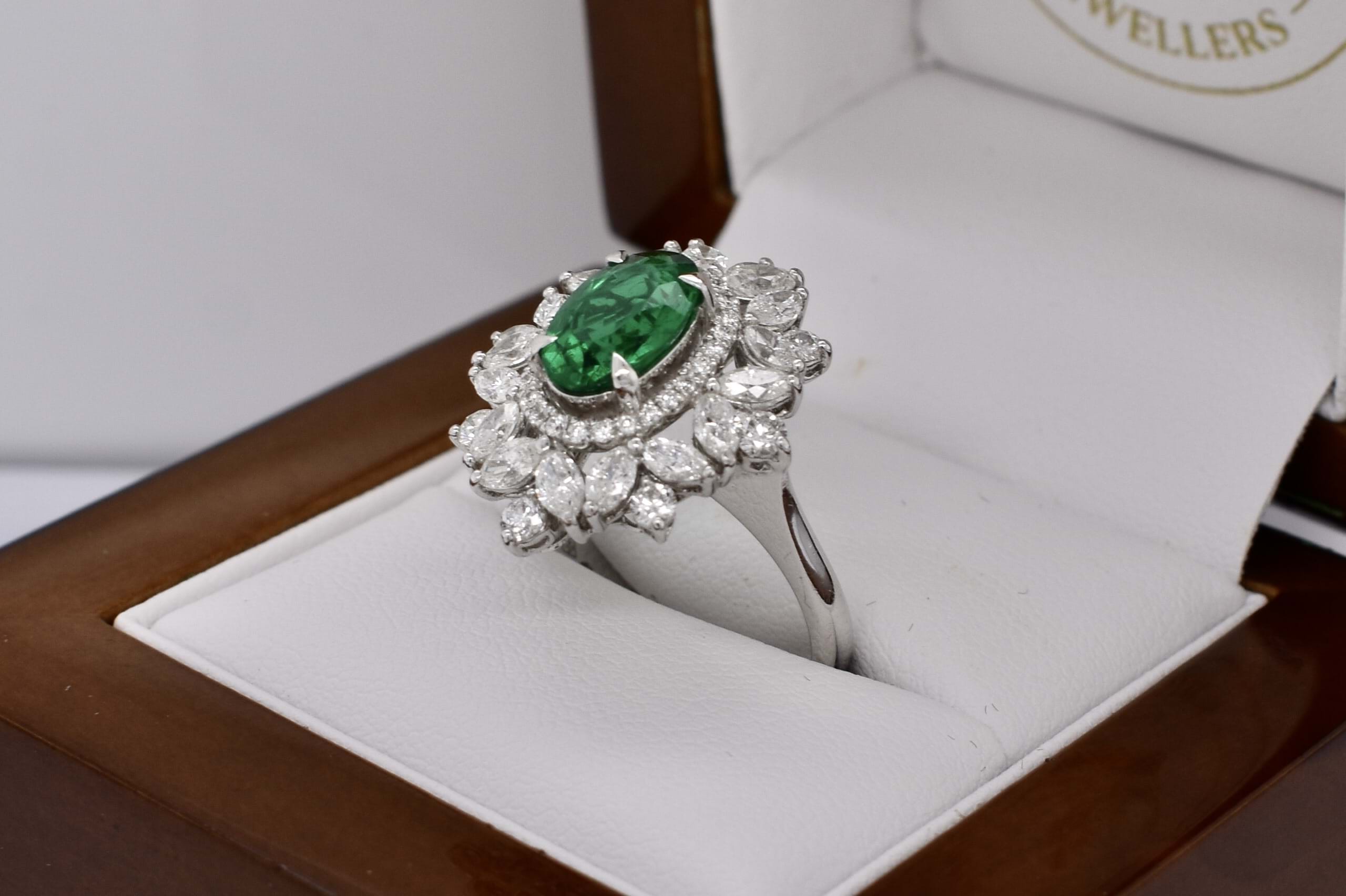 Absolutely spectacular, this 1.42ct Colombian emerald ring measures 9.86x6.33x4.16mm, comes with a Gubelin certificate and is beautifully crafted in 18ct white gold. The large oval emerald has a bright deep green colour and eye clean clarity. There are 50 diamonds including marquise and round shaped in a cluster around the centre emerald. with 16 marquise diamonds, totalling 1.19ct, and 34 round brilliant cuts equalling 0.51ct. Total diamond weight of 1.70ct GH VS-SI. Finished with a lovely wire scroll gallery on a 3.11mm band. Finger size N. Independent Valuation Supplied