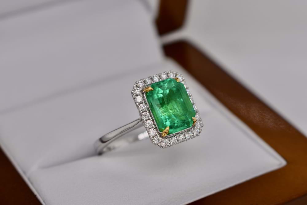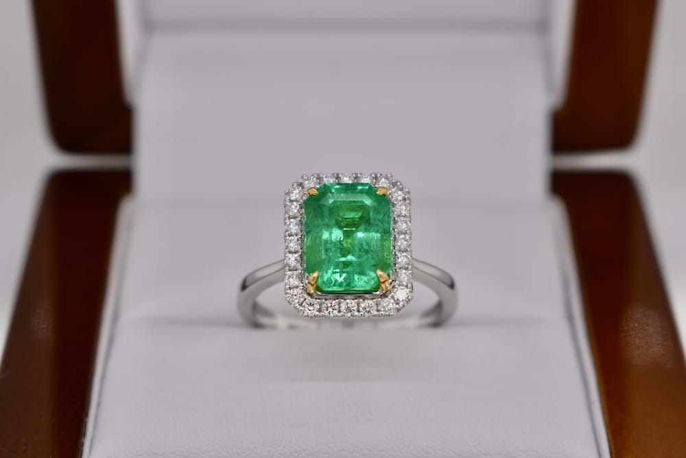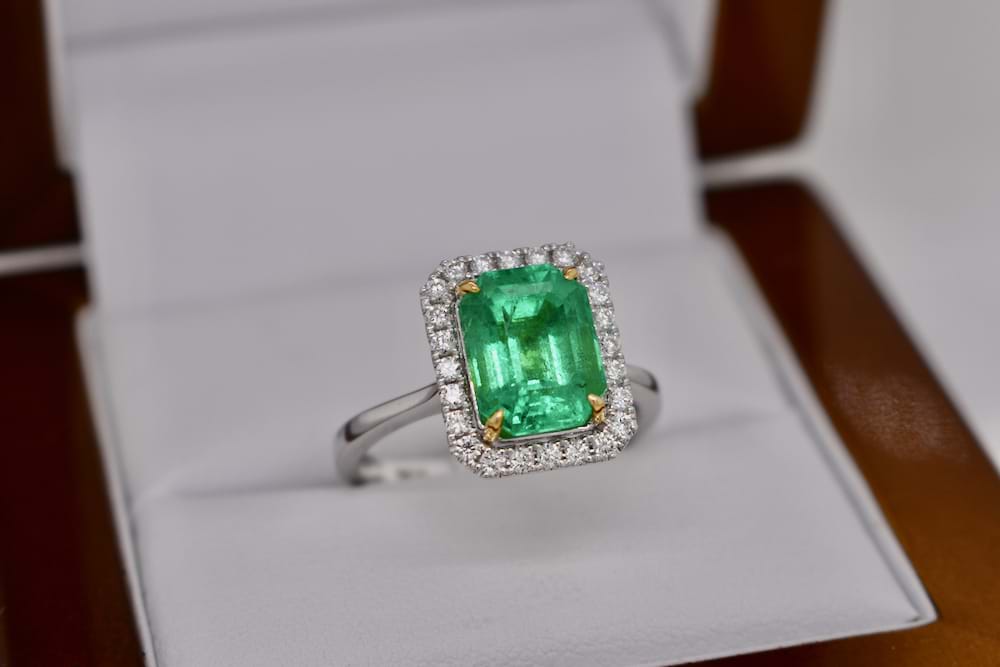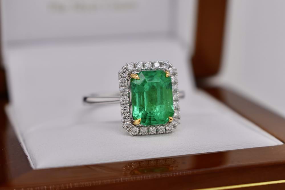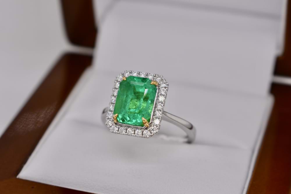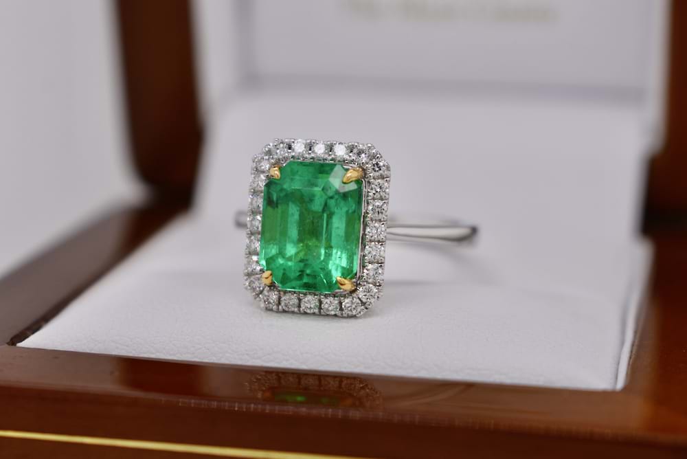 This stunning, bright, 3.28ct emerald is certified Colombian origin and has been four claw set with 18ct yellow gold talon style claws with a single halo of shimmering white diamonds in 18ct white gold with a plain band. Total diamond content is 0.29cts (GVS). Finger size N. Independent Valuation & Spectra Certificate Supplied