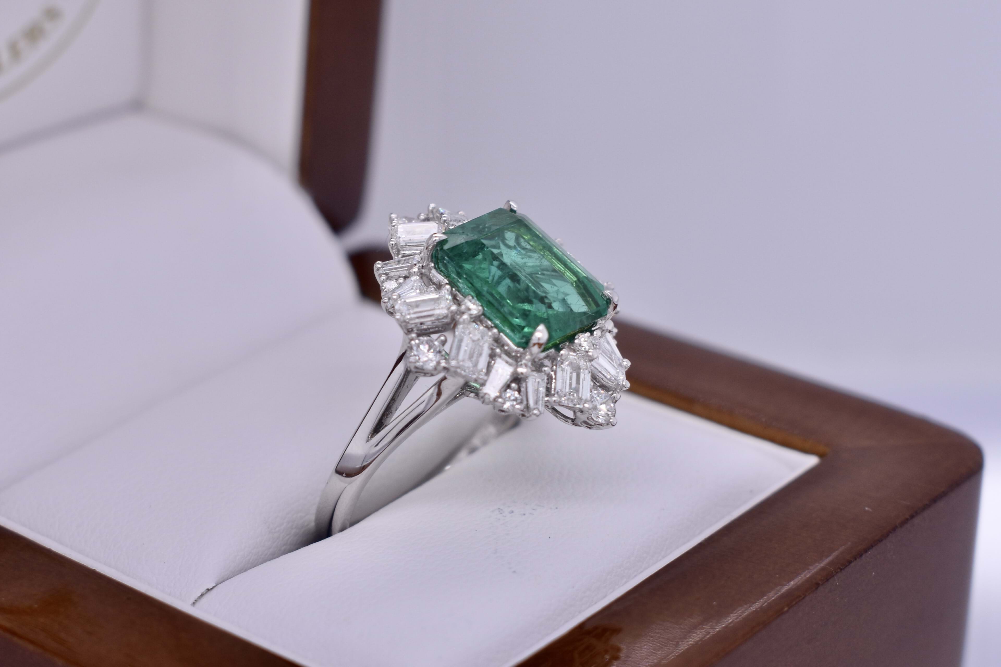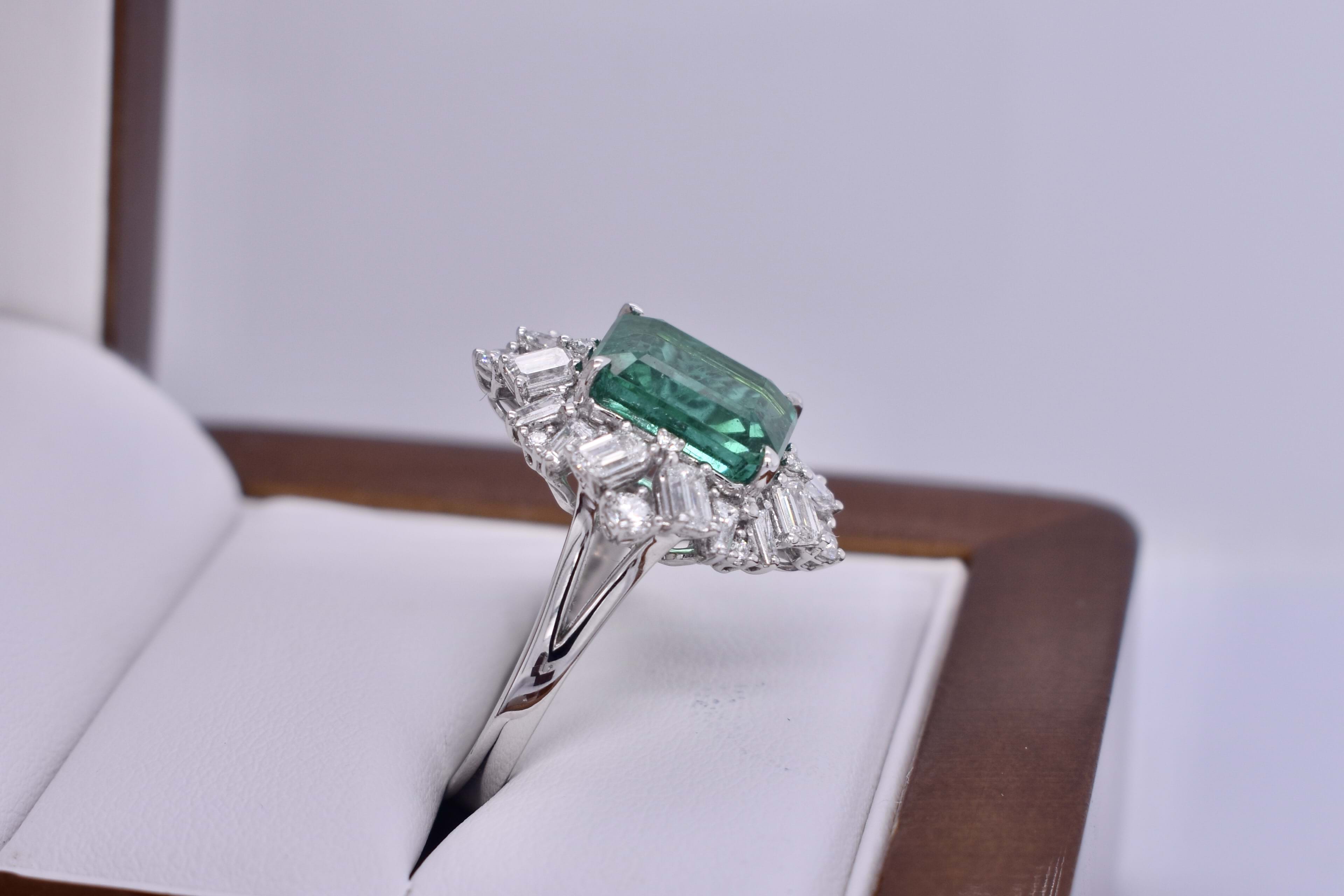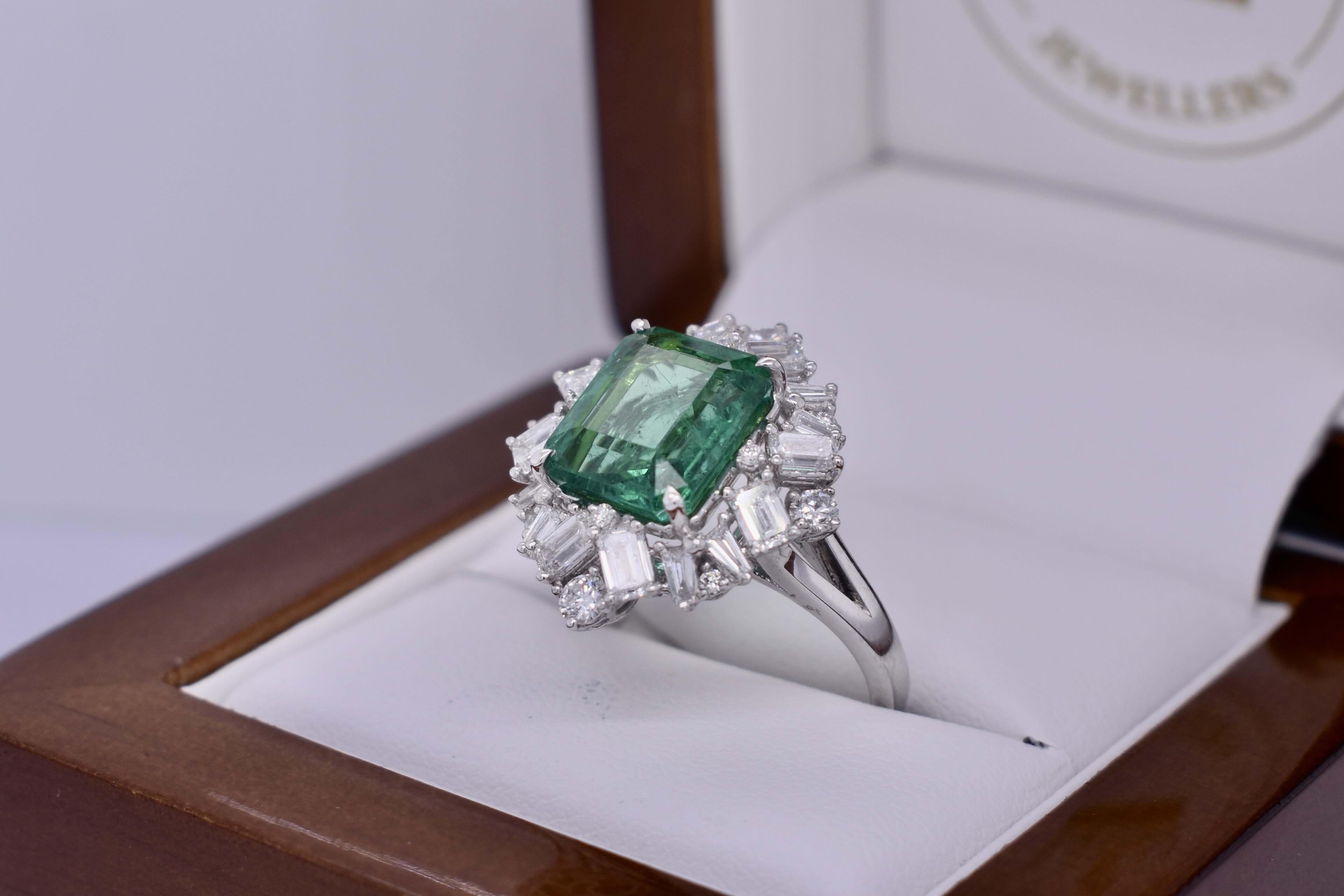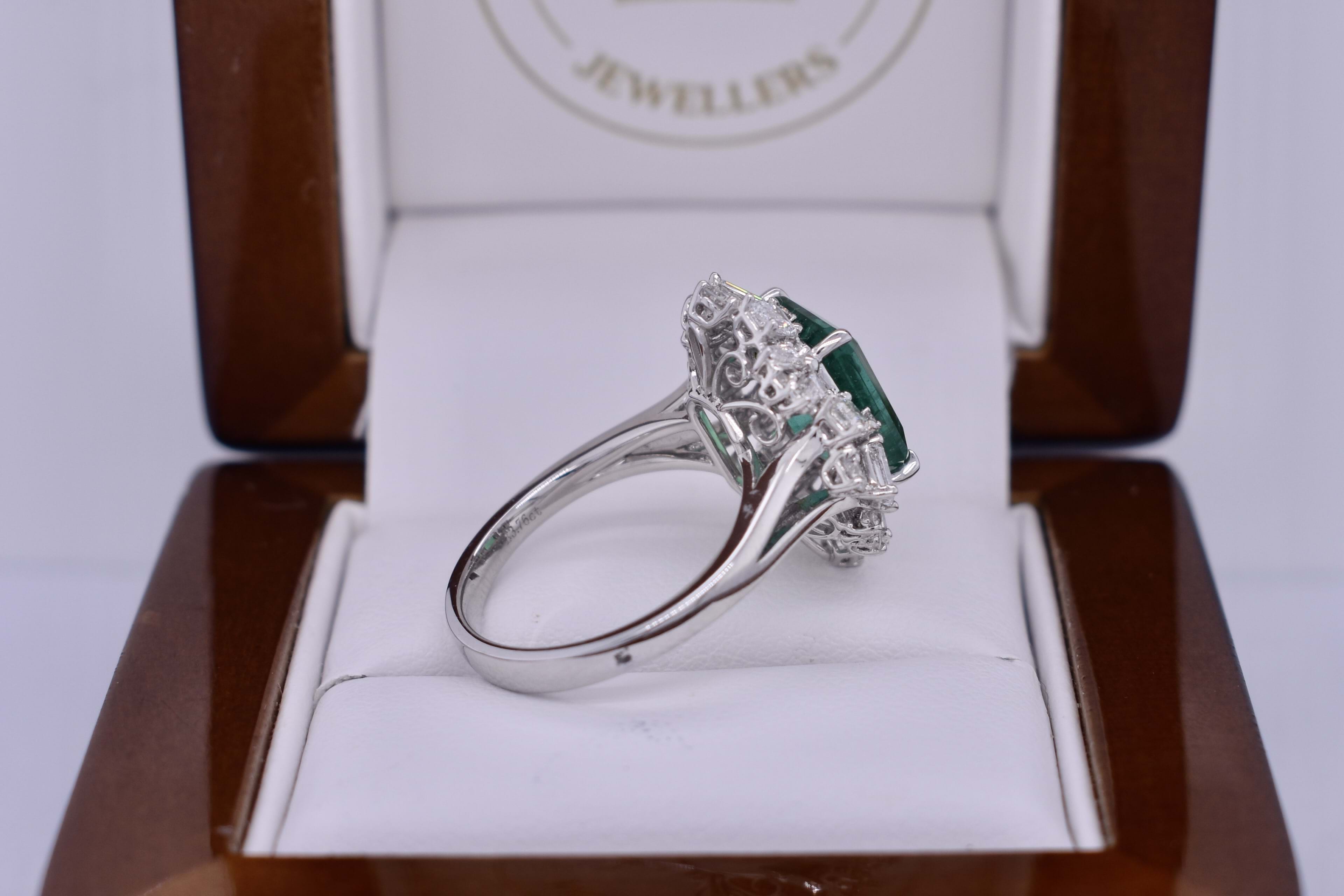 This fabulous 18ct white gold ring, features a central emerald cut 10.19x8.63x5.10mm bright green emerald of 3.76ct, four claw set. Surrounded by a mixed assortment of different shaped diamonds including 8 tapered baguettes, 8 emerald cuts and 4 round brilliant cut diamonds, shared claw set in a cluster halo totalling 1.72ct GH VS. Finished on a 2.89mm band with split swept up shoulders and a wire scroll gallery. Finger size M. 6.47 grams. Independent Valuation Supplied