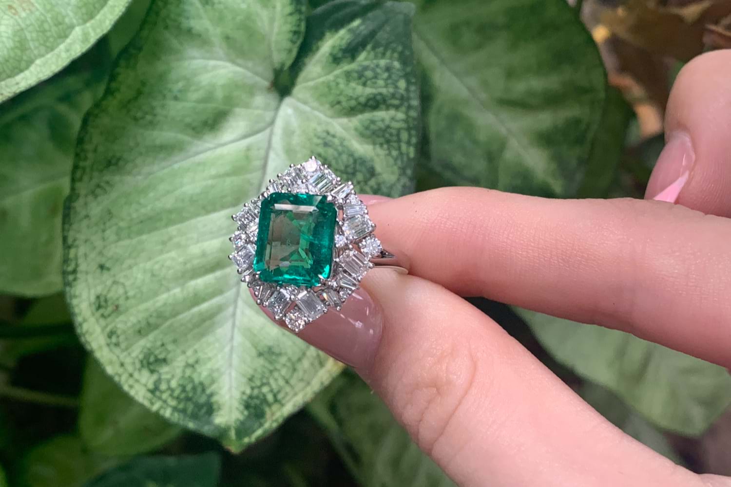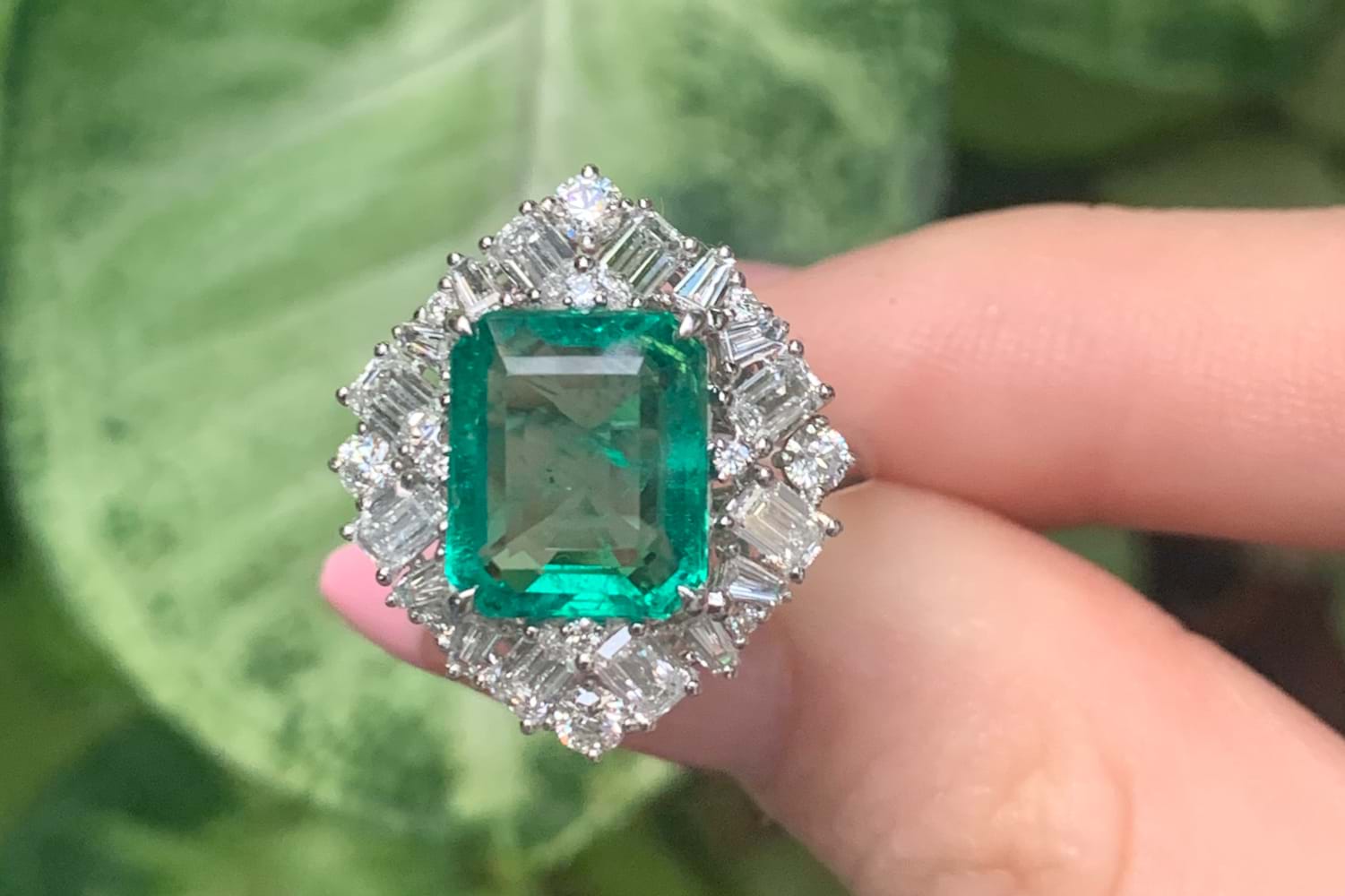 SOLD 18ct White Gold 3.76ct Emerald Cut Emerald & 1.72ct Diamond Cluster Halo Ring (M)