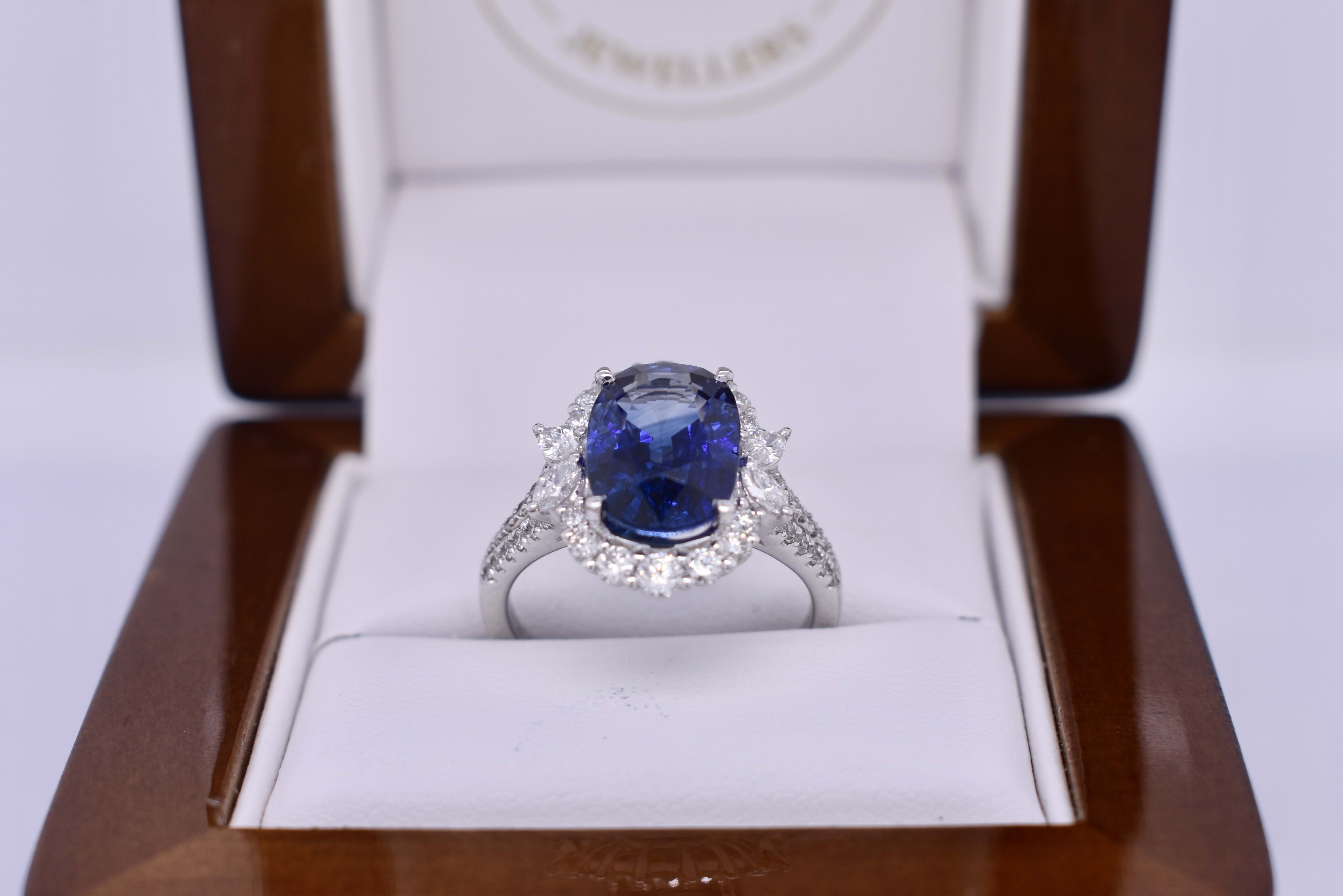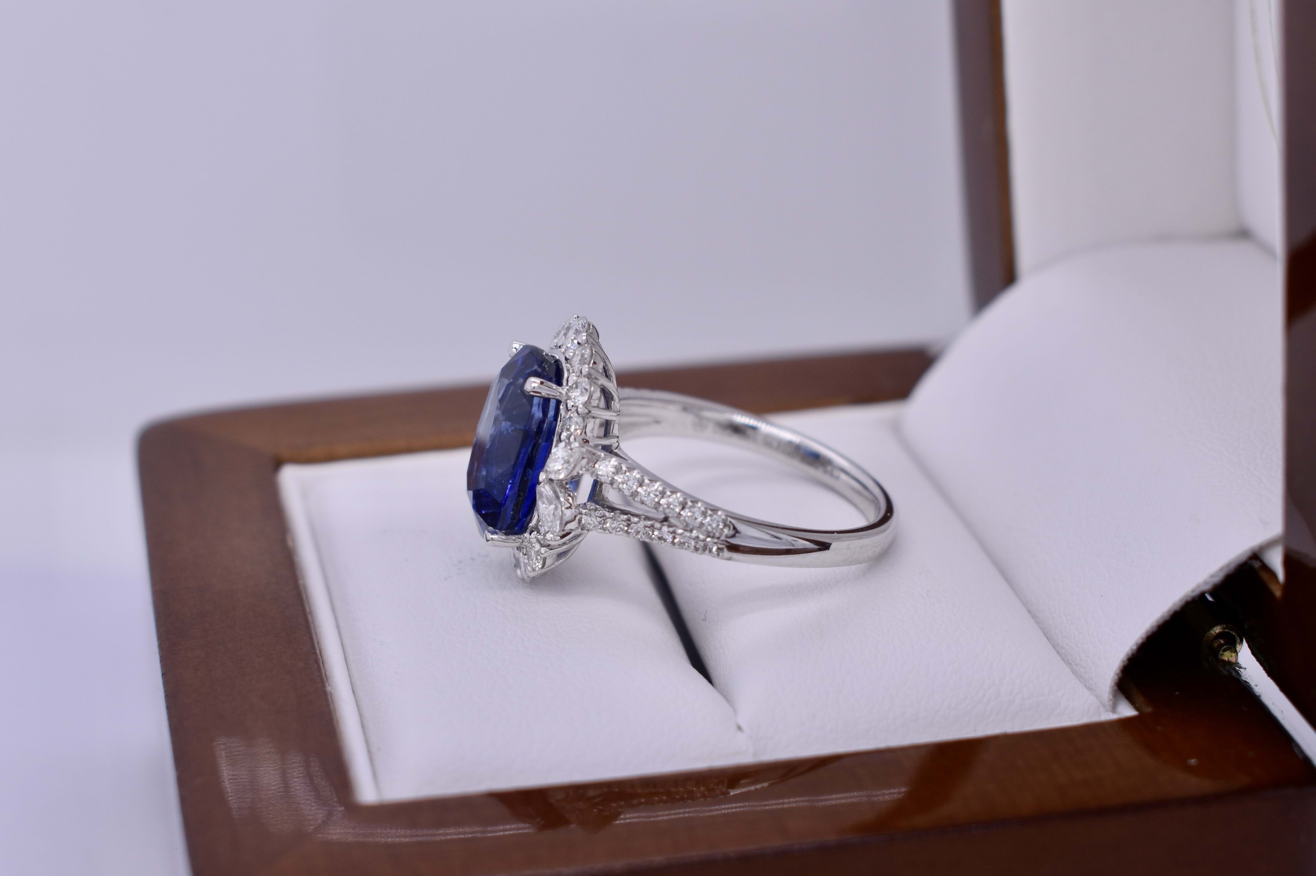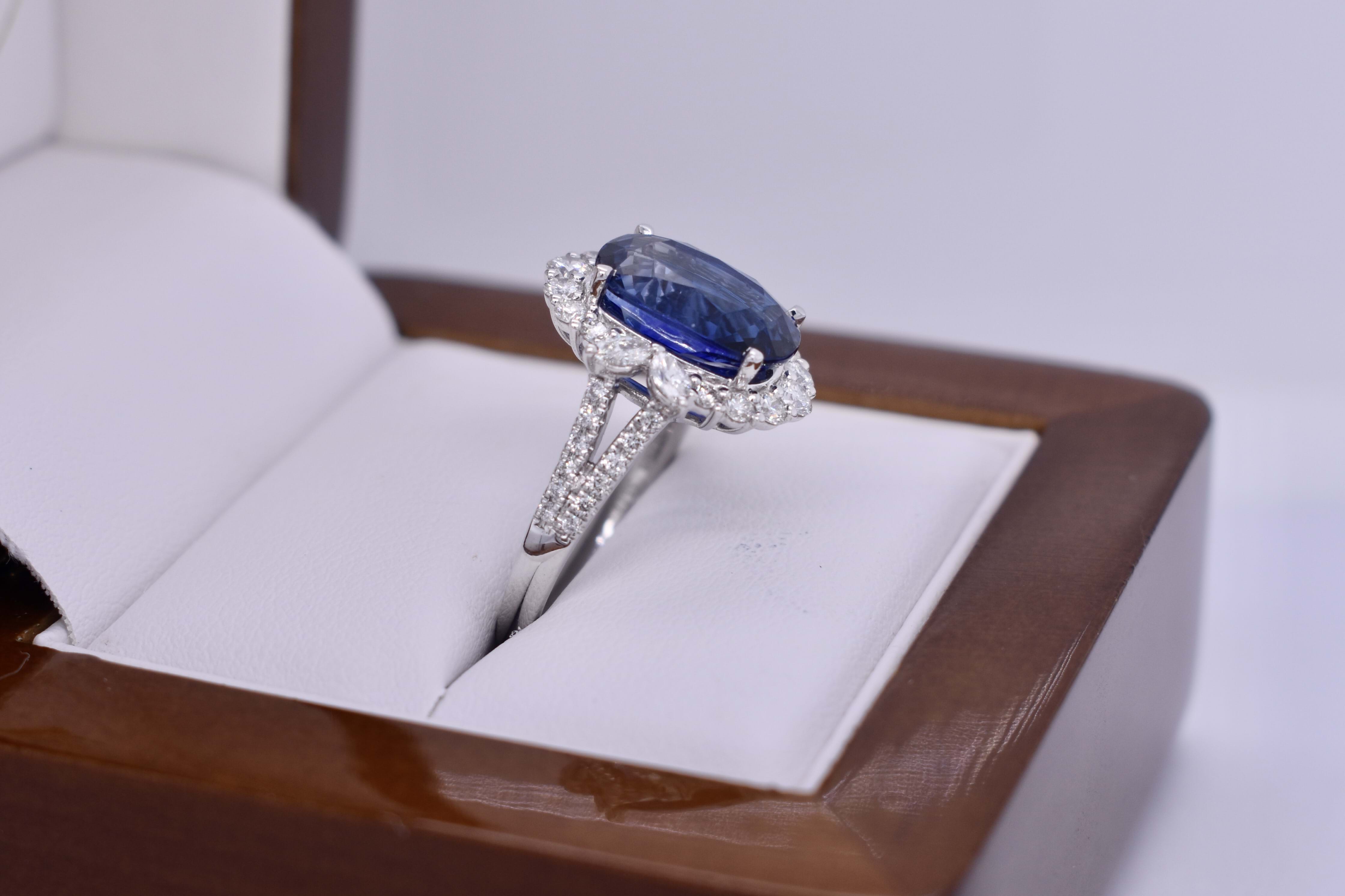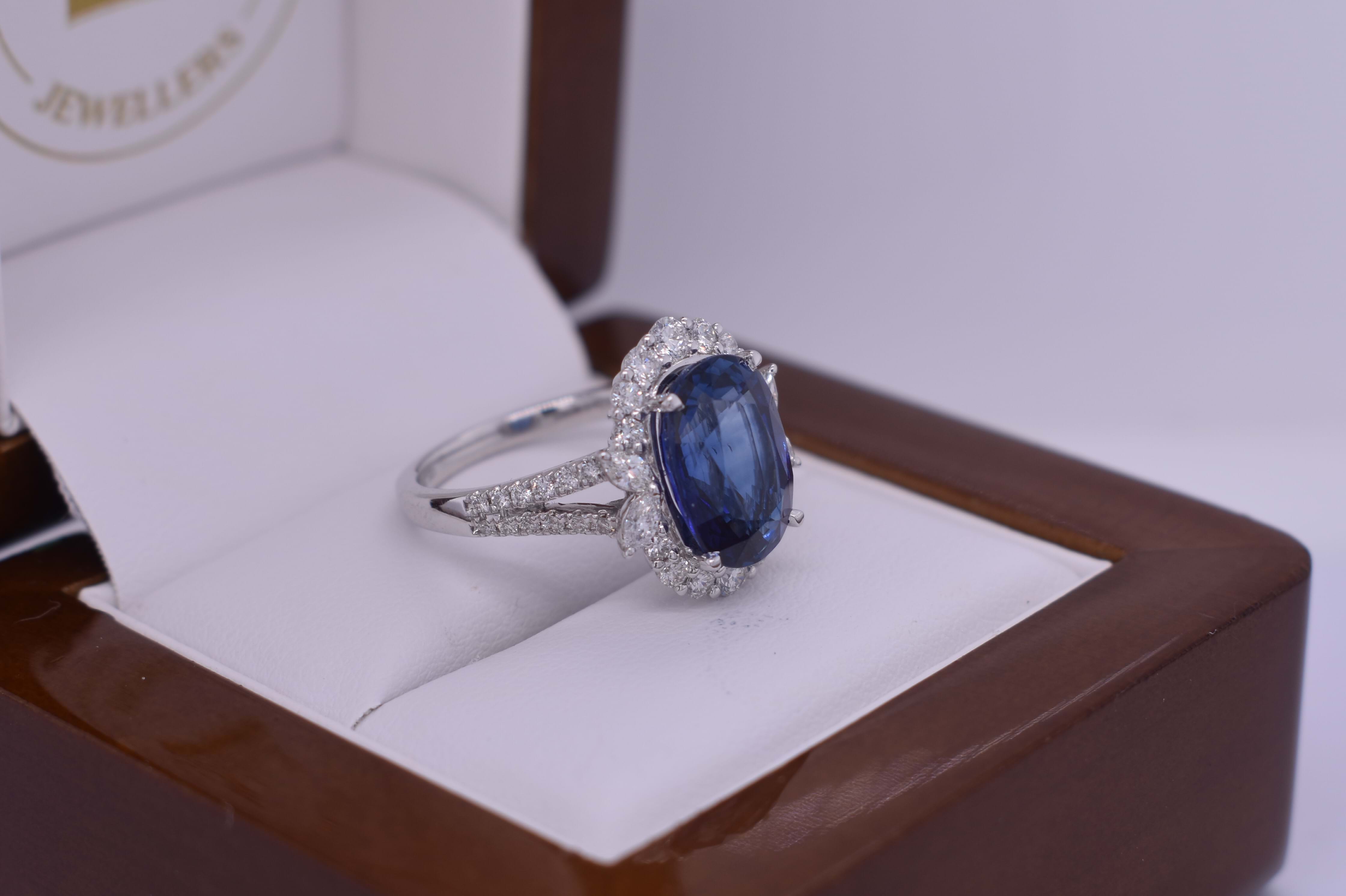This fabulous 18ct white gold ring, features a central bright deep blue oval Sri Lankan 11.72x8.03x5.60mm sapphire of 5.03ct, four claw set. Sapphire has a GRS report included, heated. Surrounded by 2 marquise diamonds each side, 3.10x1.90mm, totalling 0.18ct FG VS-SI and 14 round brilliant cut diamonds in the halo, 2.45-1.60mm diamonds, equalling 0.49ct FG VS-SI and a further 24 round 1.00mm diamonds down the band of 0.12ct FG VS-SI. Finished on a 2.00mm band with split swept up shoulders. Finger size M. 5.44 grams. Independent Valuation Supplied