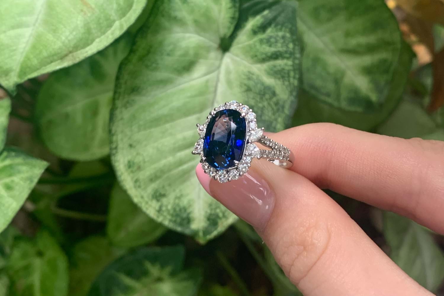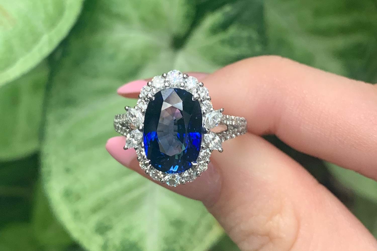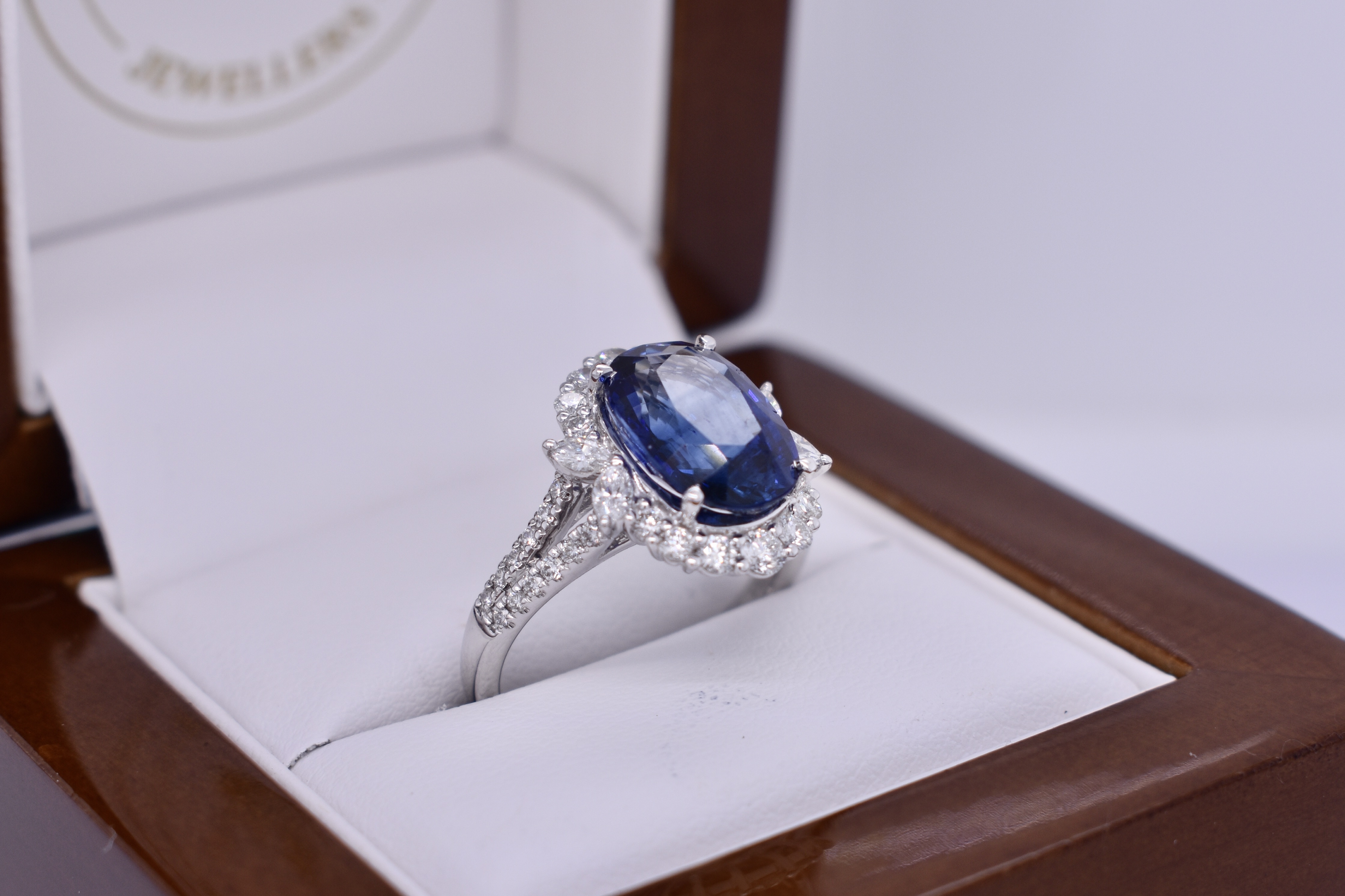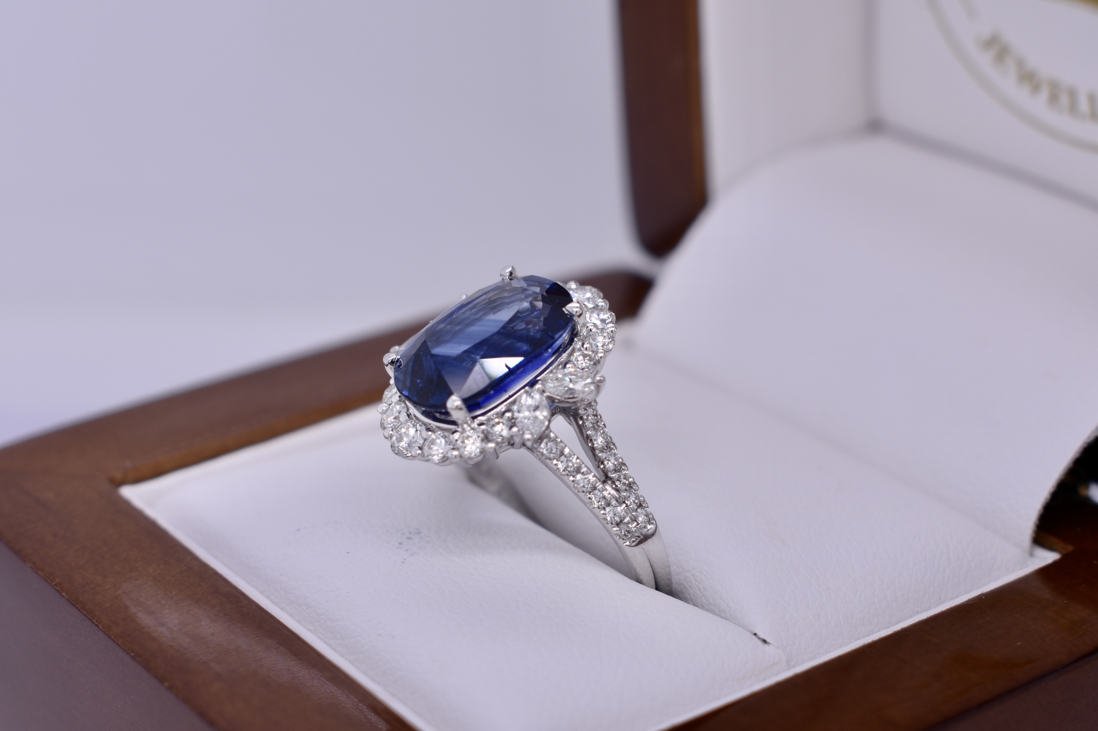 This fabulous 18ct white gold ring, features a central bright deep blue oval Sri Lankan 11.72x8.03x5.60mm sapphire of 5.03ct, four claw set. Sapphire has a GRS report included, heated. Surrounded by 2 marquise diamonds each side, 3.10x1.90mm, totalling 0.18ct FG VS-SI and 14 round brilliant cut diamonds in the halo, 2.45-1.60mm diamonds, equalling 0.49ct FG VS-SI and a further 24 round 1.00mm diamonds down the band of 0.12ct FG VS-SI. Finished on a 2.00mm band with split swept up shoulders. Finger size M. 5.44 grams. Independent Valuation Supplied