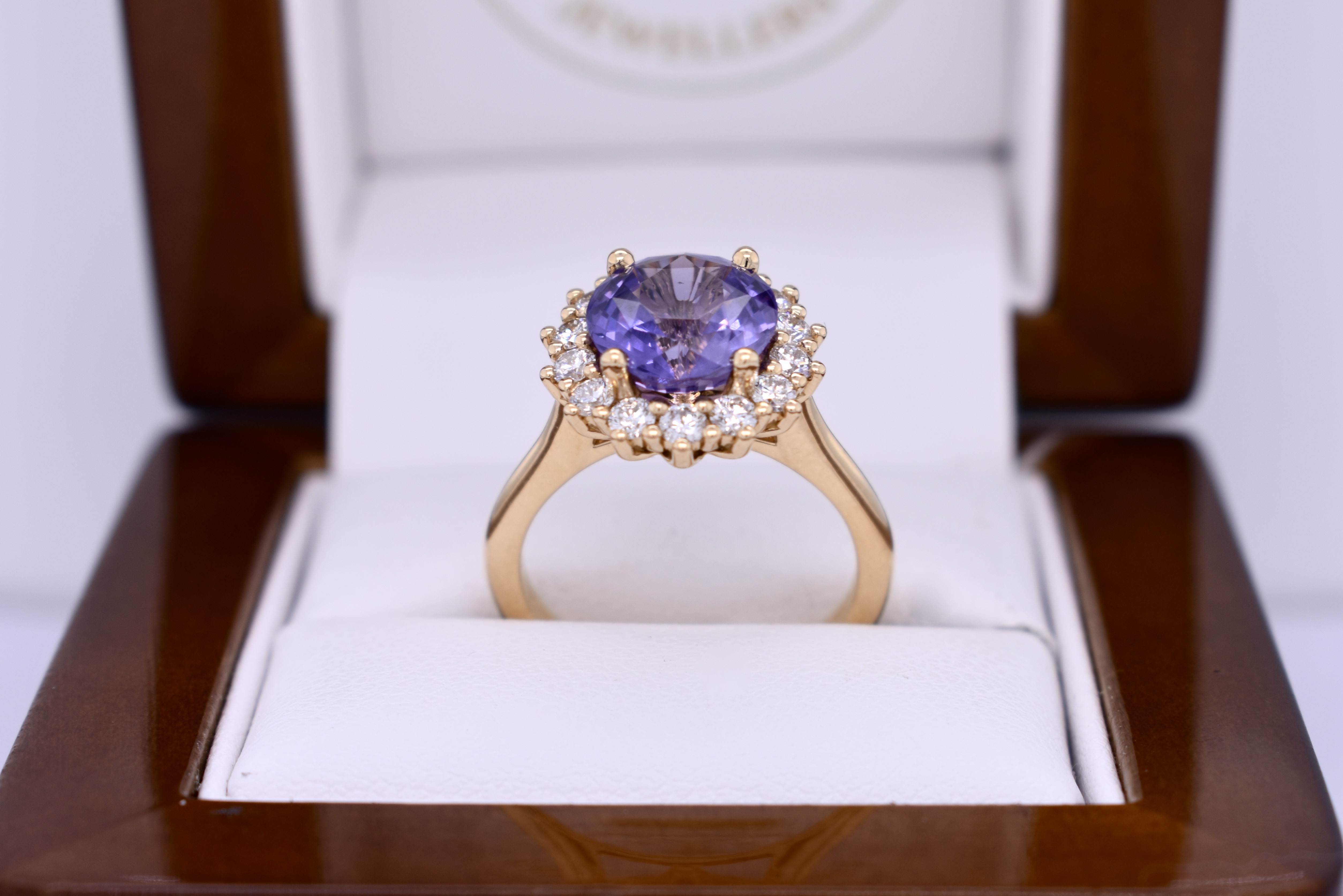 This lovely purple Ceylon oval sapphire of 3.98ct is four claw set in the centre of a gorgeous cluster halo ring in 18ct yellow gold. The diamonds surrounding the sapphire total 0.61ct F-G colour, SI clarity and are shared claw set. This ring has been designed to sit next to a wedding or stacking band if desired. Finger size M. Independent Valuation available following purchase.