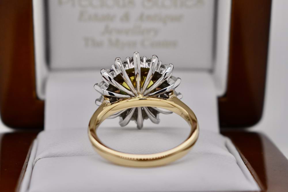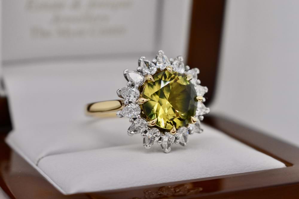 Bespoke and spectacular. This gorgeous custom ring was expertly crafted in our workshop in 18ct yellow and white gold to showcase this bright 4.92ct Australian parti sapphire. Set into eight yellow gold talon claws the sapphire has a skirt of 14 sparkling pearshape diamonds set with white gold claws and caps totalling 1.36cts (FG/VS). Finger size P. Independent Valuation Supplied