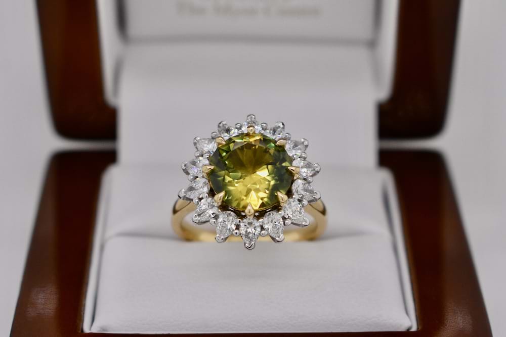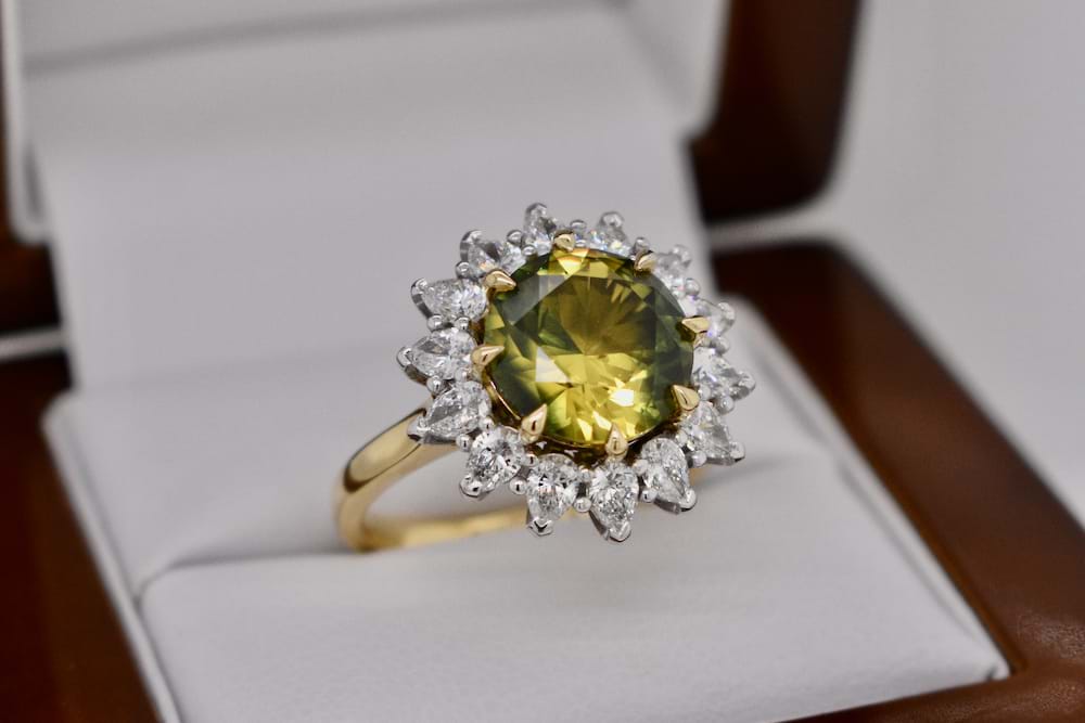 SOLD 18ct Yellow Gold 4.92ct Parti Sapphire & 1.36ct Pearshape Diamond Halo Ring