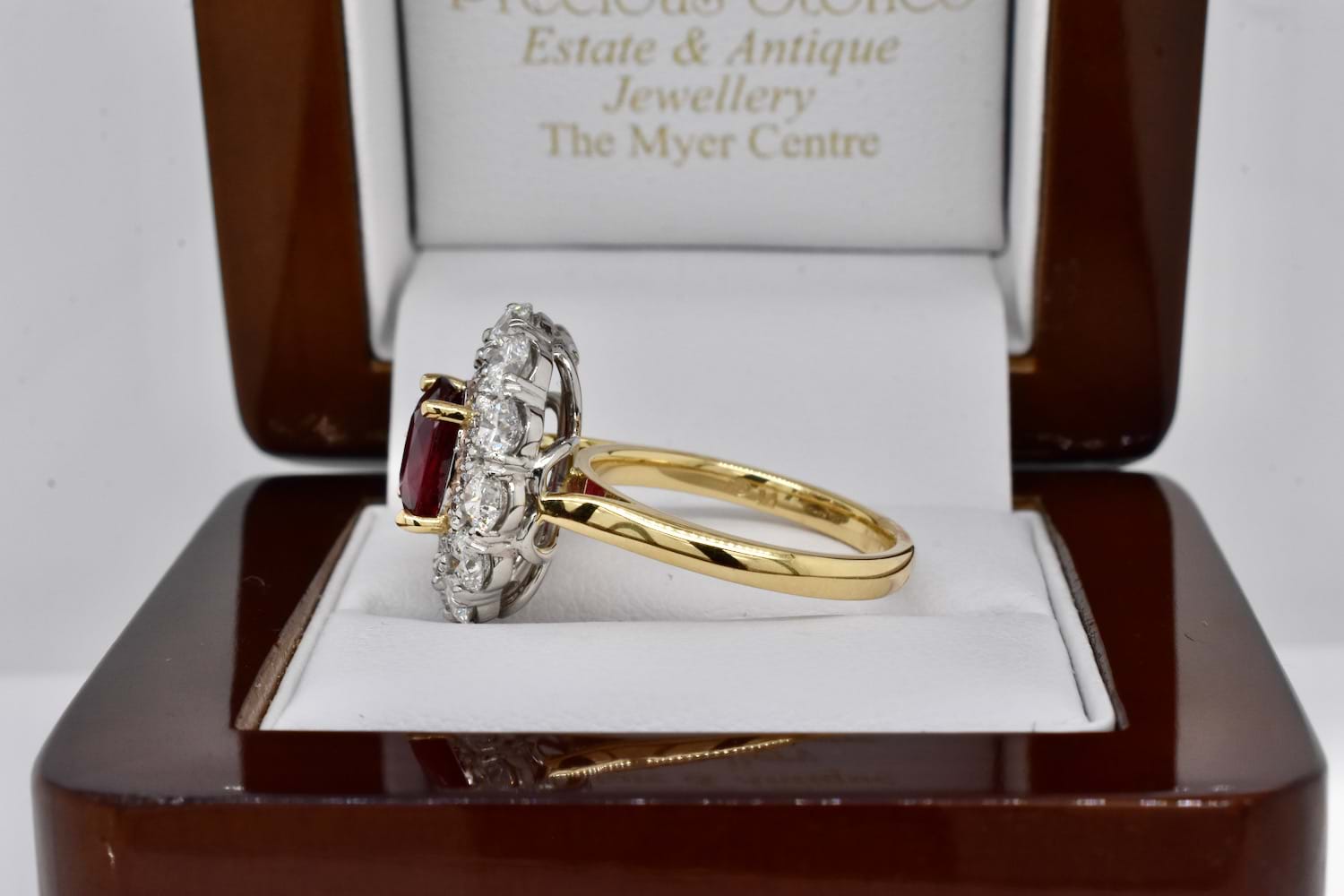 This spectacular bright dark slightly purplish red ruby of 2.13cts is an investment worthy gemstone complete with a GSL certificate stating no heat. Hand selected and sourced in store to be the feature of this lavish and striking bespoke diamond ring, the ruby has been four claw set in 18ct yellow gold with a grain set surround of shimmering round diamonds in 18ct white gold further surrounded by a claw set halo of larger scintillating round brilliant cut diamonds. The 20 diamonds in the inner halo total 0.19cts (D-F/VS-SI) and the 12 outer diamonds total 2.11cts (D-F VS-SI) with a simple and understated heart shape under carriage and an 18ct yellow gold band. Finger size M+ Independent Valuation & GSL Certificate Supplied.